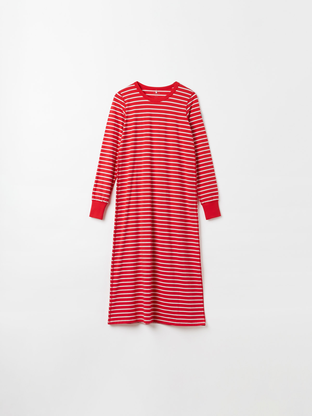 A super-comfy nightgown in soft, organic cotton in adult sizes. The nightgown features our classic stripes and soft, solid color cuffs.