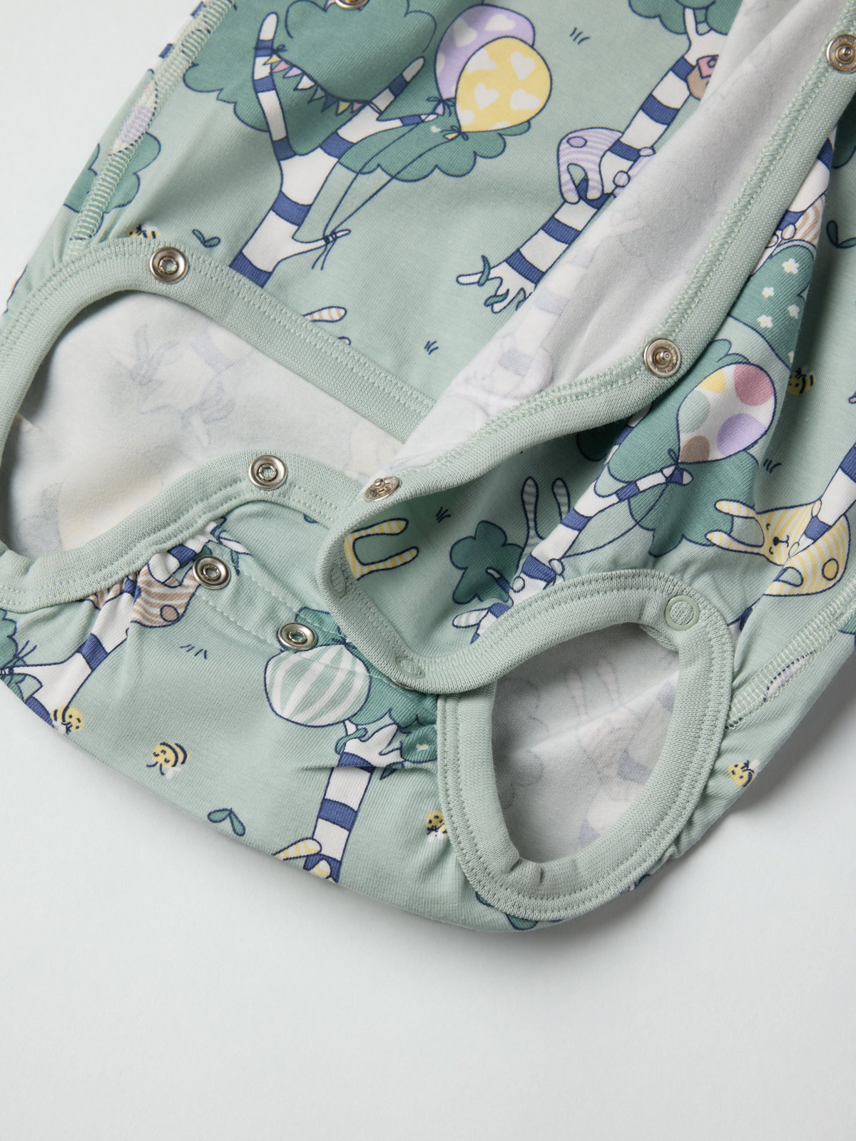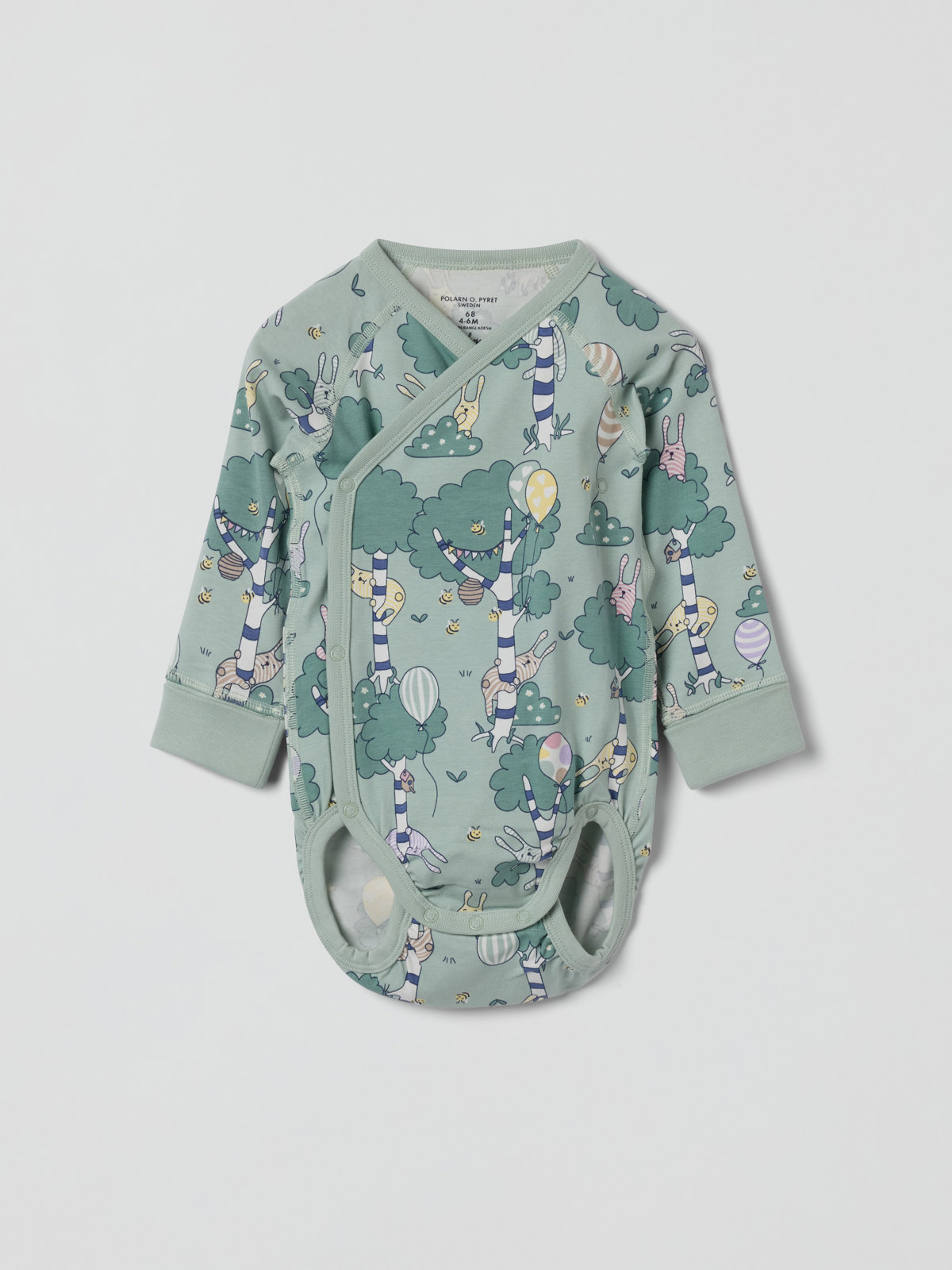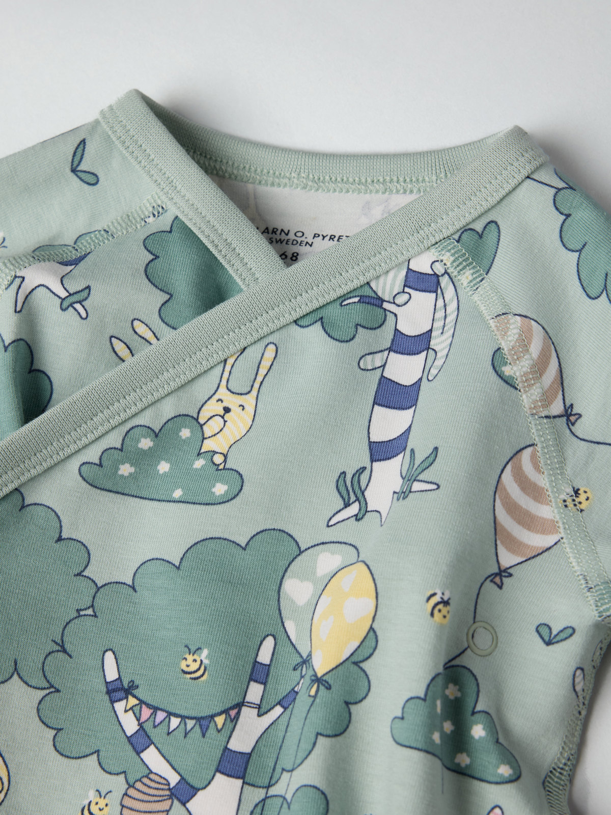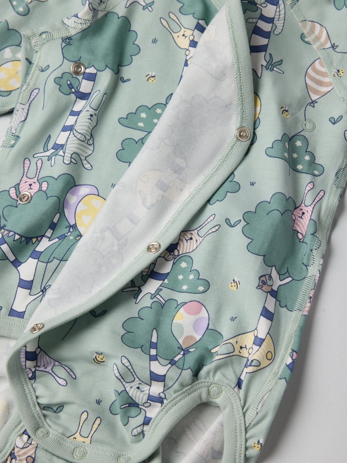 Wrap bodygrow in 100% organic cotton with a delightful forest print. Thanks to the clever solution of an extra row of snaps at the crotch and fold-down cuffs, the bodysuit can grow with your baby!