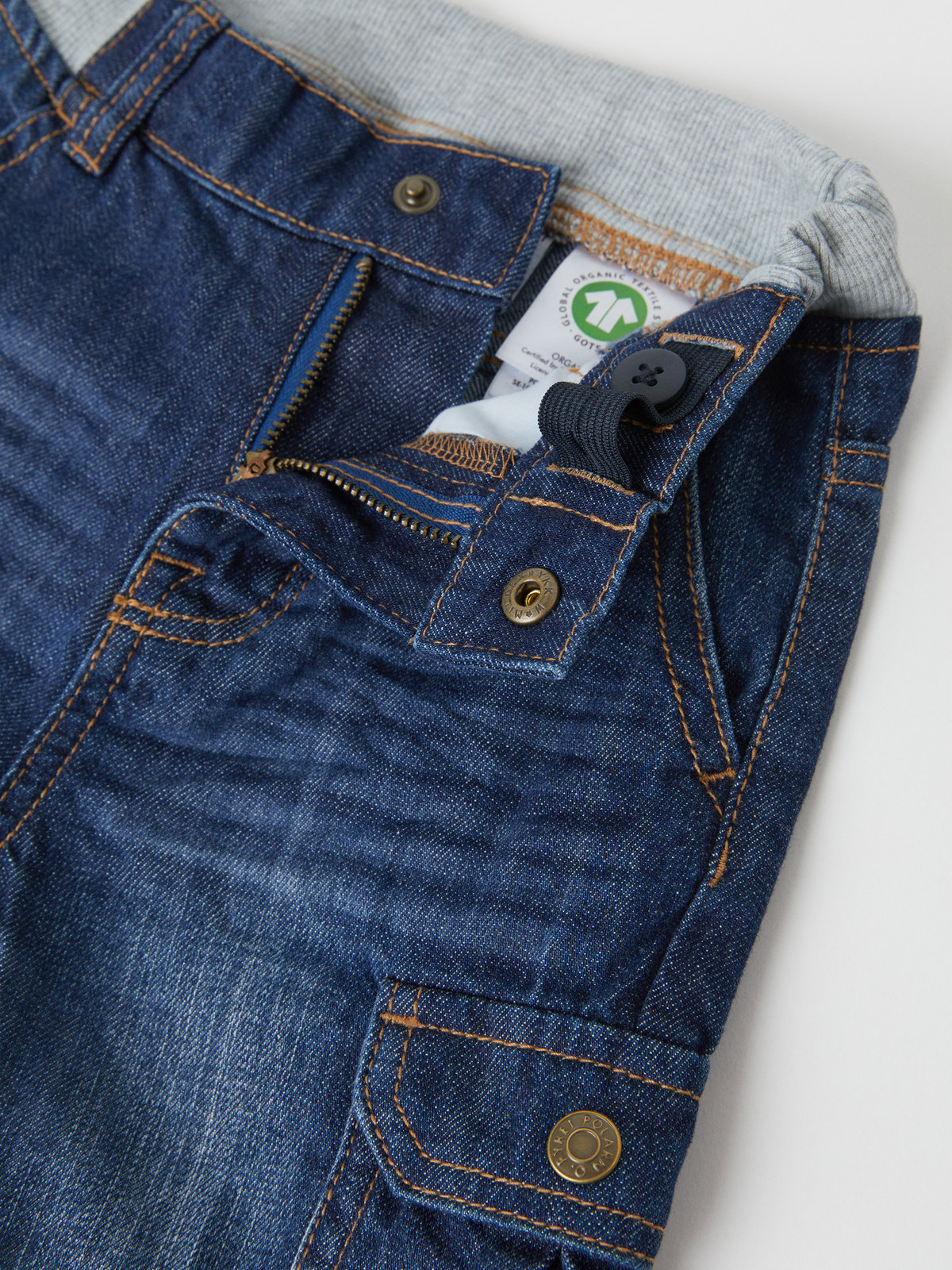 Soft cargo shorts made of 100% organic cotton. They have two front and two back pockets, and two leg pockets with snap closure. The waist is adjusted with buttonhole elastic. The shorts also have pre-shaped knees to allow for a better fit. The fly closes with a zipper and snap. Size 86-92 has a soft, ribbed waistband.