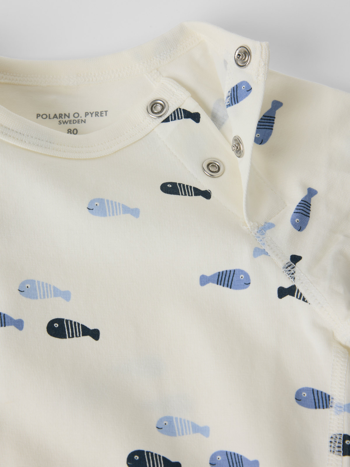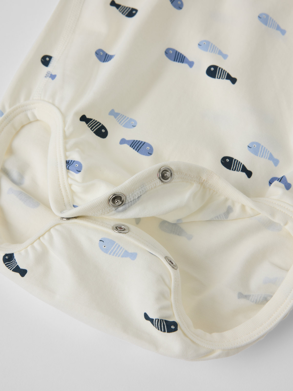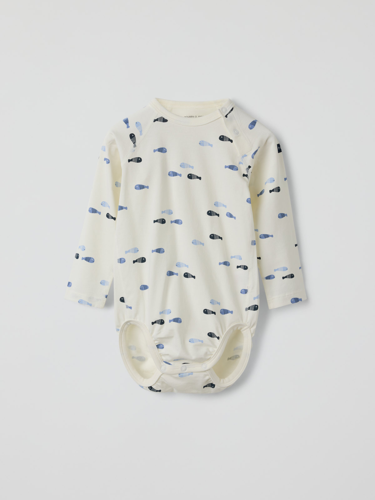 Soft organic cotton bodysuit, crafted with extra gentle seams for sensitive skin. This bodysuit pairs perfectly with the entire collection. Popper fastenings at one shoulder and between the legs make changing easy.