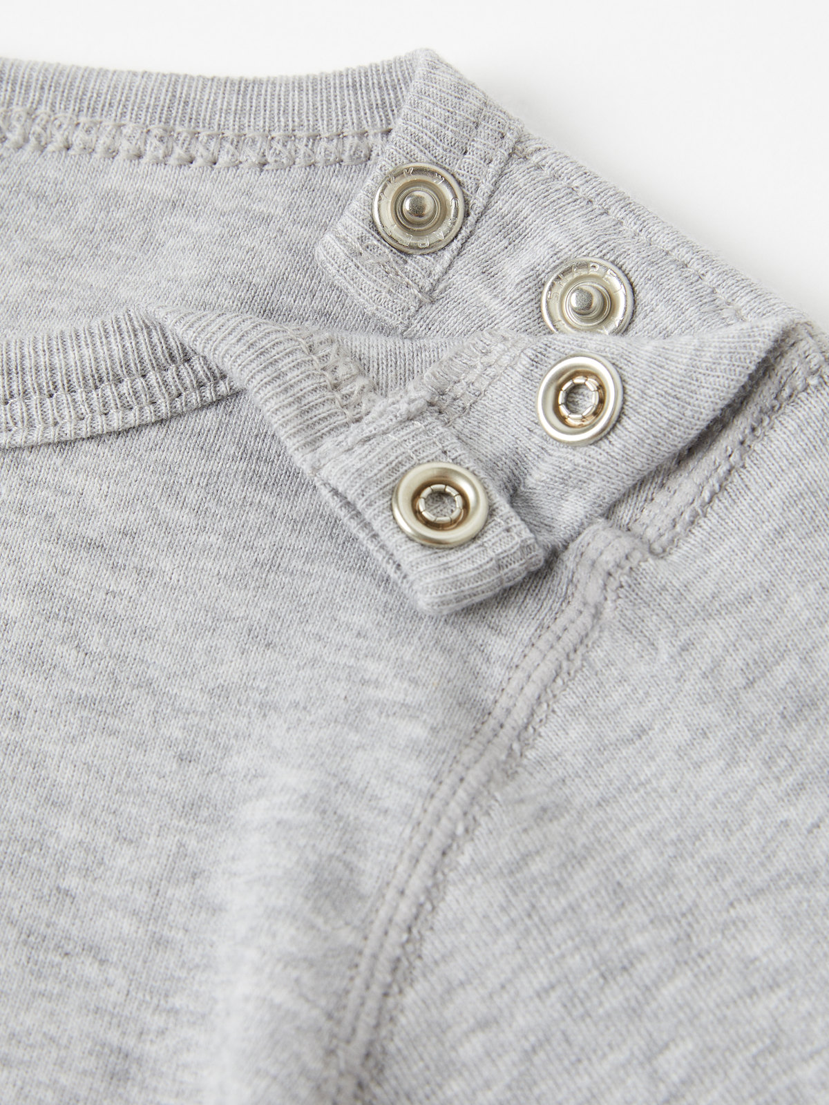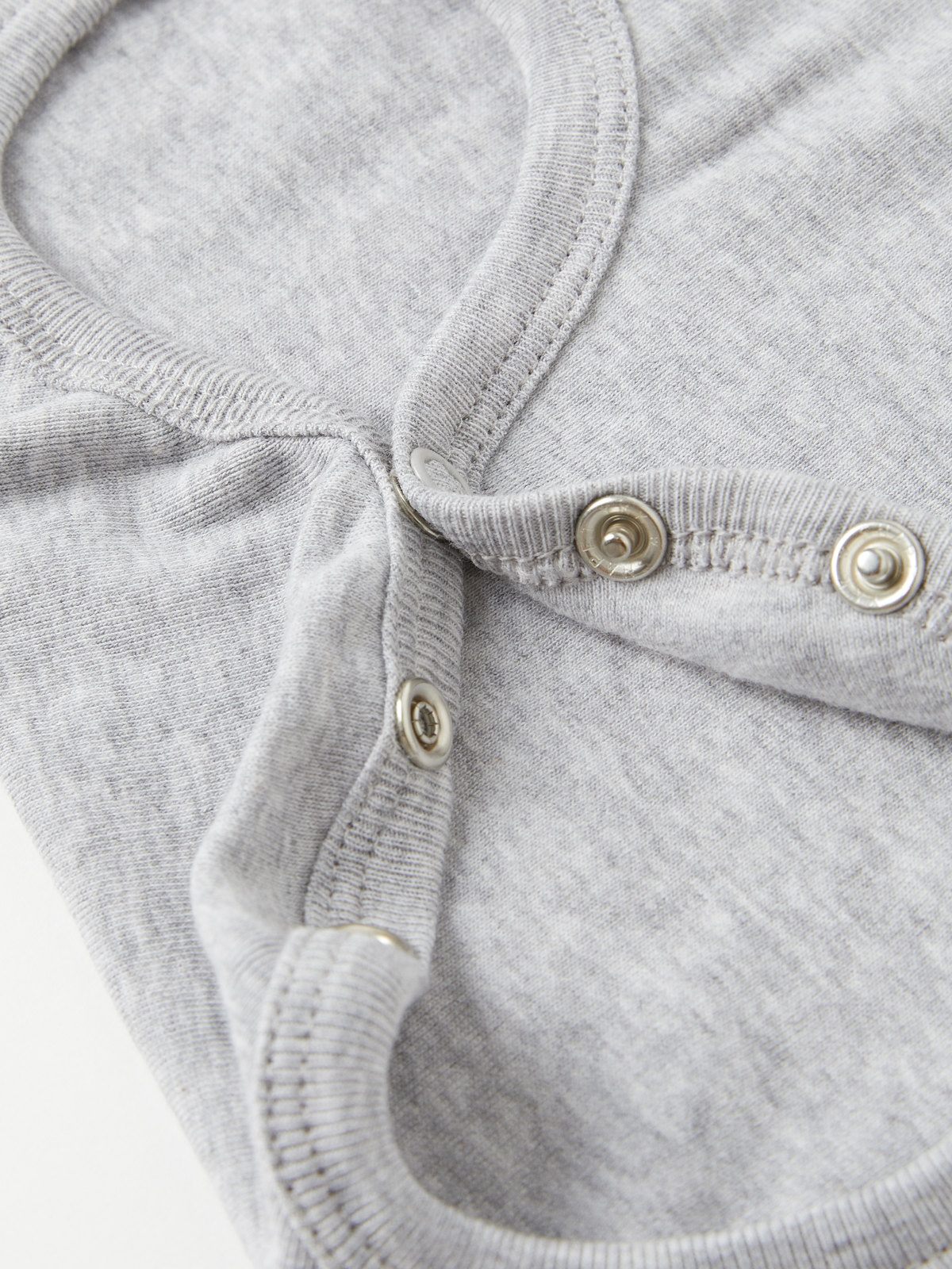 A solid color bodysuit in 100% organic cotton for the littlest one. The bodysuit features soft, elastic cuffs, and snaps on the shoulder and at the crotch to facilitate dressing.