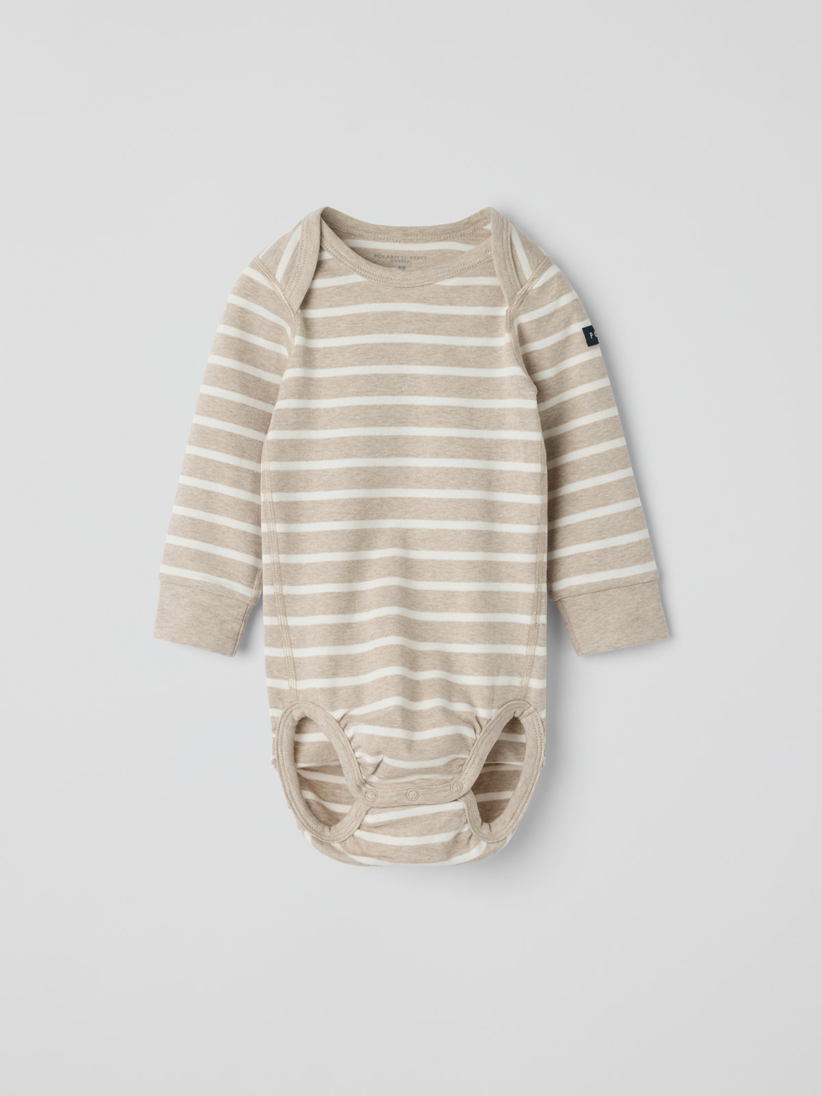 Our classic striped babygrow in 100% soft organic cotton – a loved wardrobe essential for every baby's first wardrobe! This babygrow has overlapping shoulders, making it easy to pull over your little one's head. It also features soft cuffs at the sleeves.