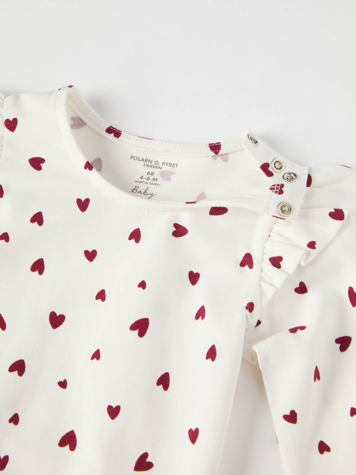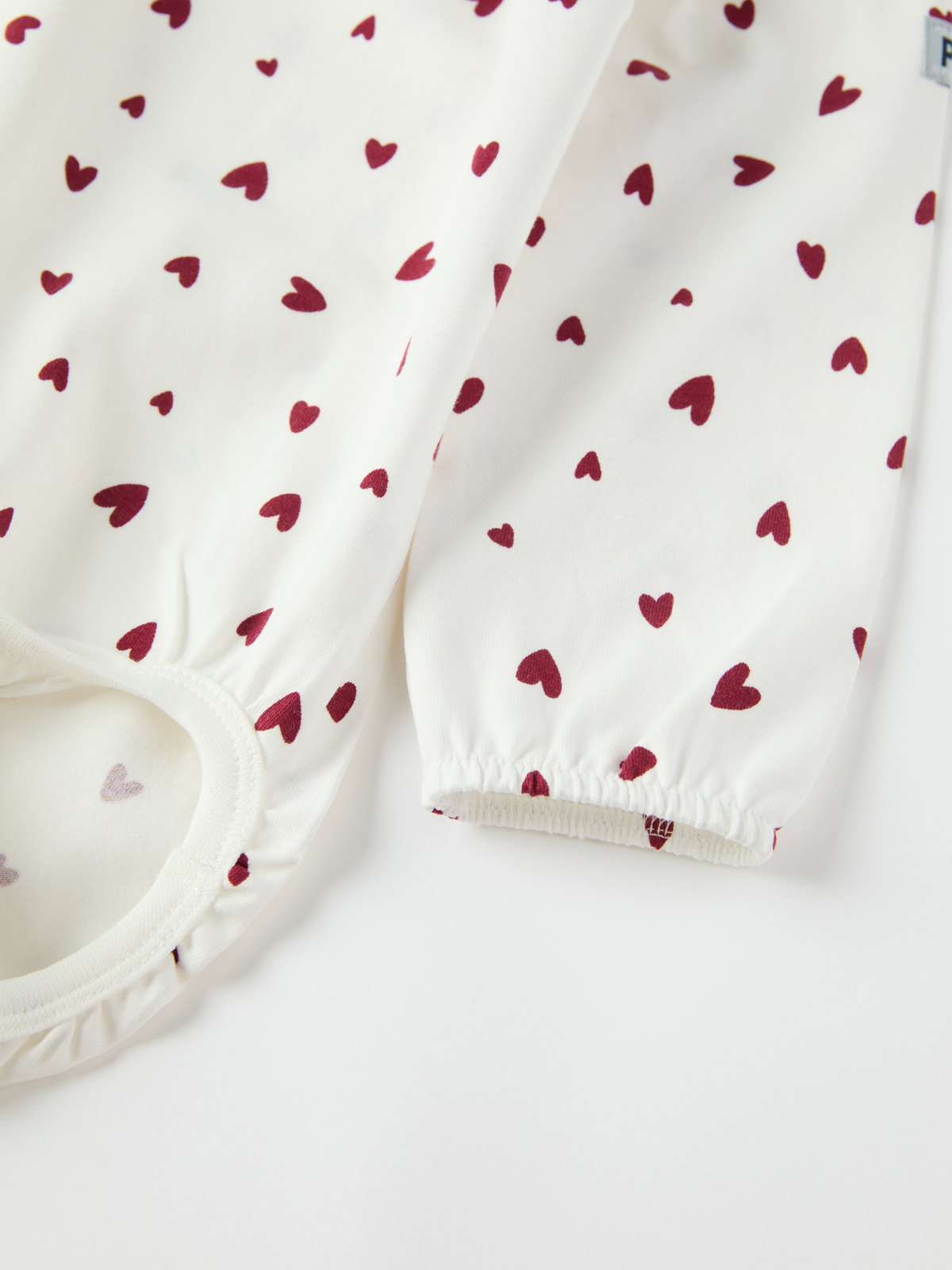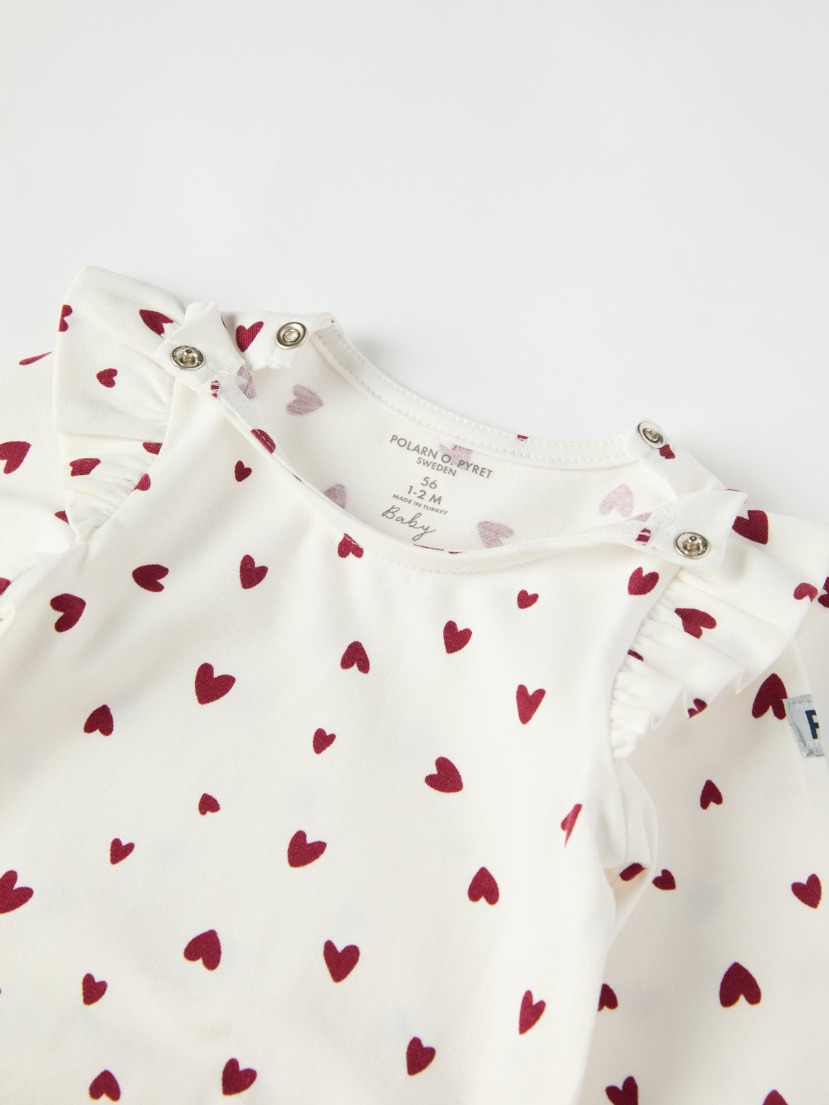 Bodysuit in soft, organic cotton with an allover small heart print. The bodysuit features fancy ruffles at the front that continue over the shoulders, and elastic cuffs.