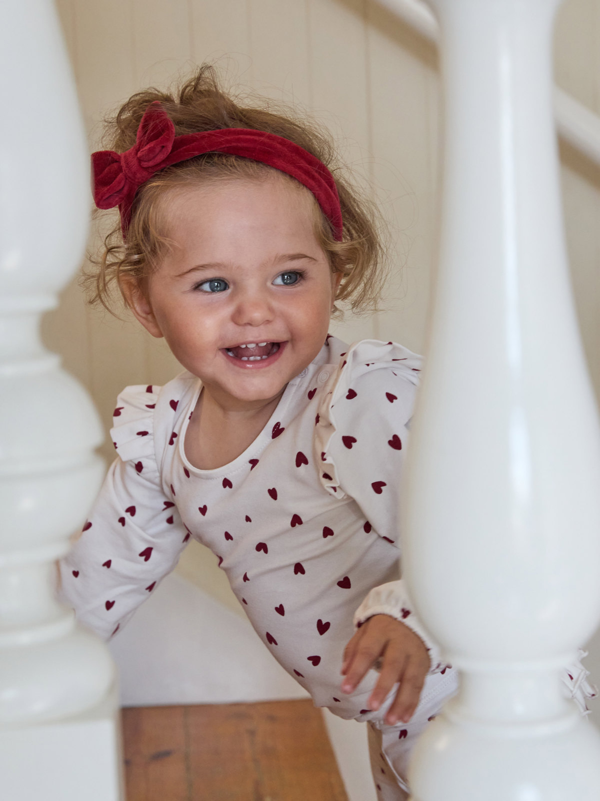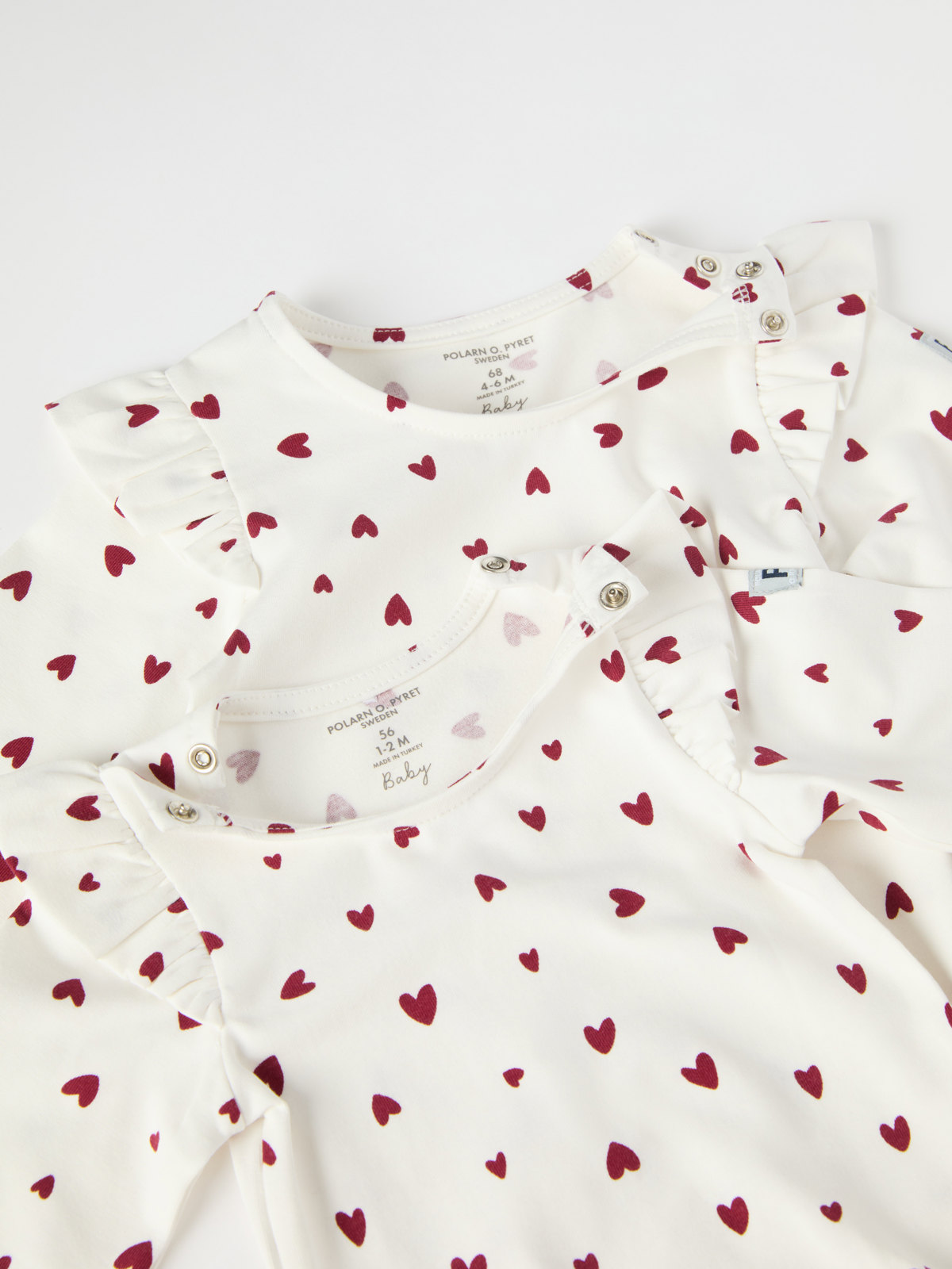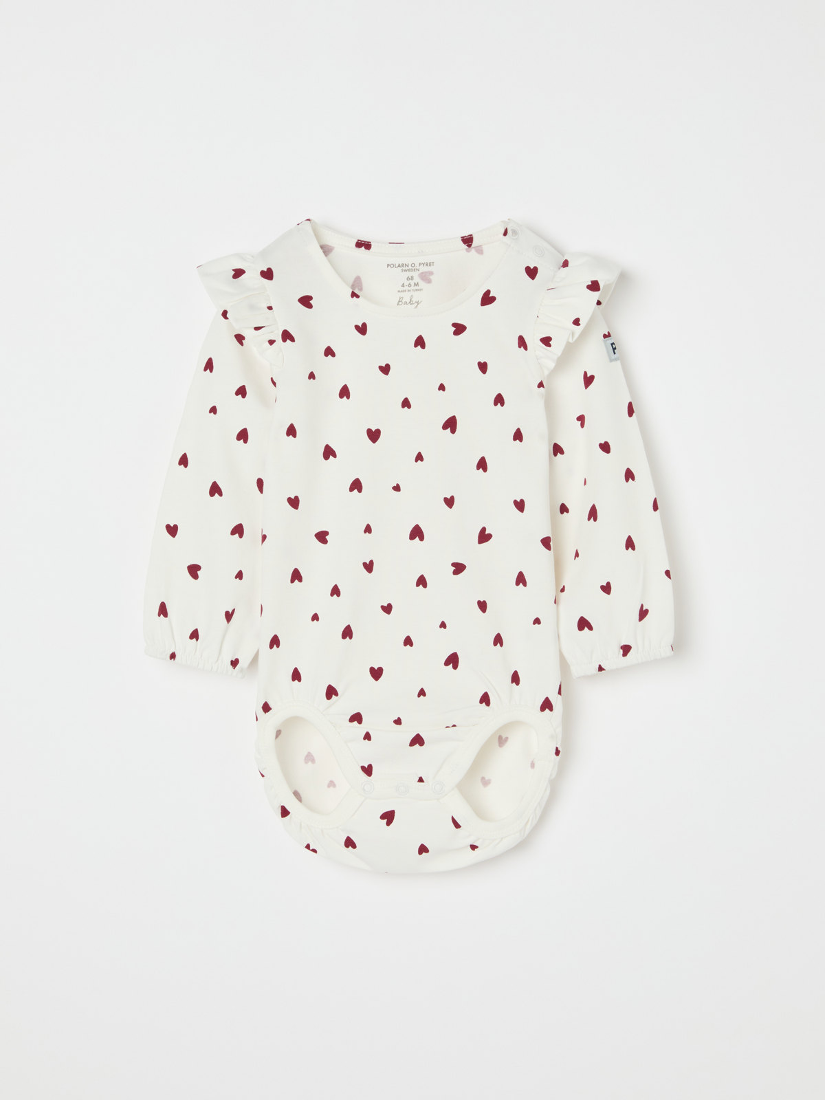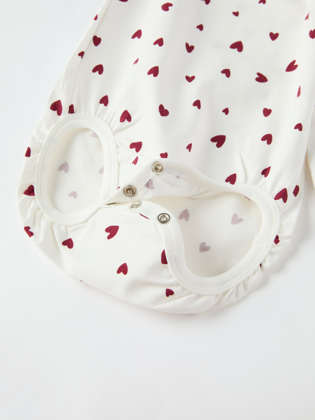 Bodysuit in soft, organic cotton with an allover small heart print. The bodysuit features fancy ruffles at the front that continue over the shoulders, and elastic cuffs.