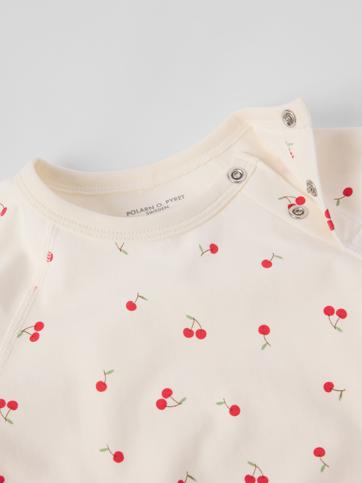 Poppers at one shoulder make changing easy.