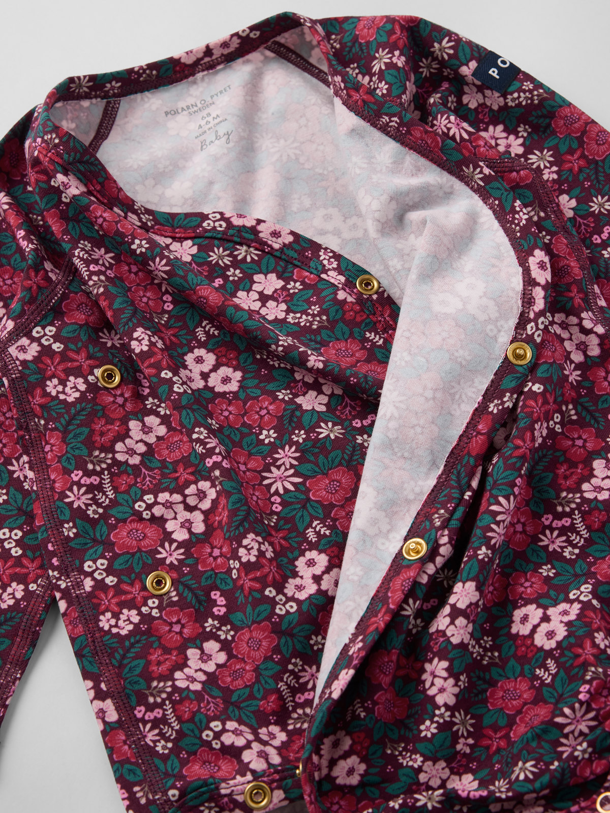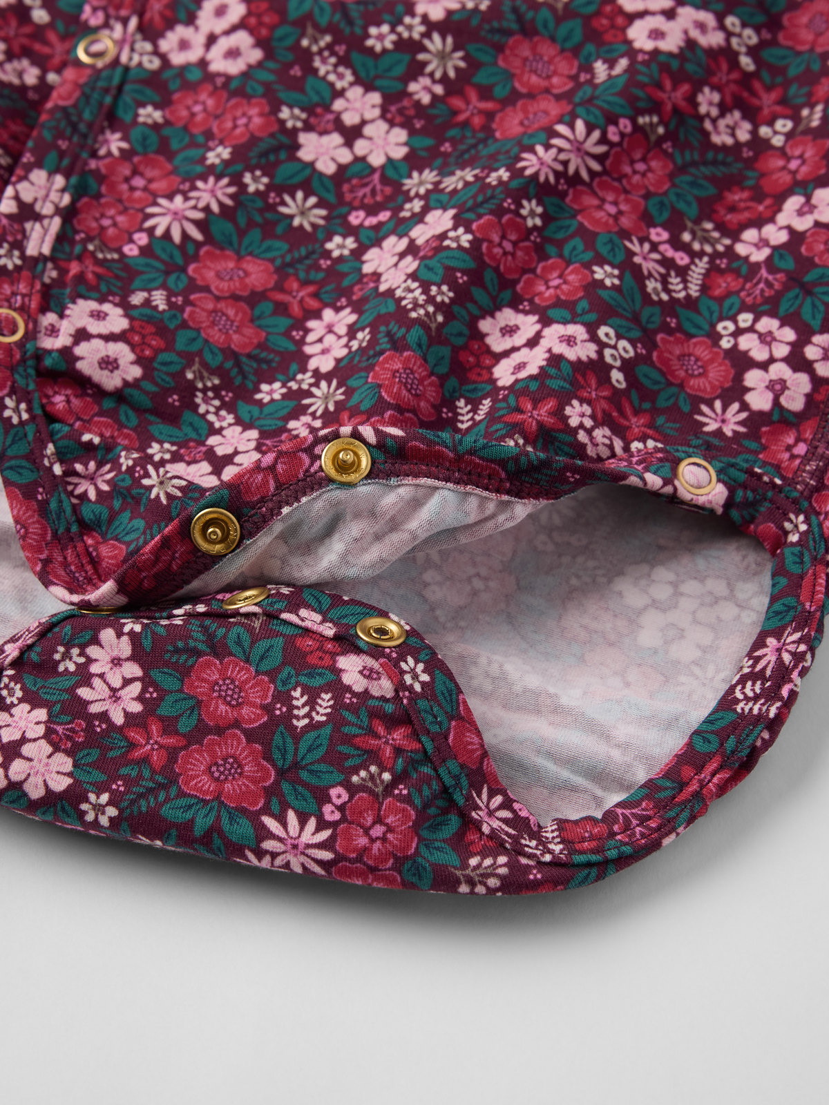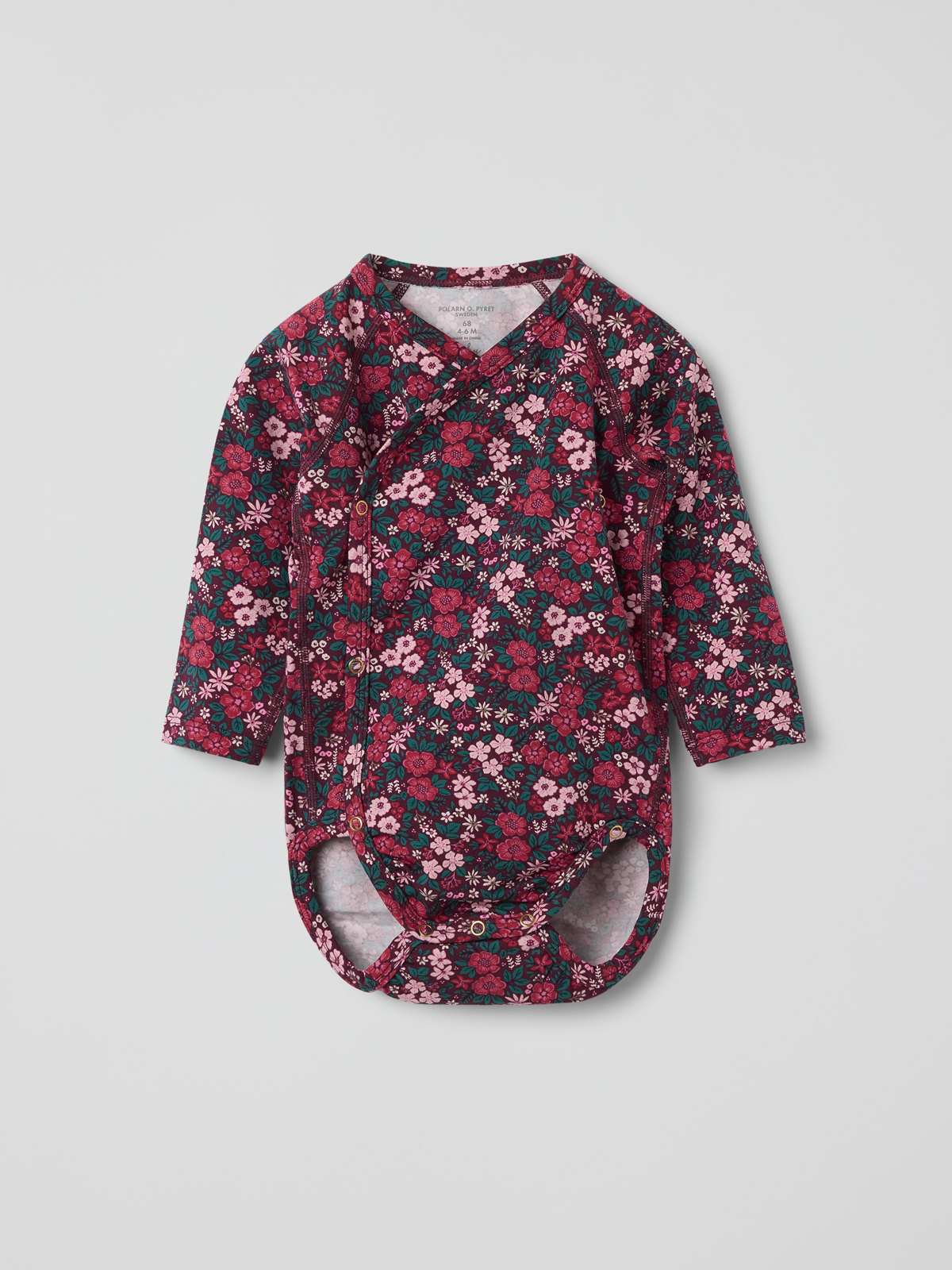 Wraparound babygrow in 100% organic cotton. Thanks to the clever solution featuring an extra row of snaps at the crotch and fold-down cuffs, this babygrow can grow with your little one.