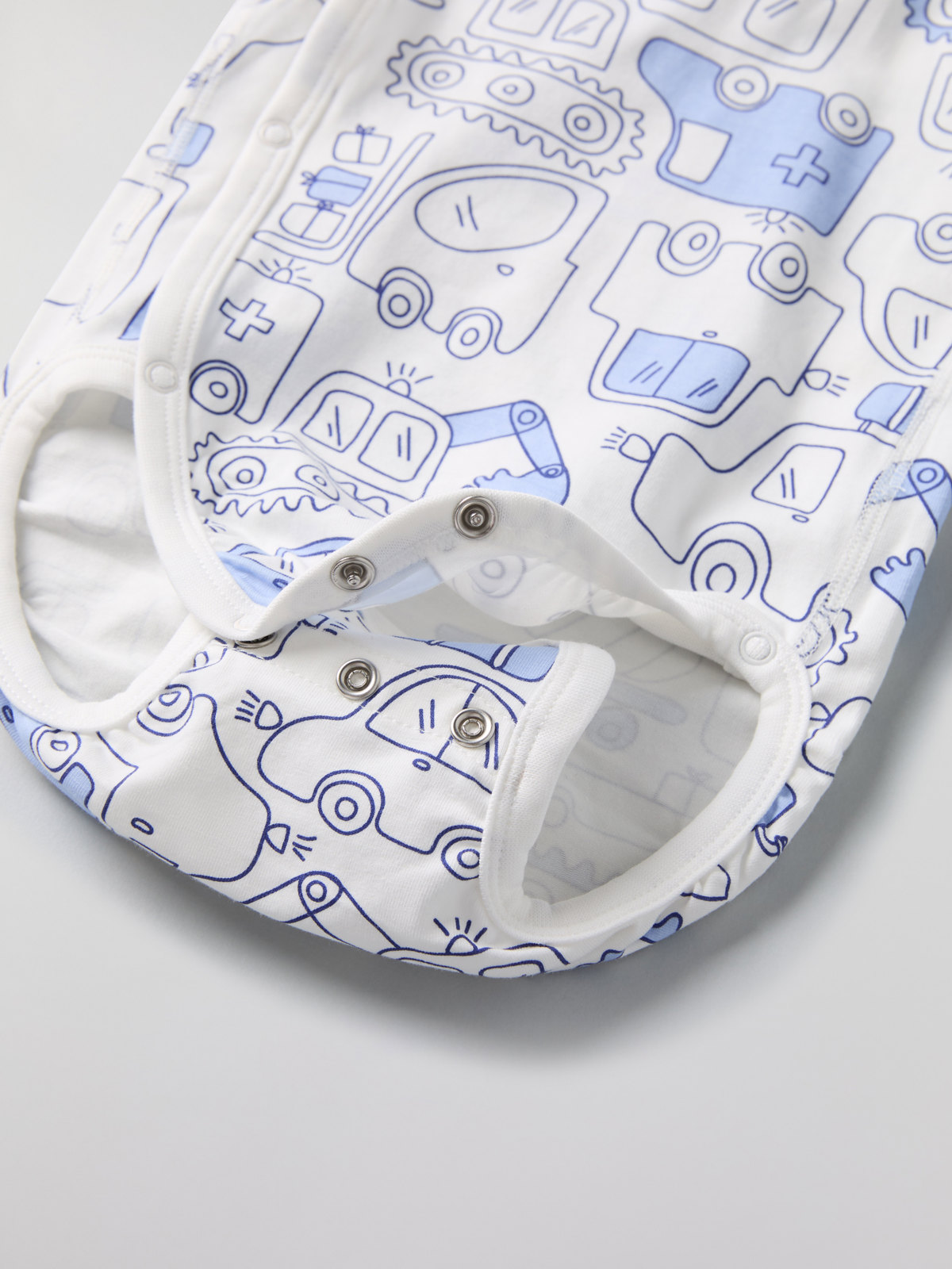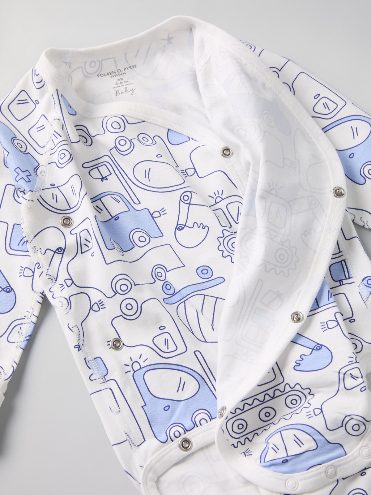 Wraparound babygrow in 100% organic cotton. Thanks to the clever solution of an extra row of snaps at the crotch and fold-down cuffs, the bodysuit can grow with your baby!