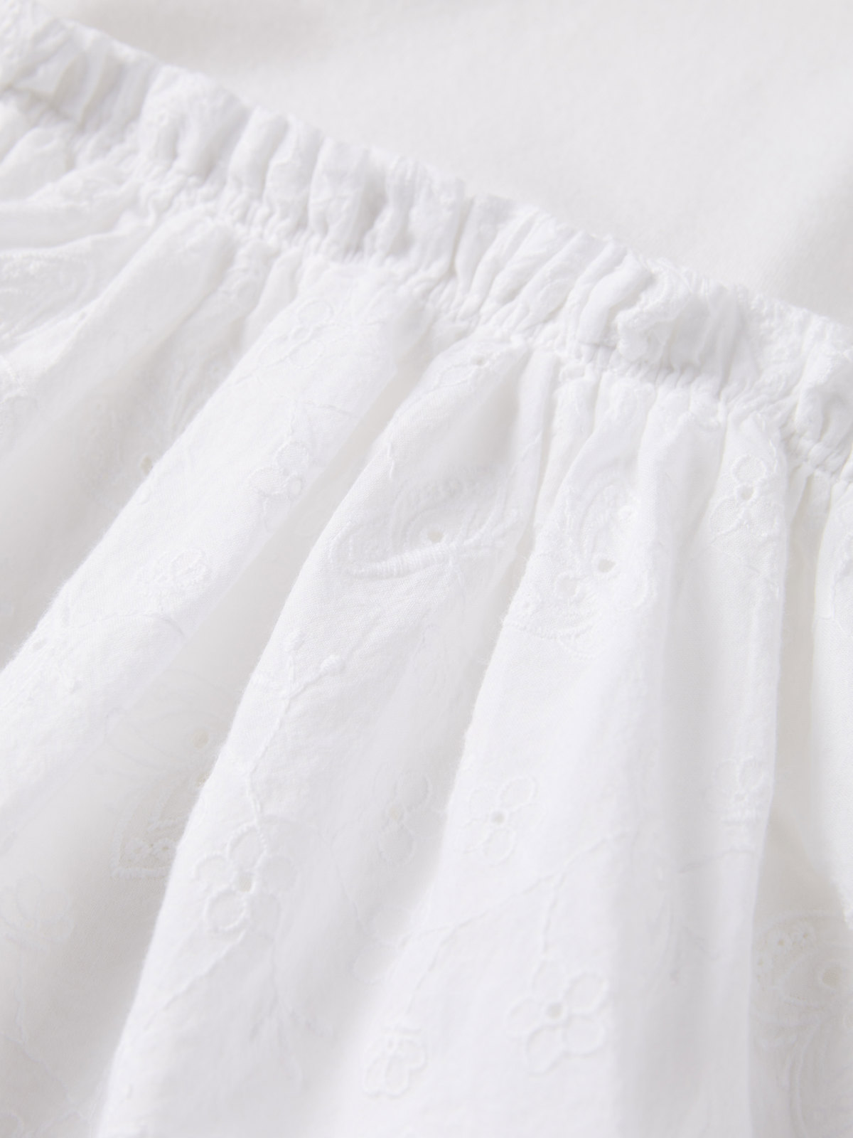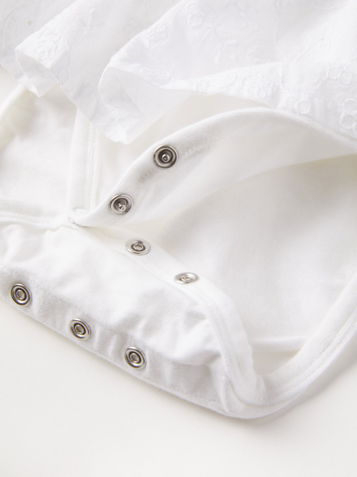 The bodysuit features lovely embroidery, and concealed snaps at the shoulder and crotch to facilitate dressing.