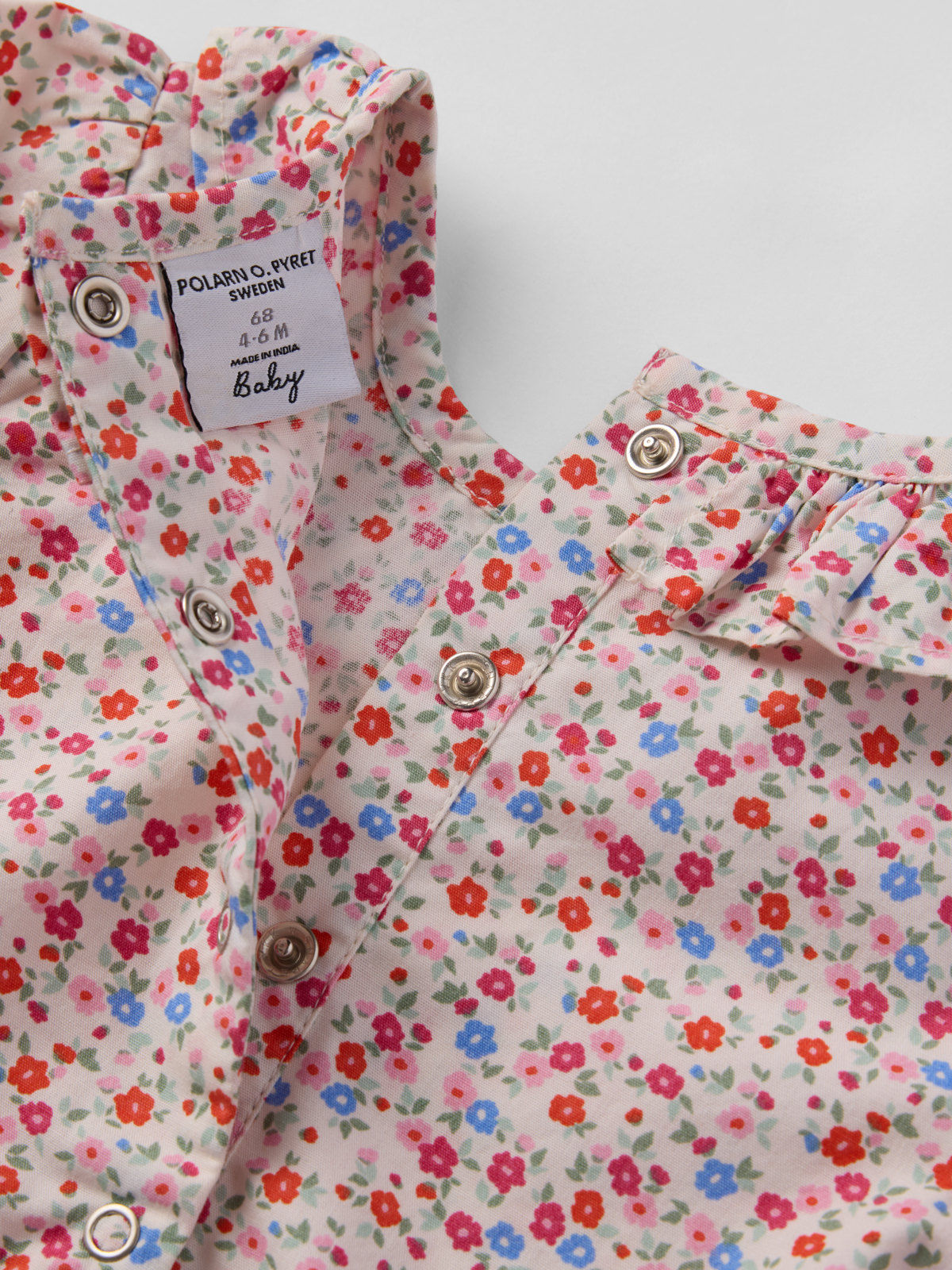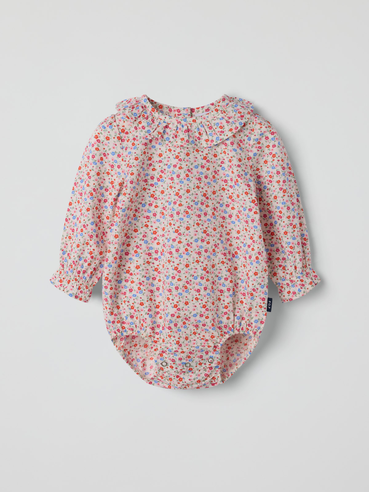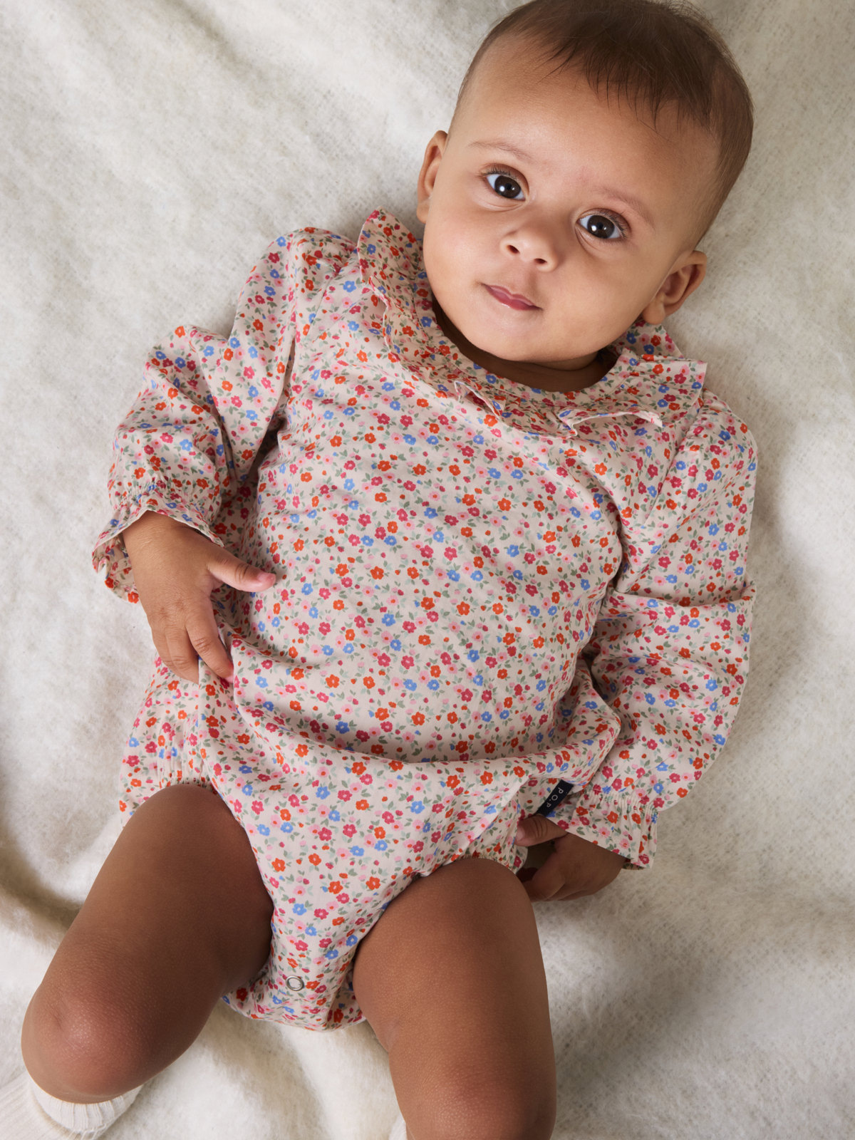 Soft muslin bodysuit made from 100% organic cotton. Features charming frills at the neckline and sleeve ends. Easy nappy changes with practical crotch buttons. Perfect for sibling matching!