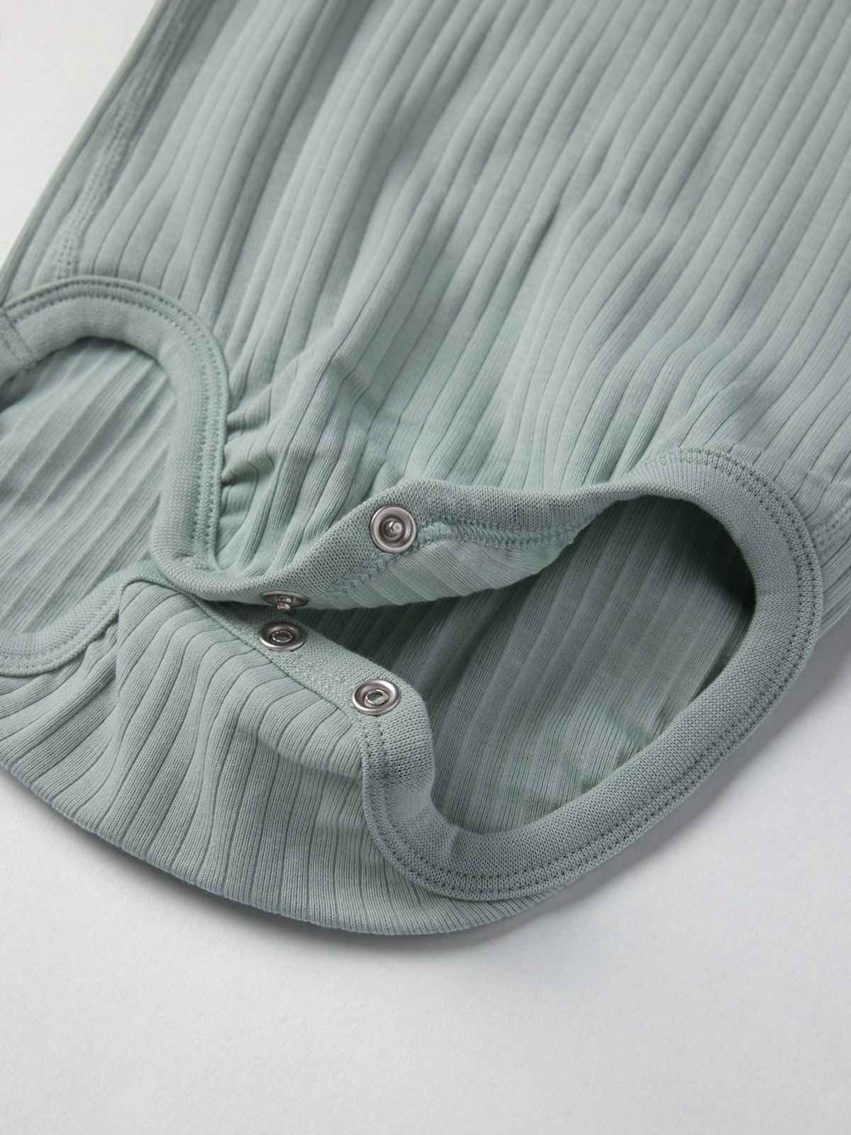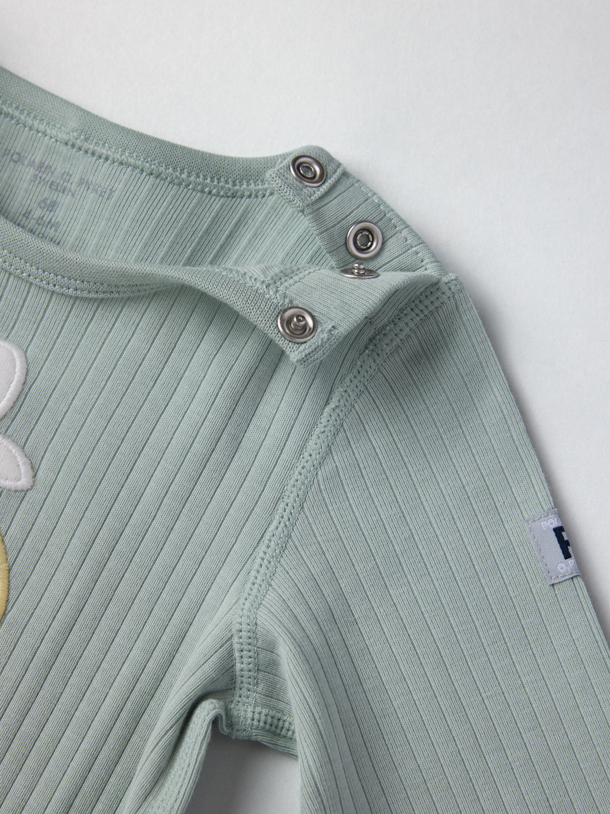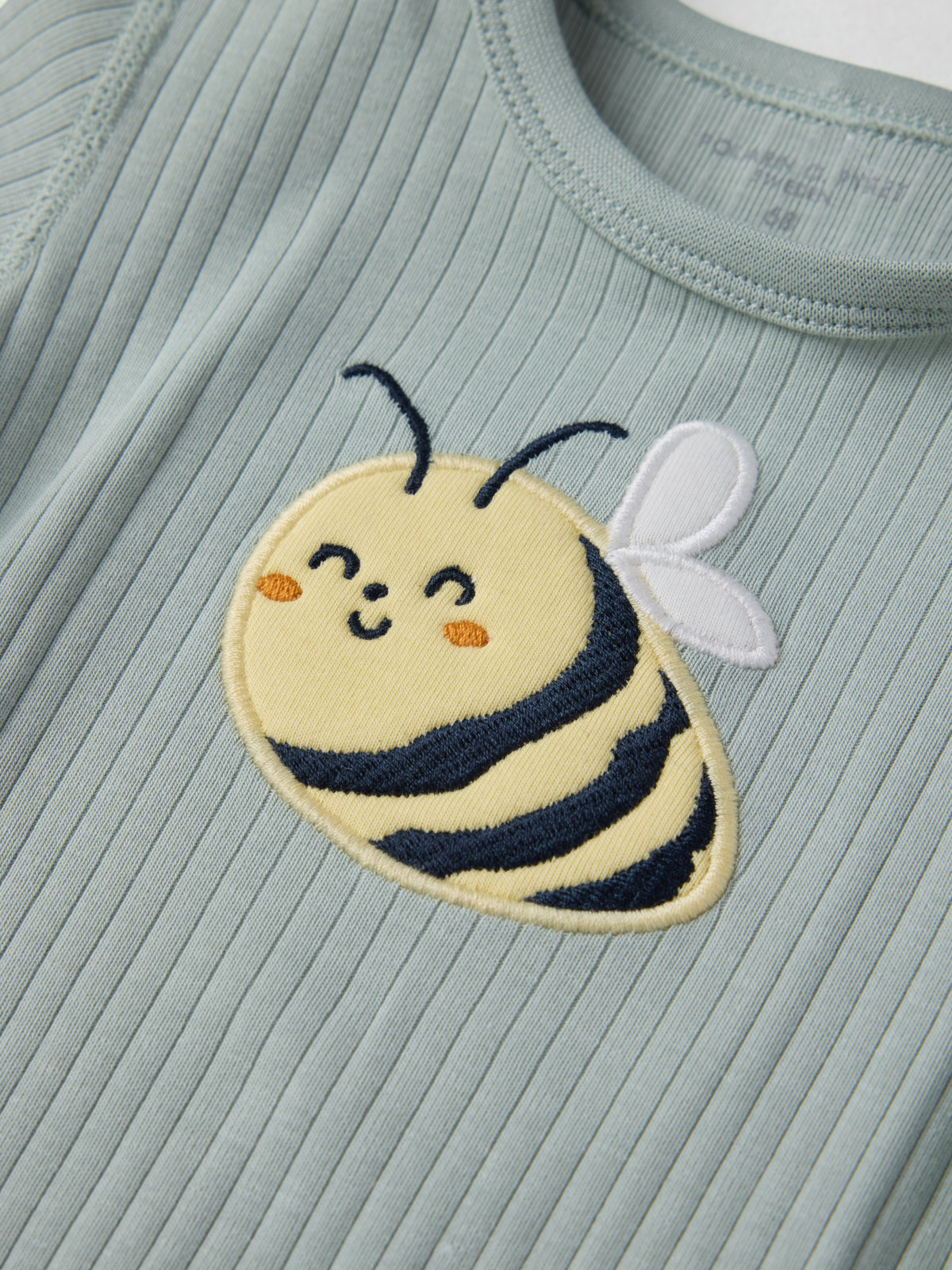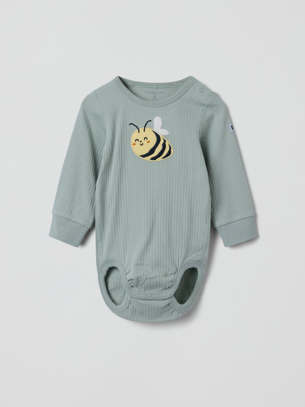 Ribbed bodysuit for baby in soft, organic cotton. The bodysuit features a bee appliqué on the chest, and extra-soft, flatlock seams that are gentle on sensitive skin.