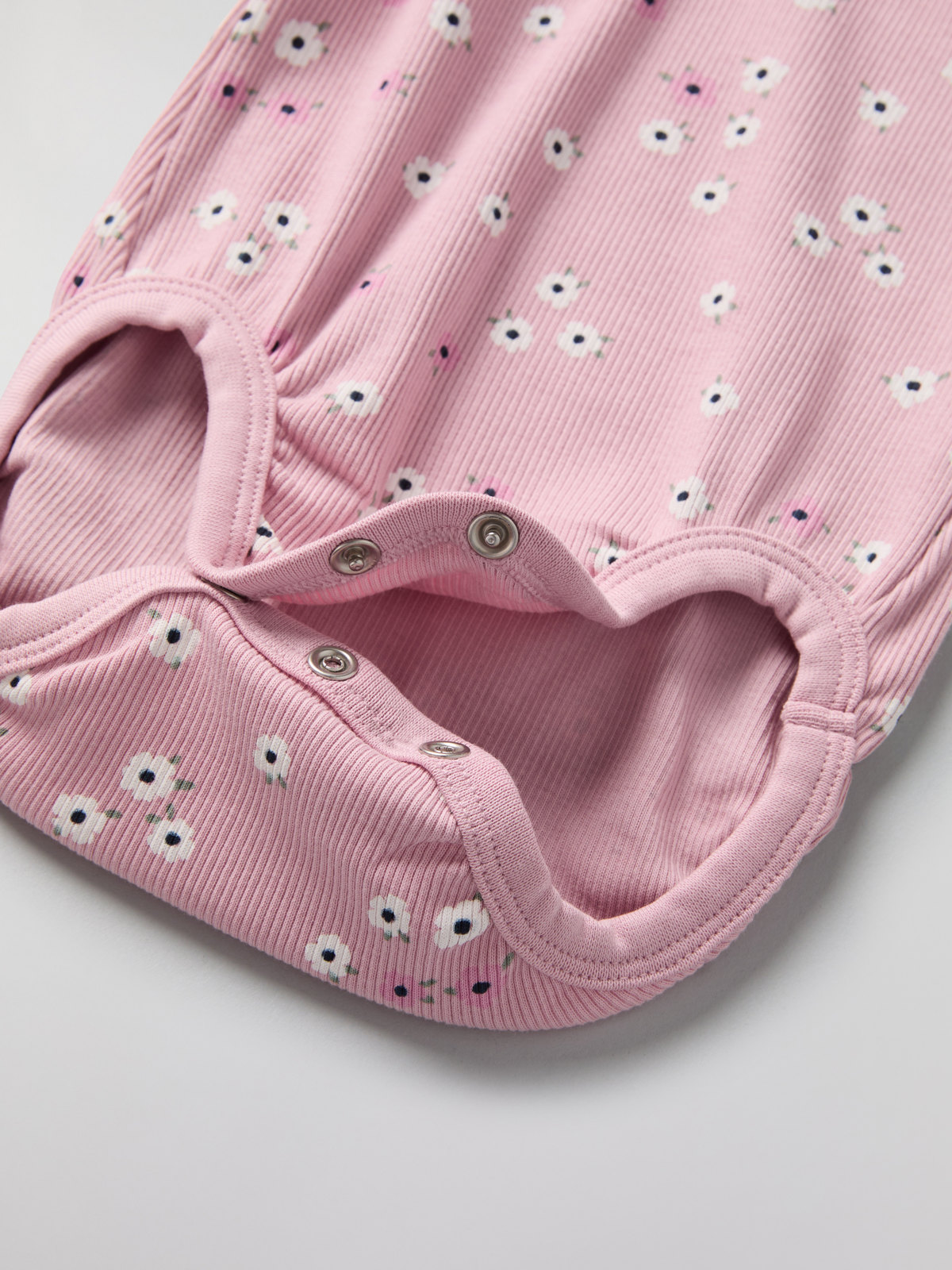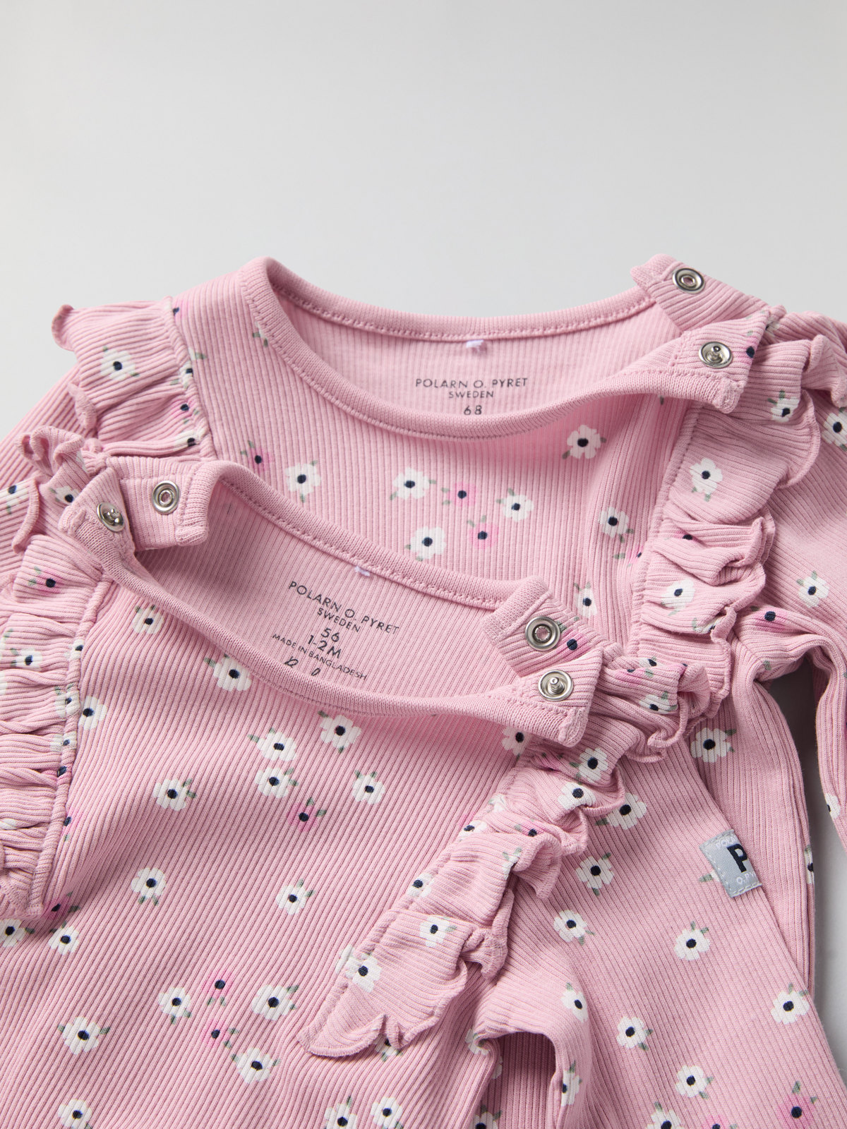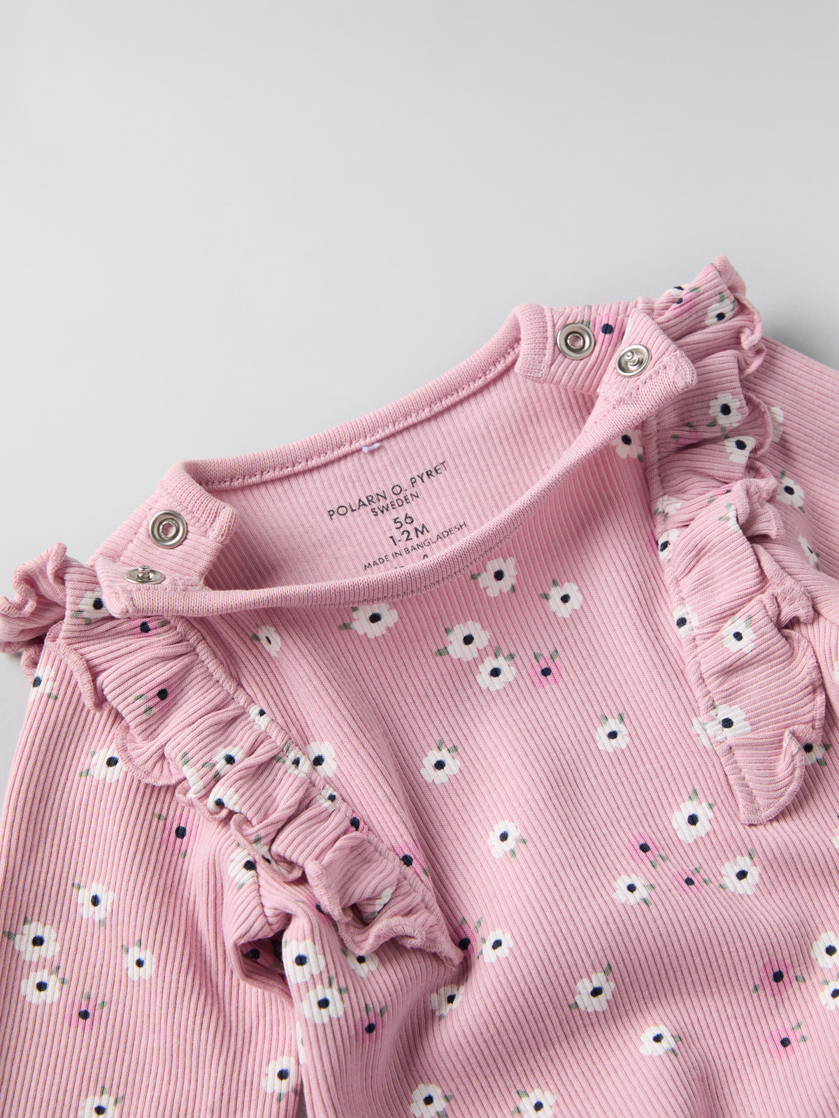 Ribbed jersey bodysuit in soft, organic cotton for baby. The bodysuit has a beautiful floral print and ruffles over the shoulders, which continue down the back.