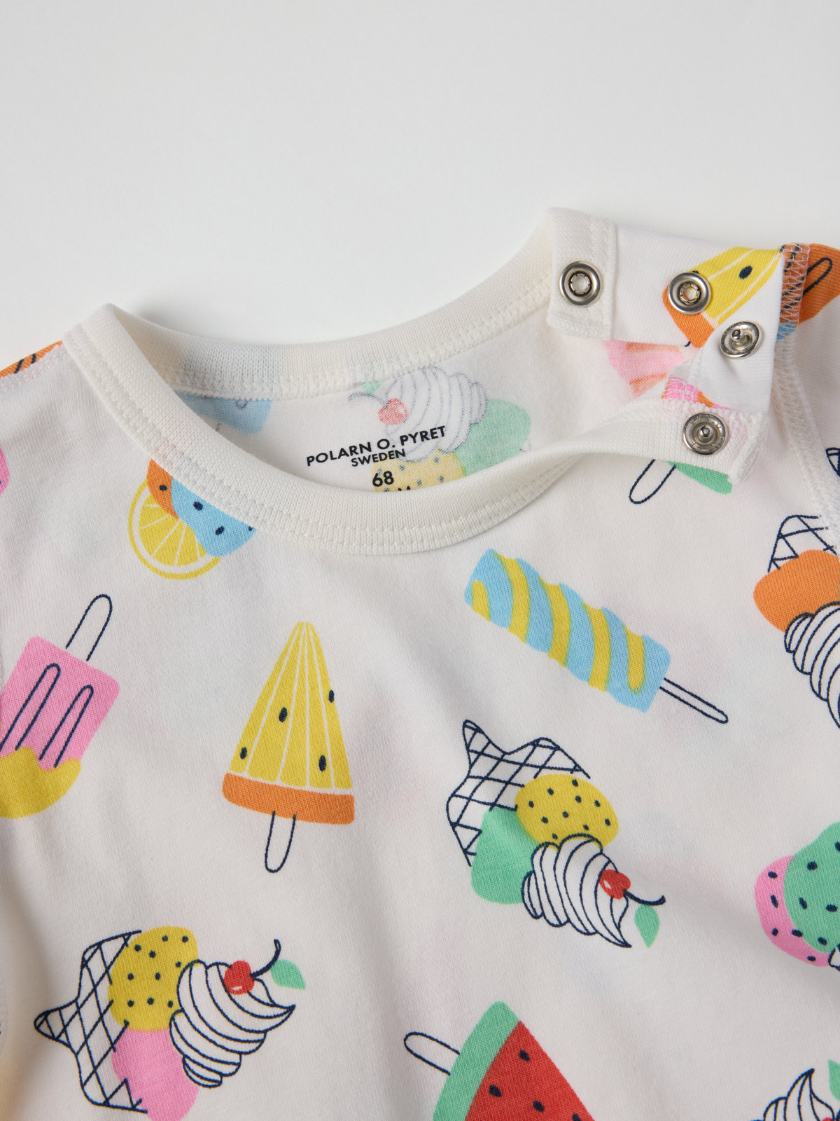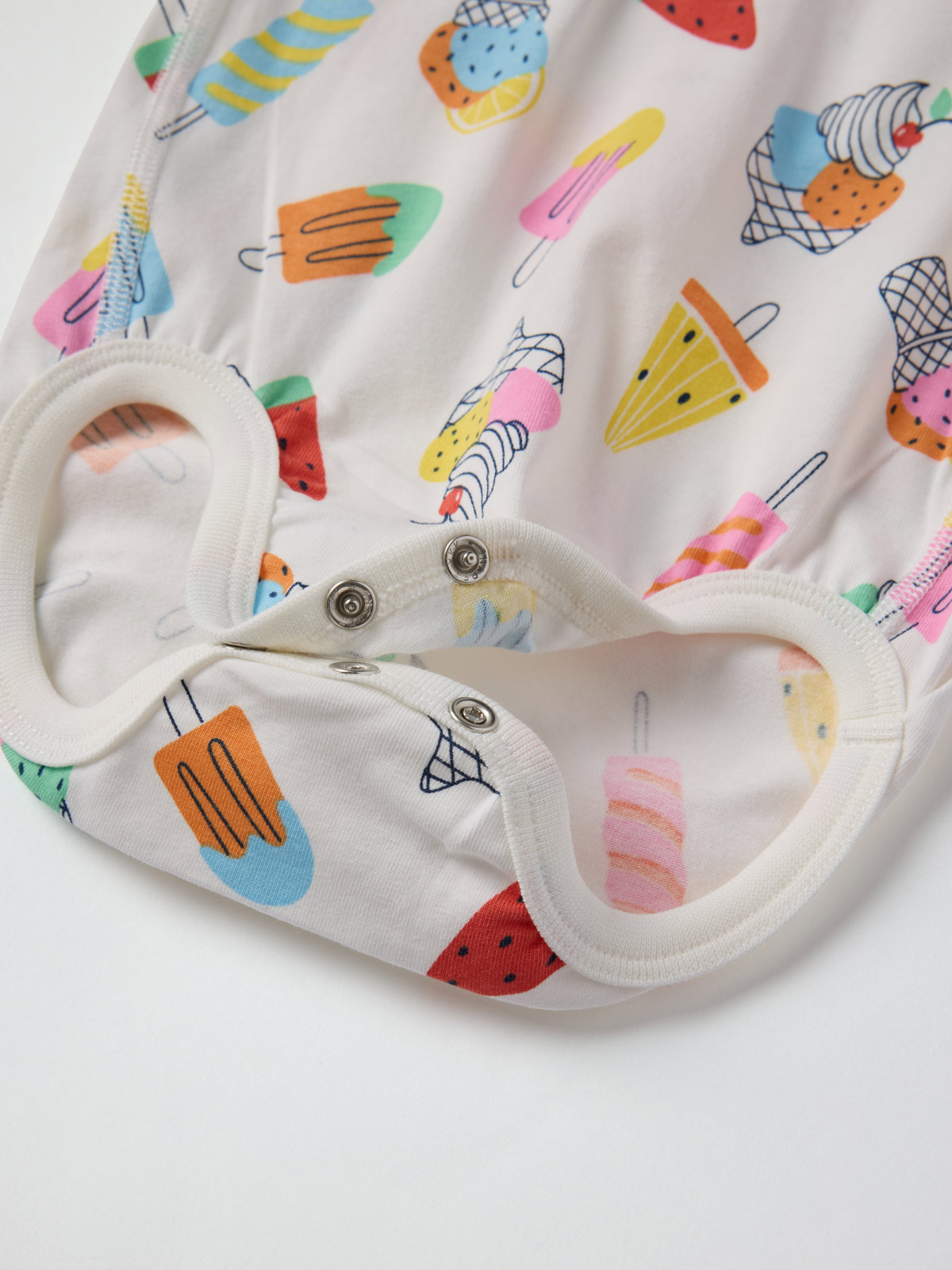 Short-sleeved bodysuit in soft organic cotton, with extra soft, flatlock seams that are gentle on sensitive skin. The bodysuit features an allover ice-cream print – a go-to summer favorite! Snaps at the crotch and one shoulder make dressing easy.