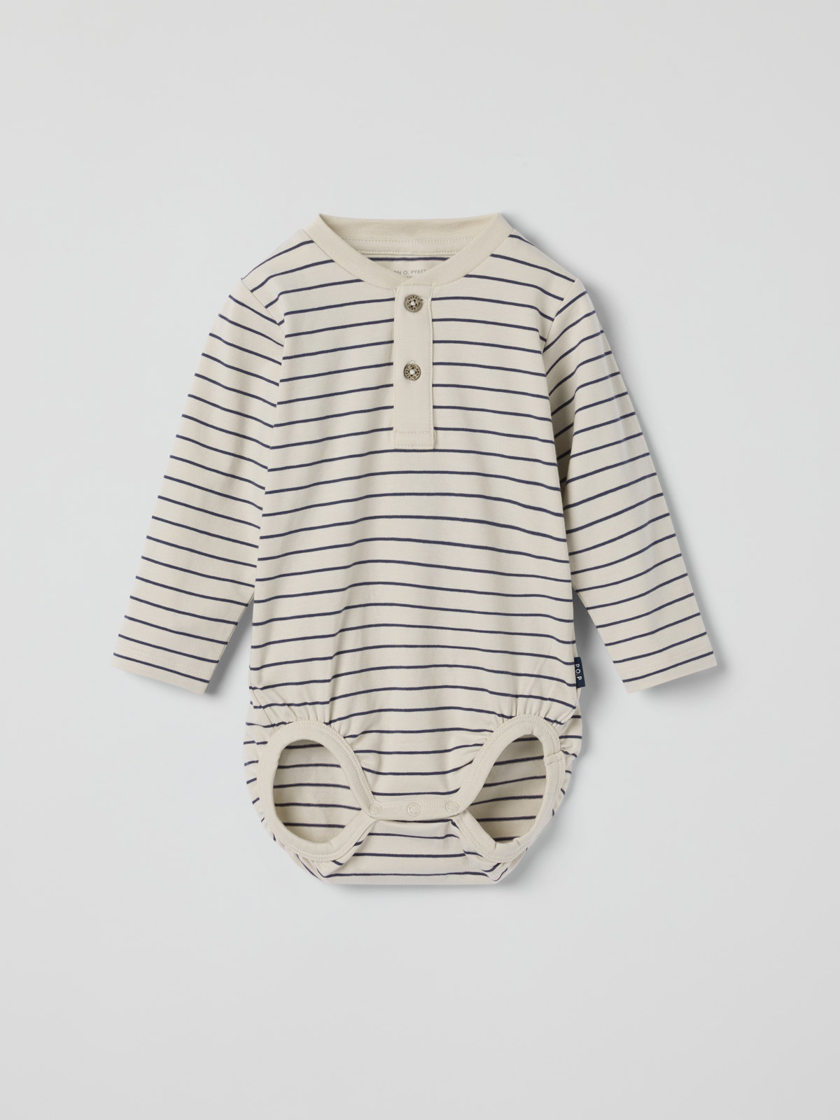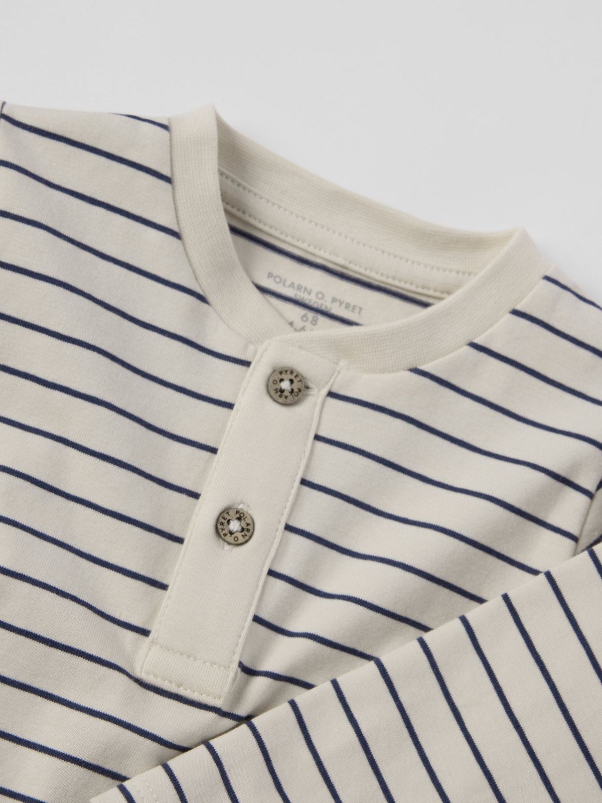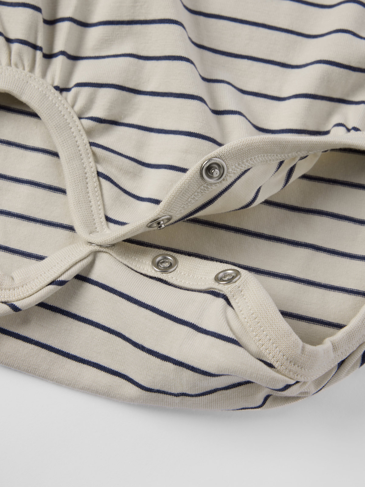 Soft jersey bodysuit in organic cotton – a lightweight, comfy everyday favourite! The bodysuit fastens with a short button placket at the front. Popper fastenings at the crotch make nappy changes easy. Perfect for matching with siblings!