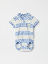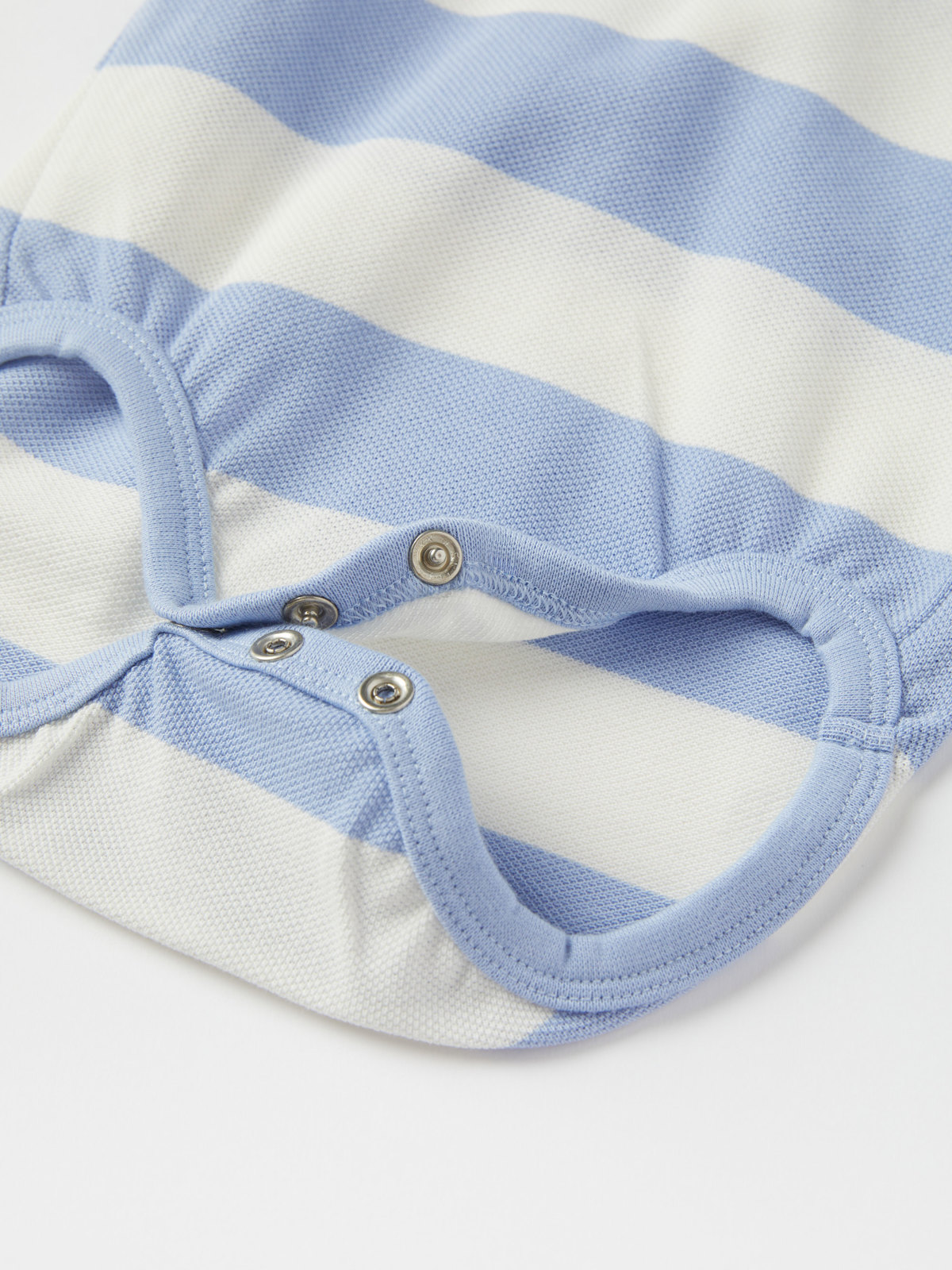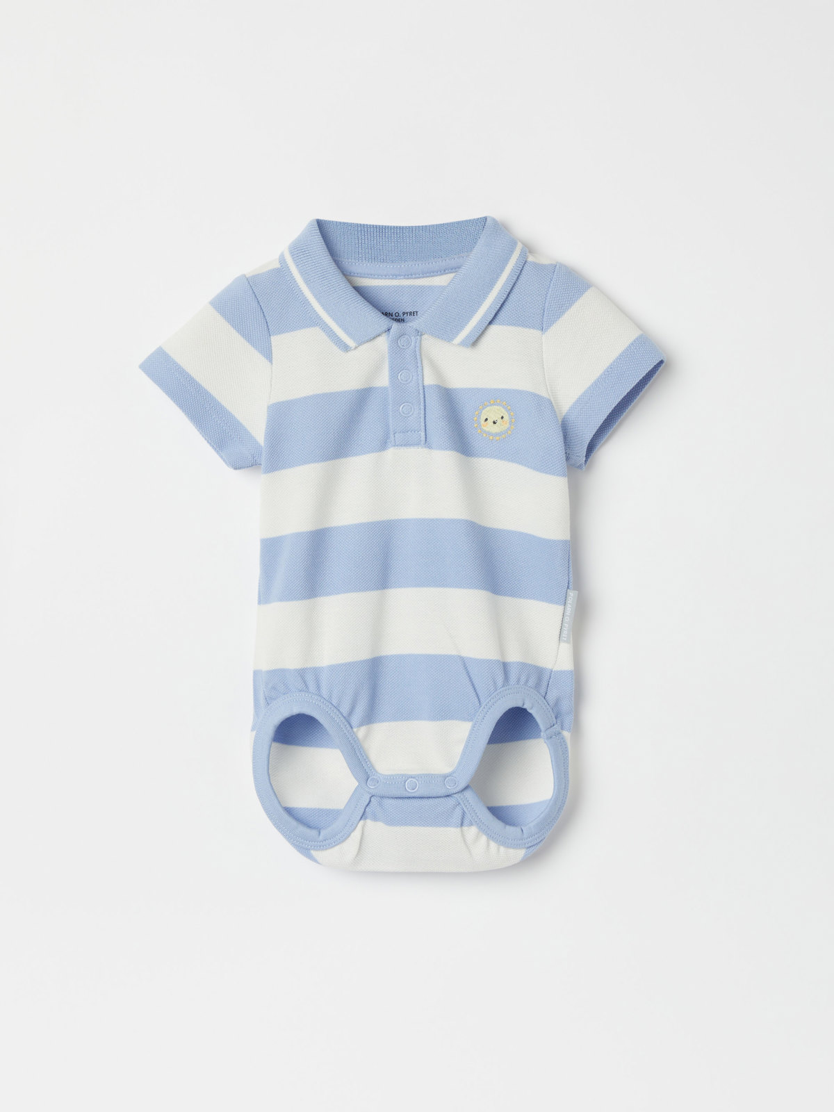 Short-sleeved polo bodysuit for baby in soft, 100% organic cotton. This bodysuit has block stripes and a small embroidered sun on the chest.