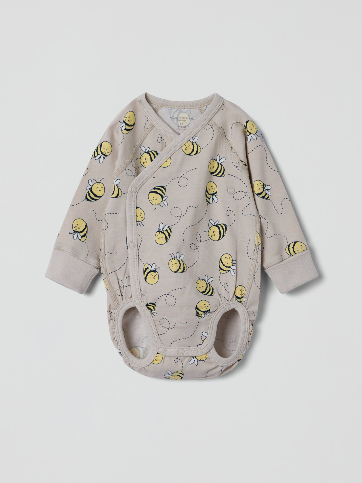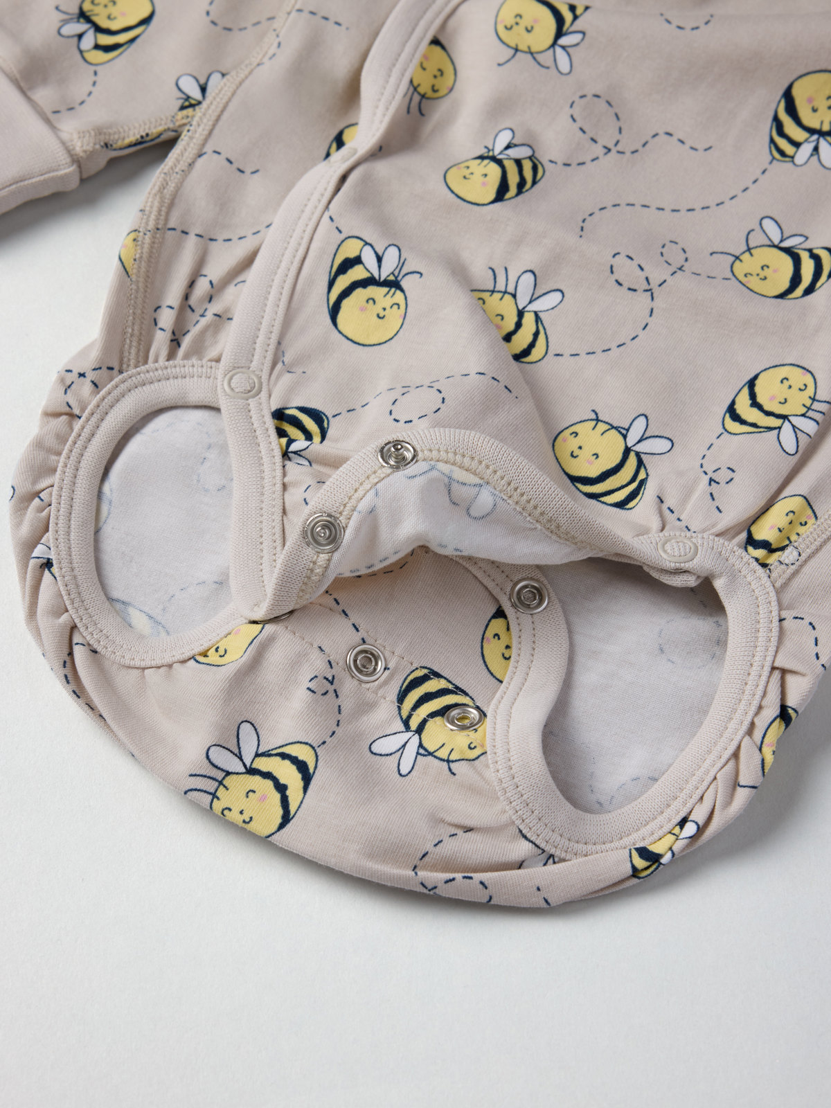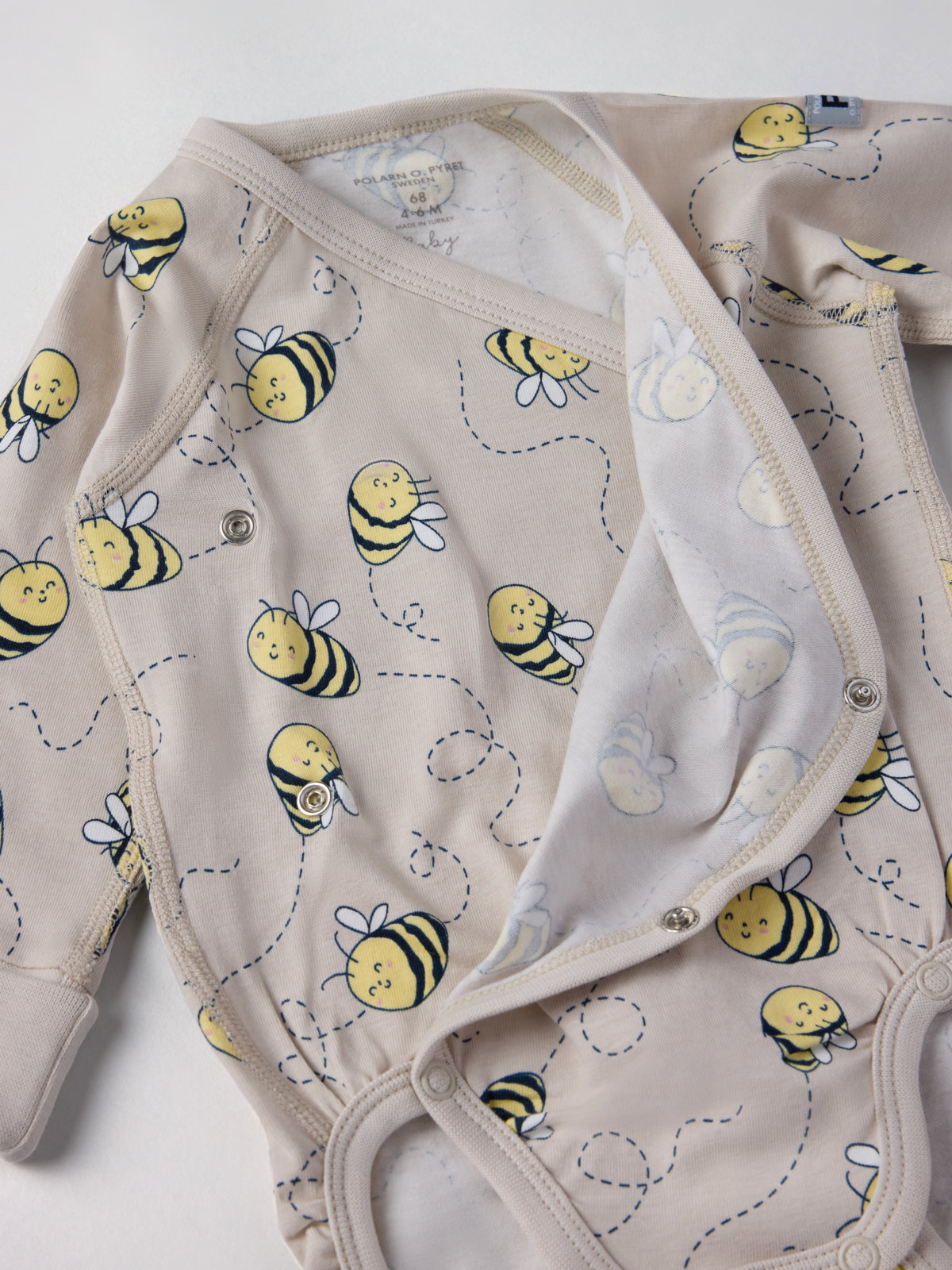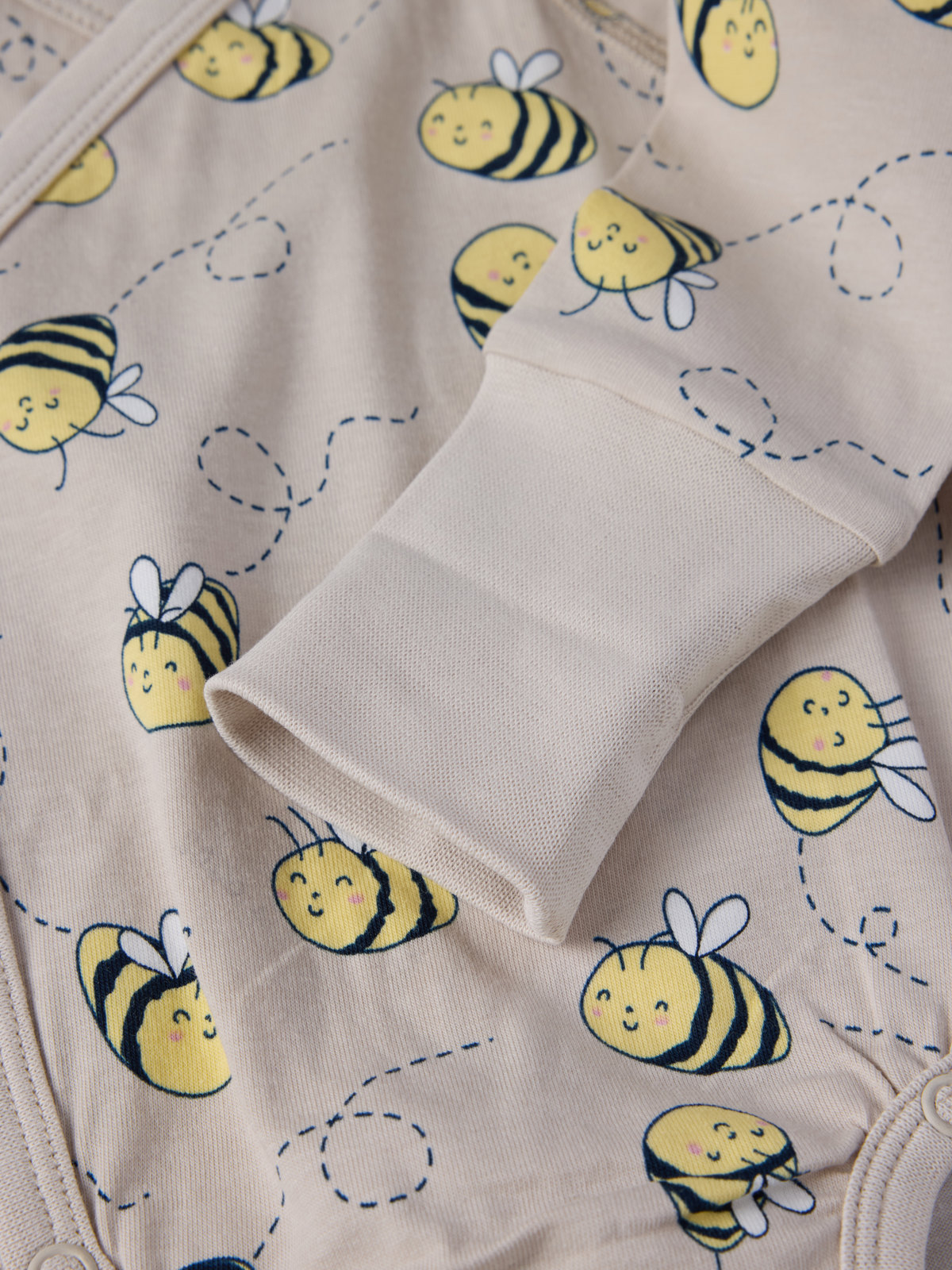 Wrap babygrow in 100% organic cotton with an allover bee print. Thanks to the clever solution of an extra row of snaps at the crotch and fold-down cuffs, the bodysuit can grow with your baby!