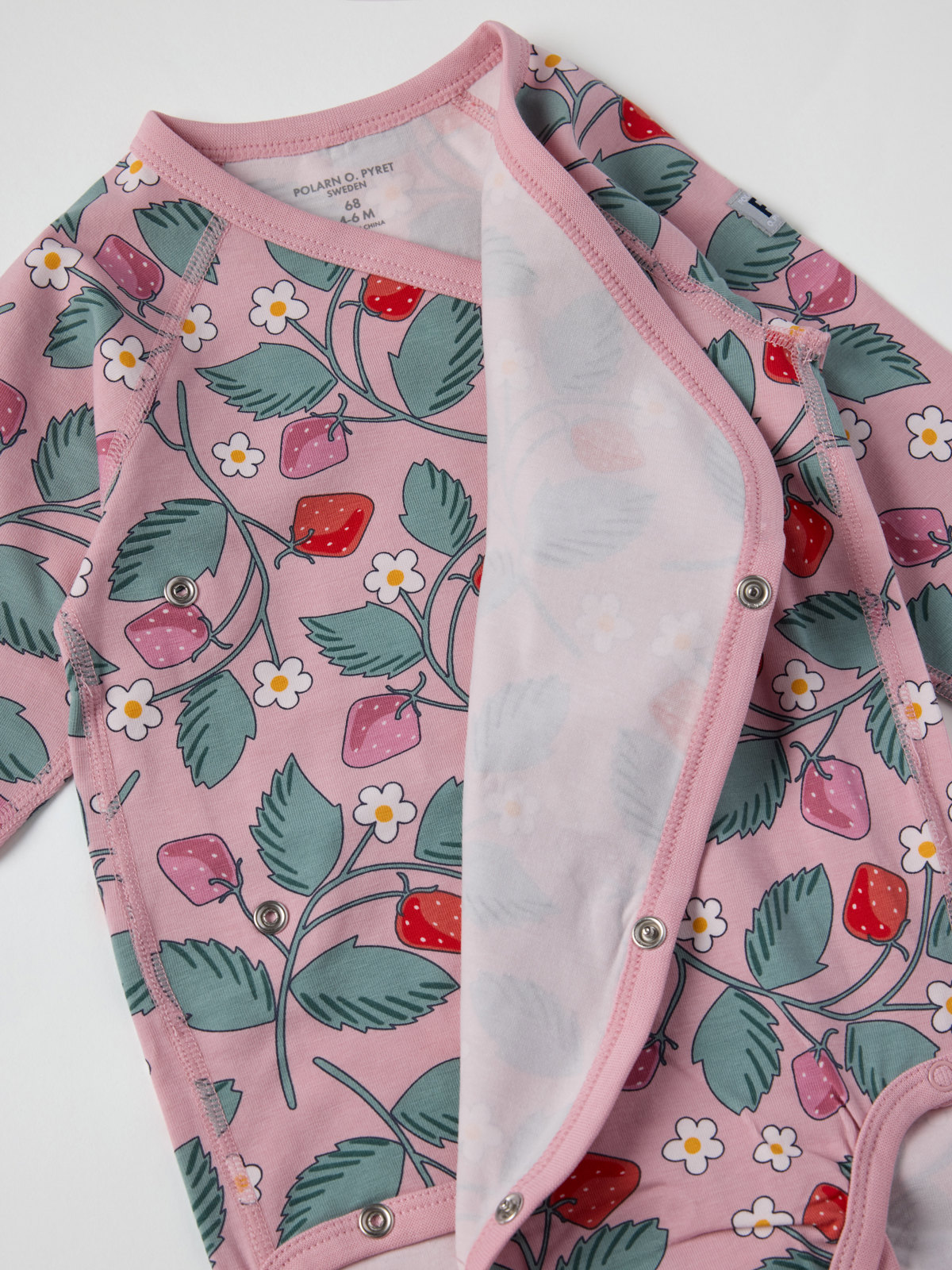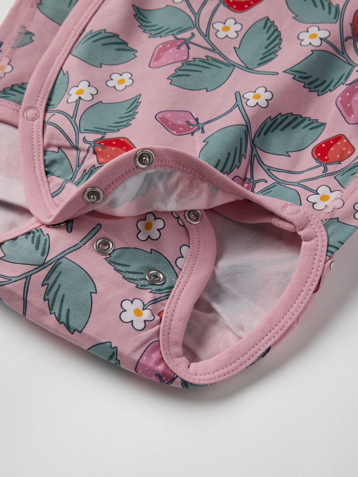 Wrap bodysuit in 100% organic cotton, with extra soft seams that are gentle on sensitive skin. The bodysuit features an allover strawberry print and matches the entire collection. Snaps along the flap opening and at the crotch make changing clothes easier.
