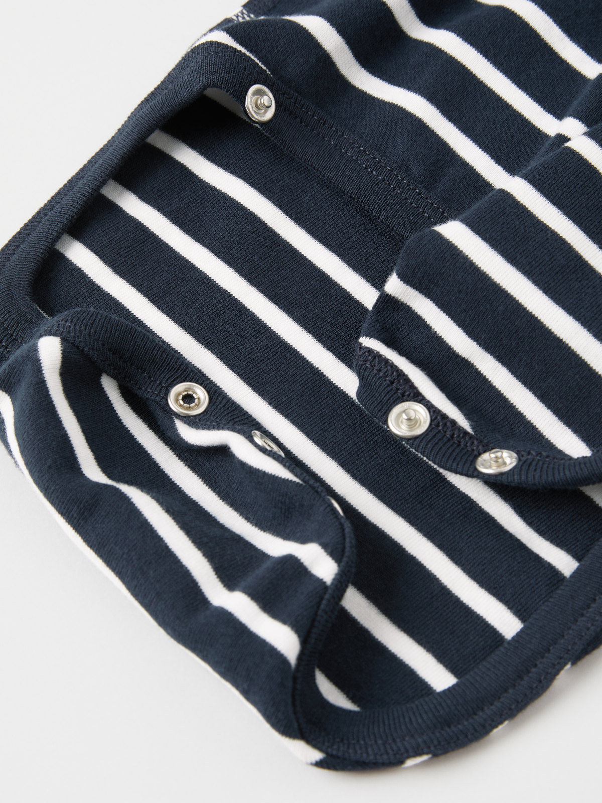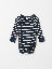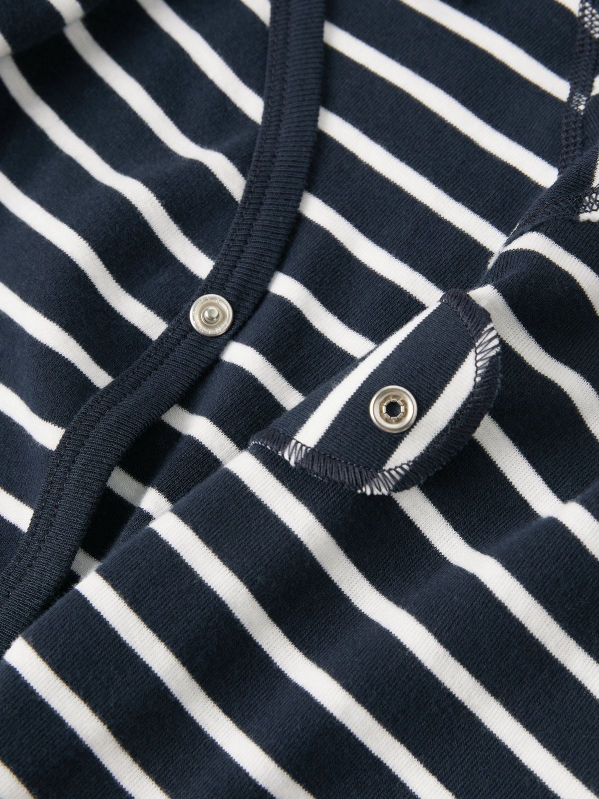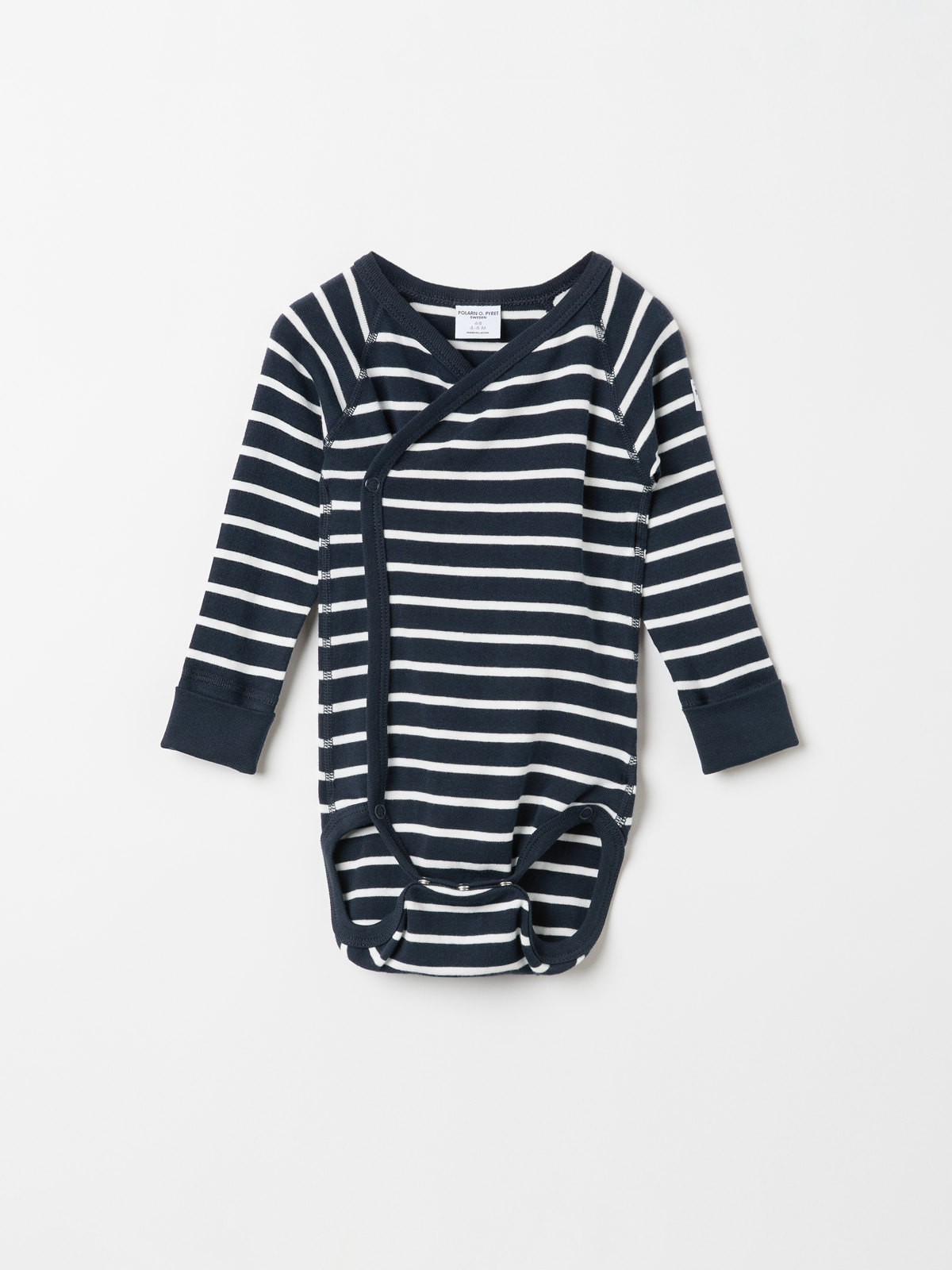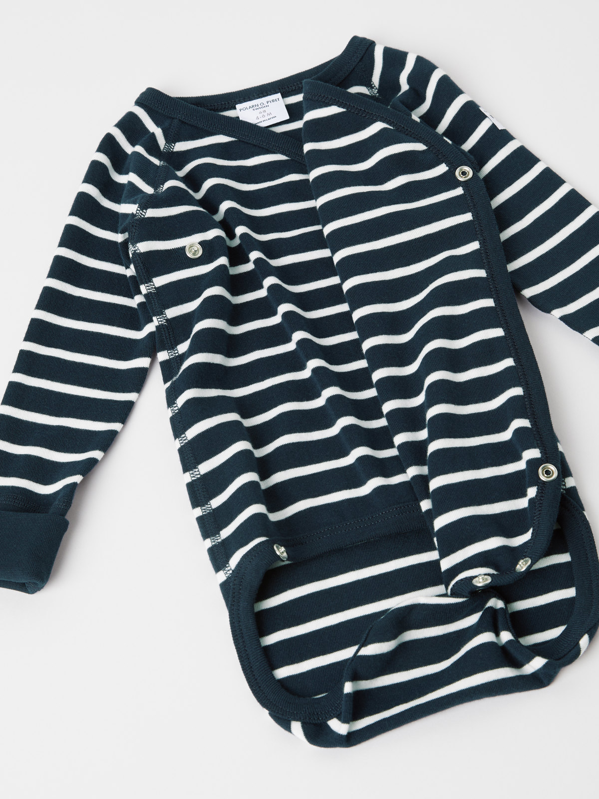 A striped wrap bodysuit in 100% organic cotton for baby. The bodysuit features our classic stripes and soft, ribbed cuffs that can be folded down as the baby grows. Snaps along the closure and at the crotch facilitate dressing and diaper changes.