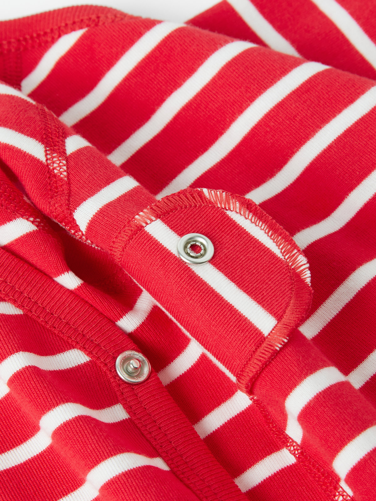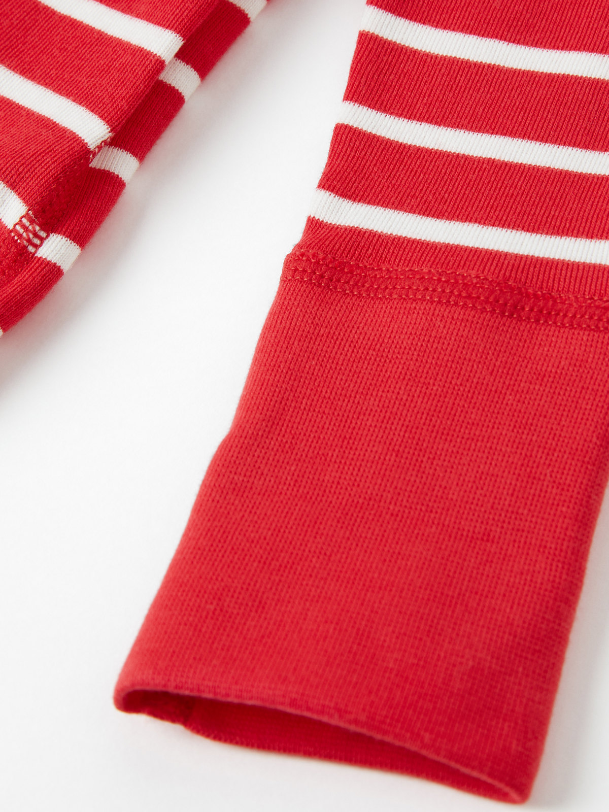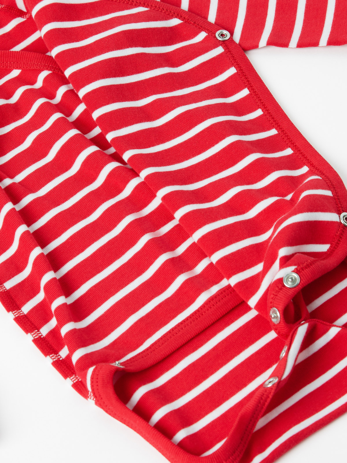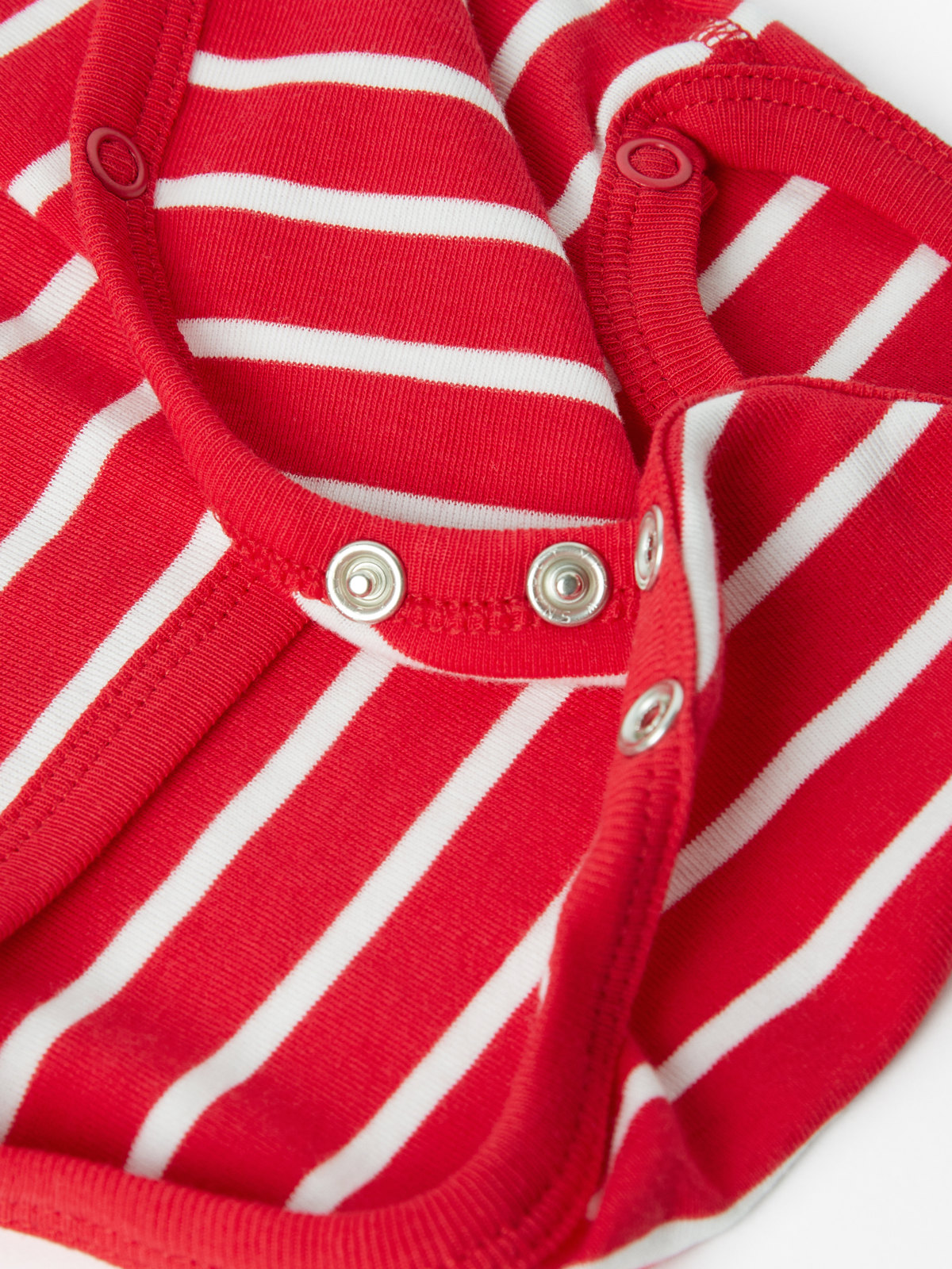 A striped wrap bodysuit in 100% organic cotton for baby. The bodysuit features our classic stripes and soft, ribbed cuffs that can be folded down as the baby grows. Snaps along the closure and at the crotch facilitate dressing and diaper changes.