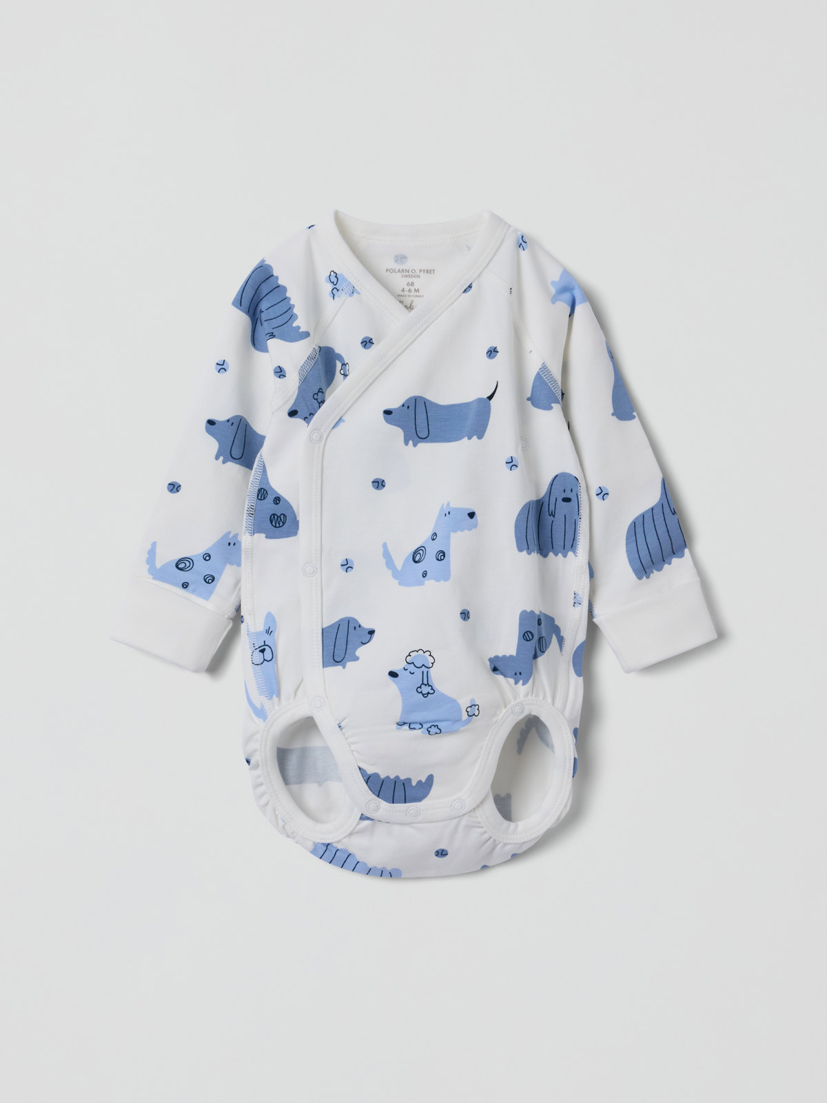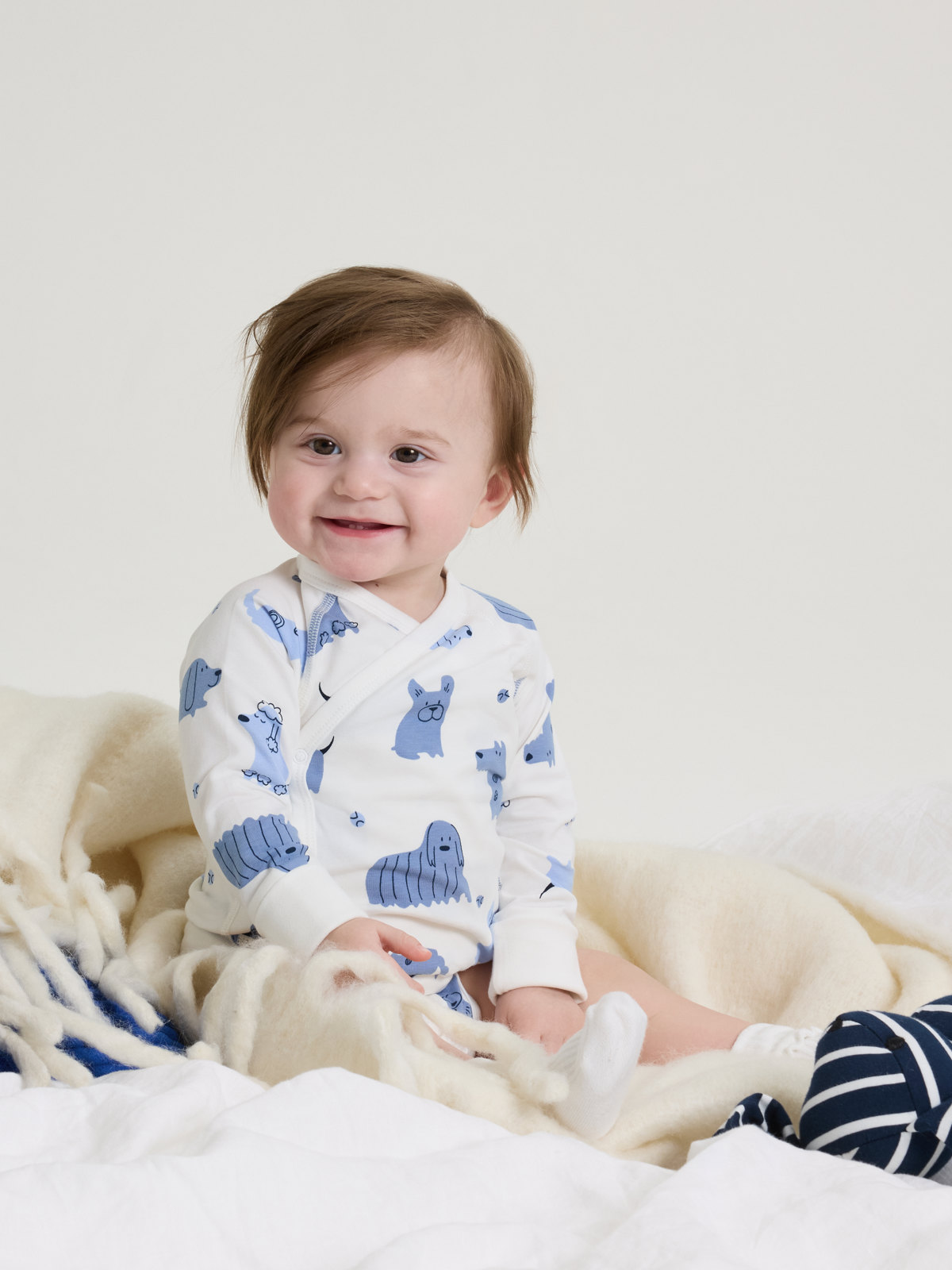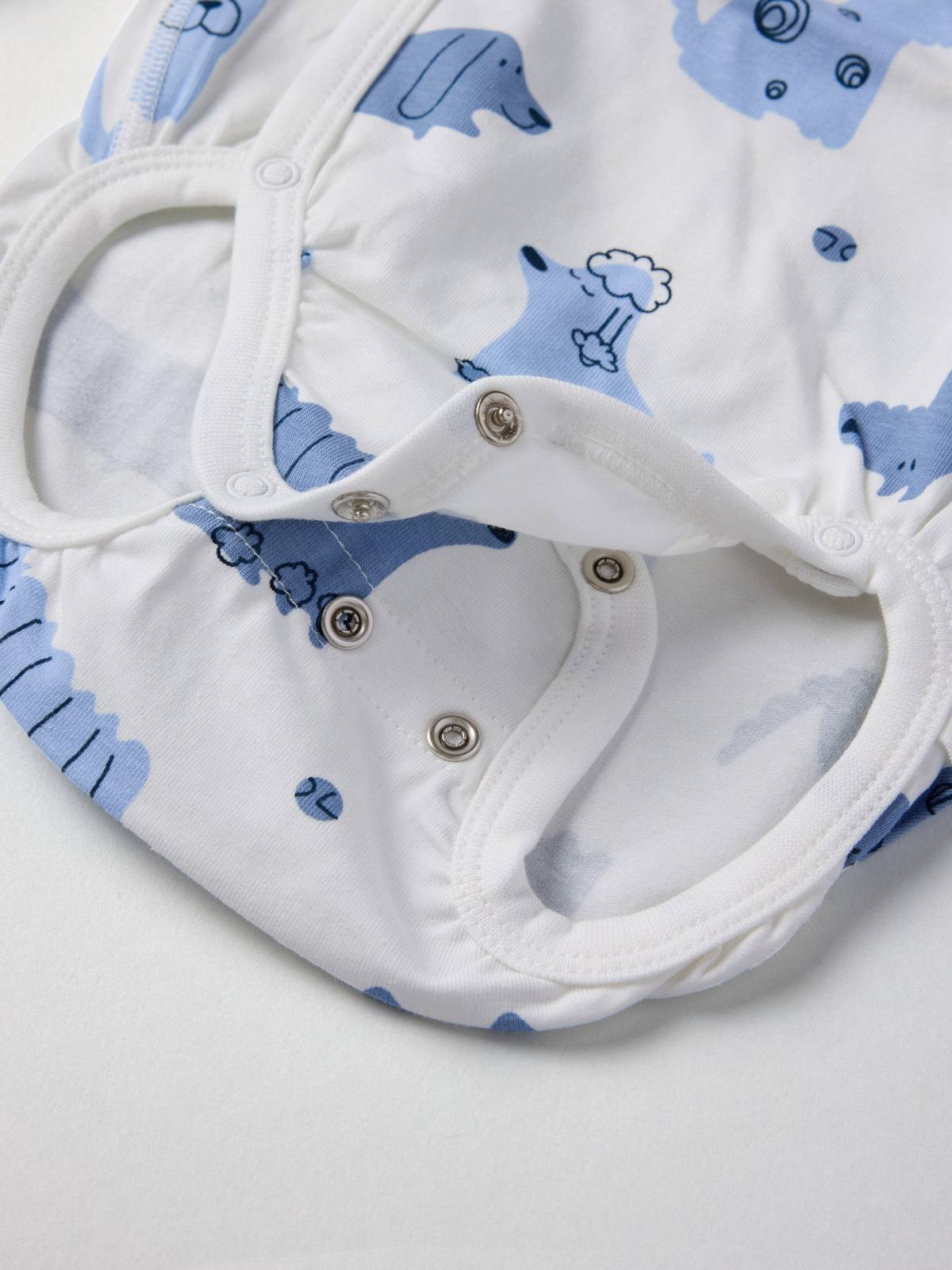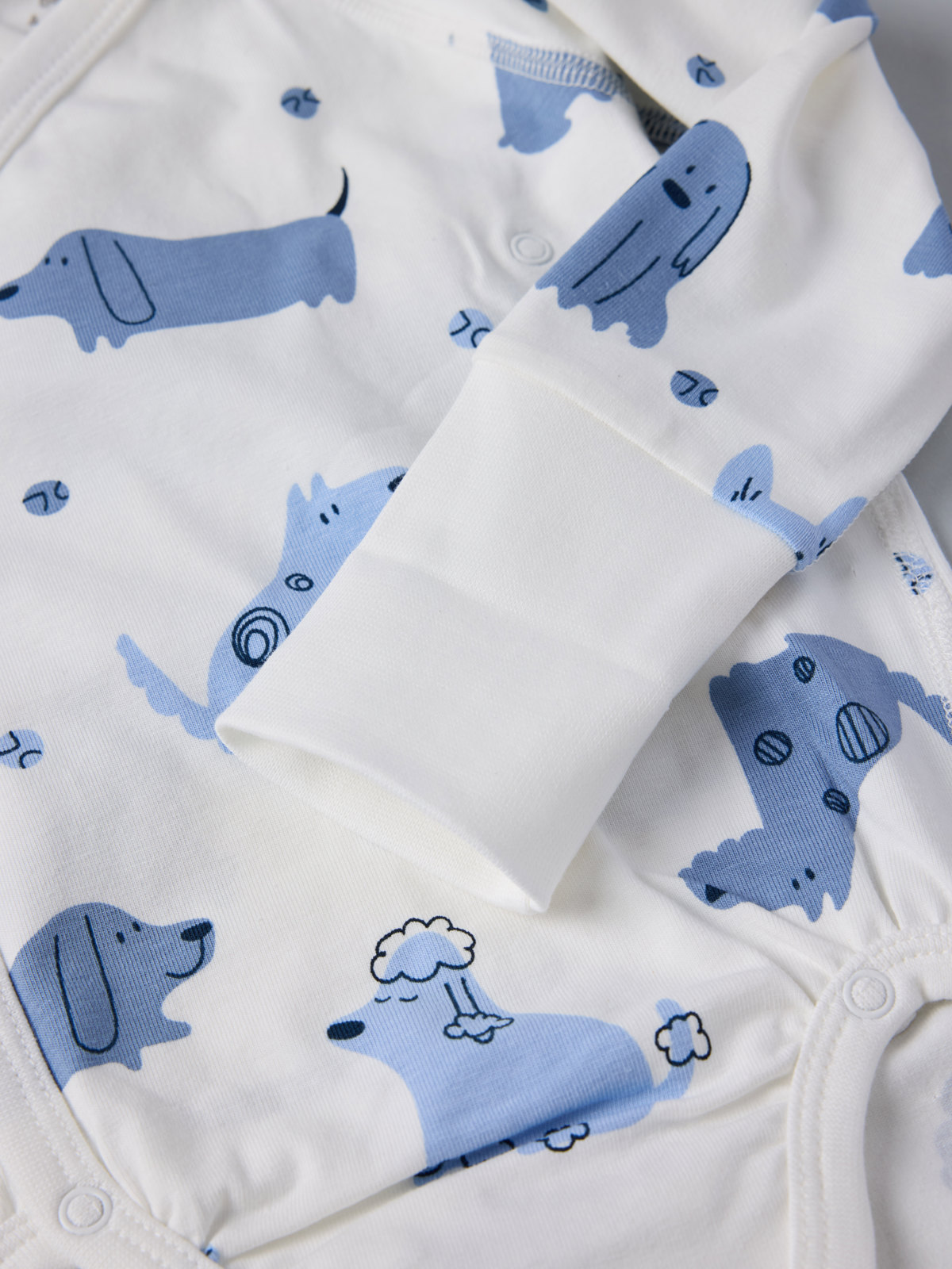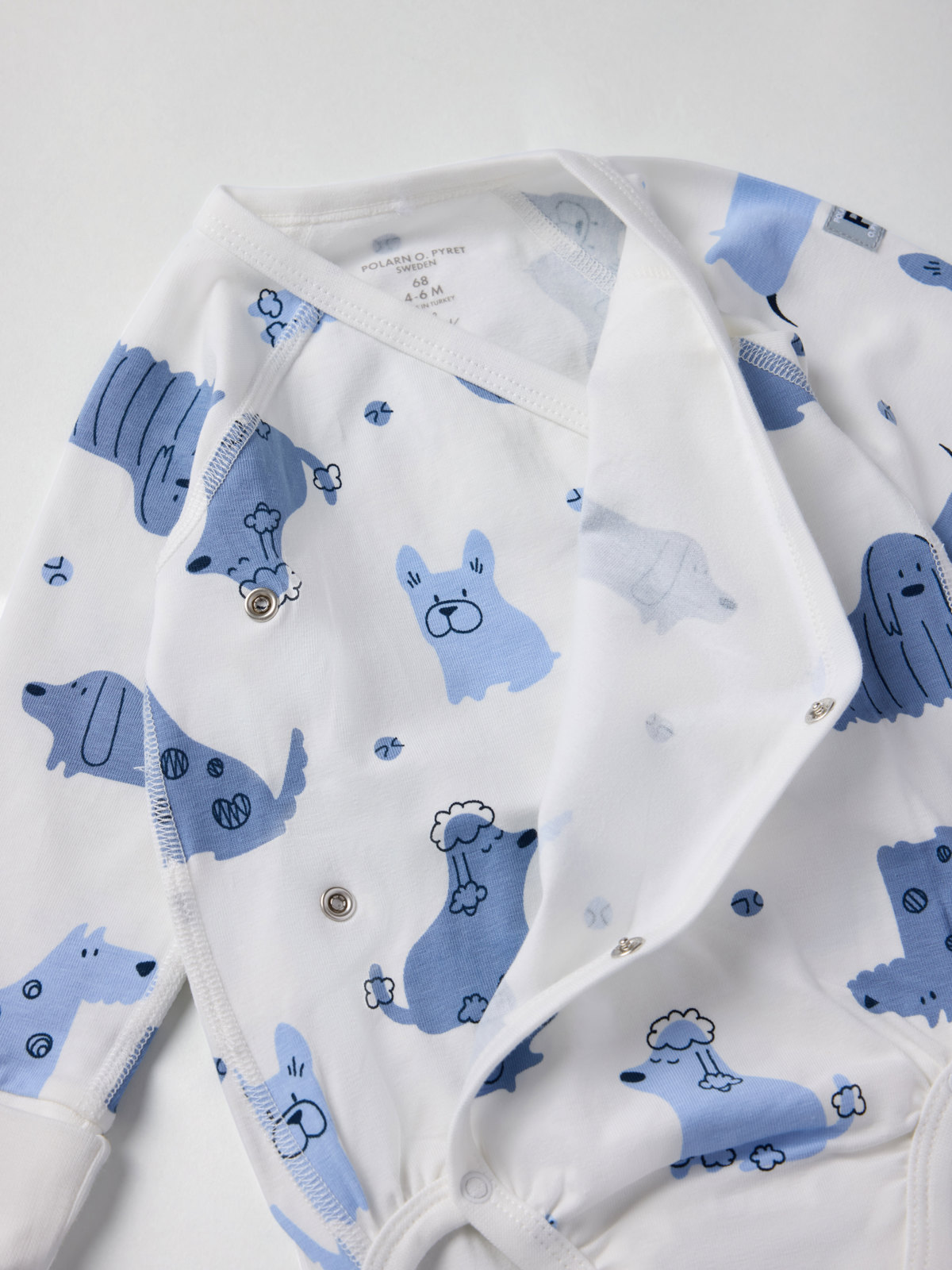Wrap babygrow in 100% organic cotton with an allover dog print. Thanks to the clever solution of an extra row of snaps at the crotch and fold-down cuffs, the bodysuit can grow with your baby!