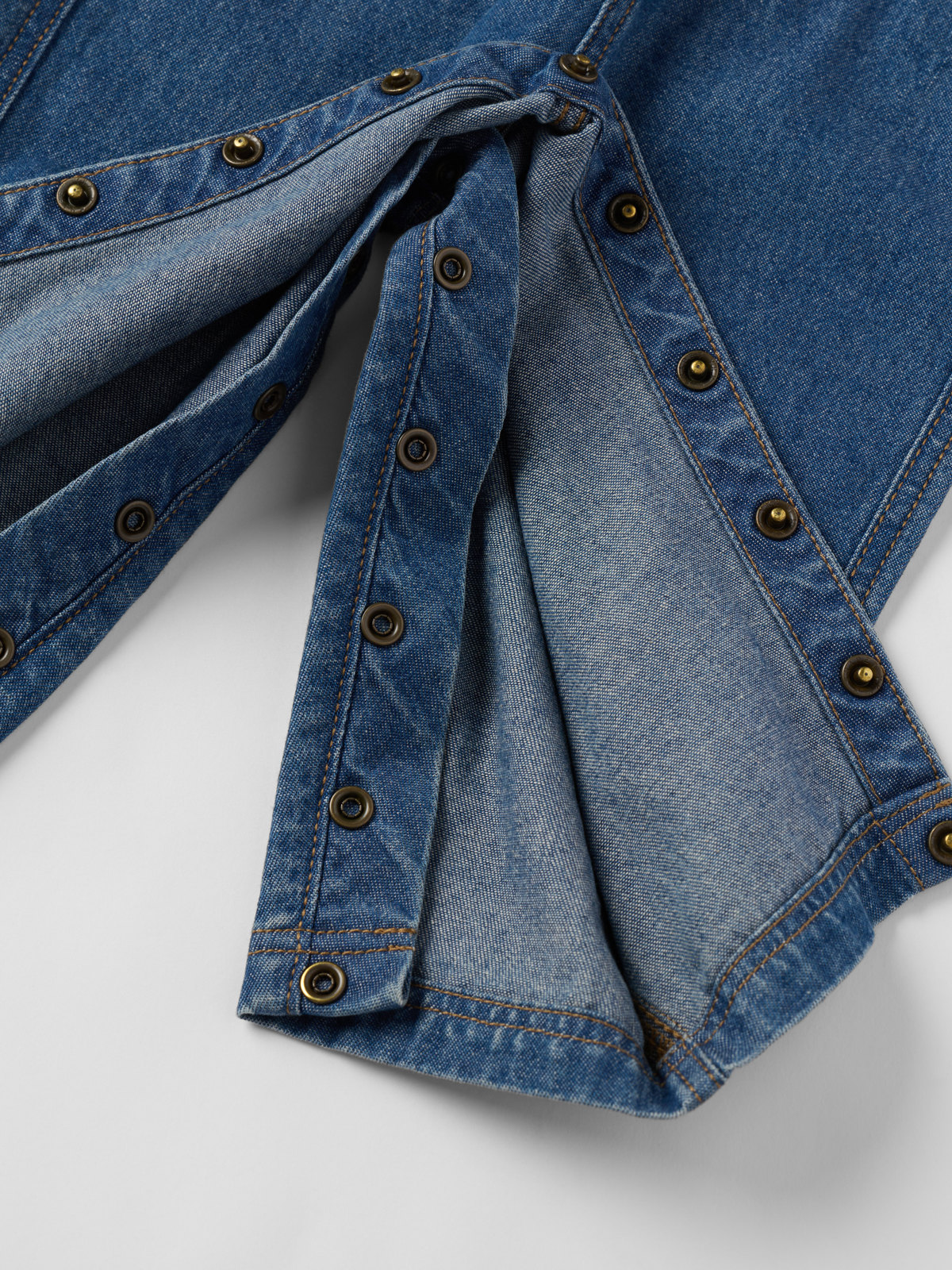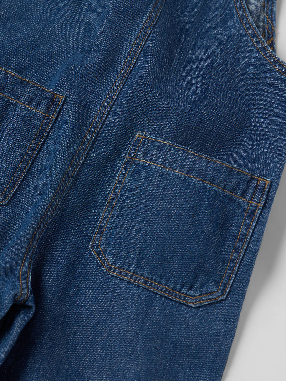 Dungarees in soft, lightweight denim – a true autumn favourite! They have straight legs, adjustable straps with buckles at the front, and side buttons for easy dressing. They also feature a front chest pocket and two back pockets. Press buttons at the crotch make changing easy.