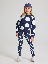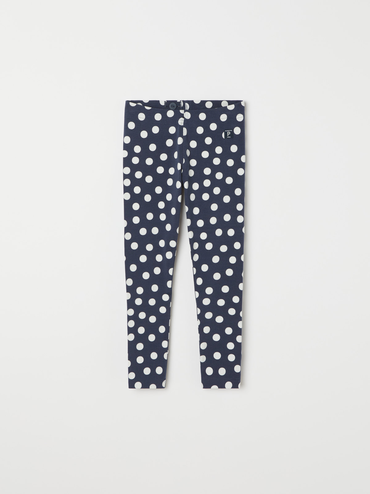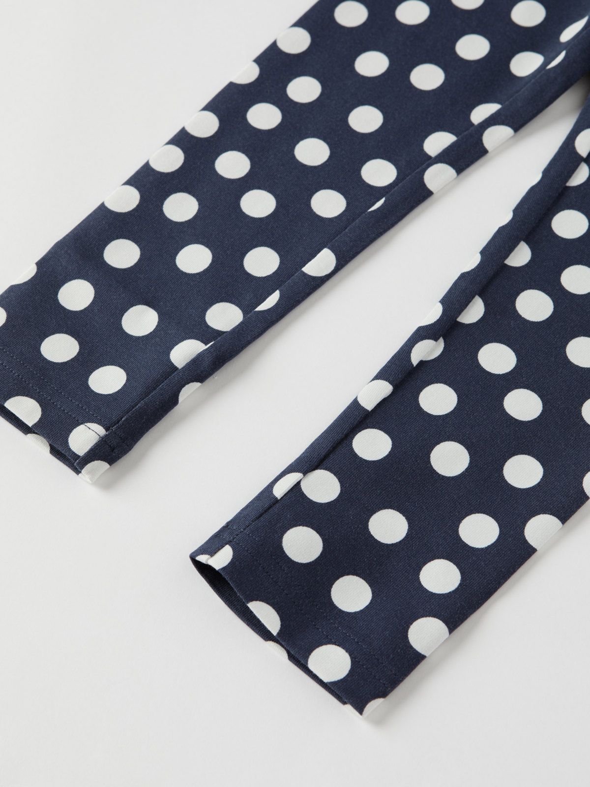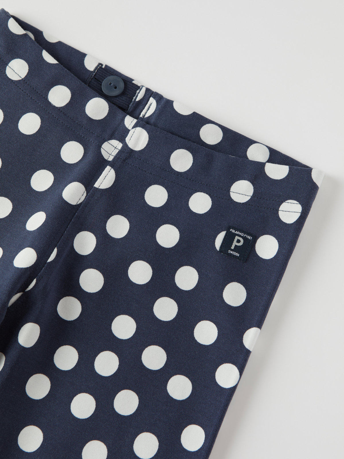 The spotted leggings have an adjustable waist with buttonhole elastic.