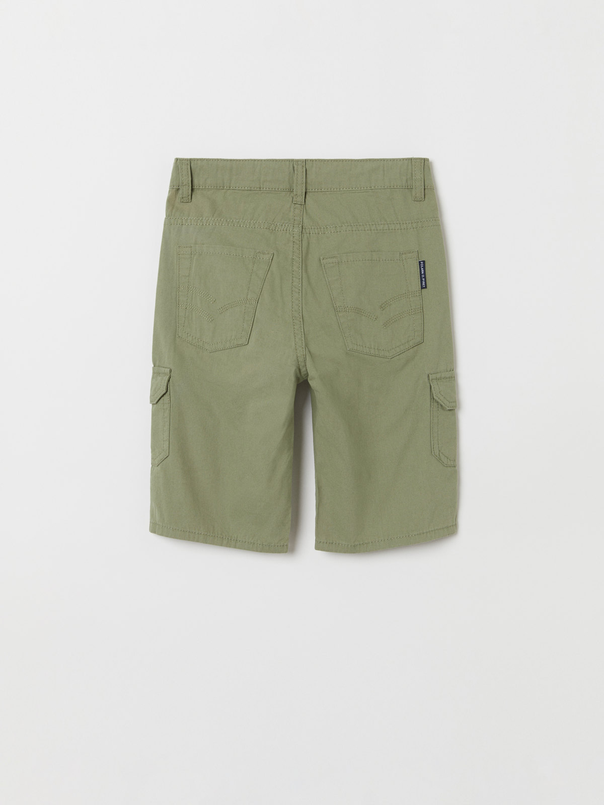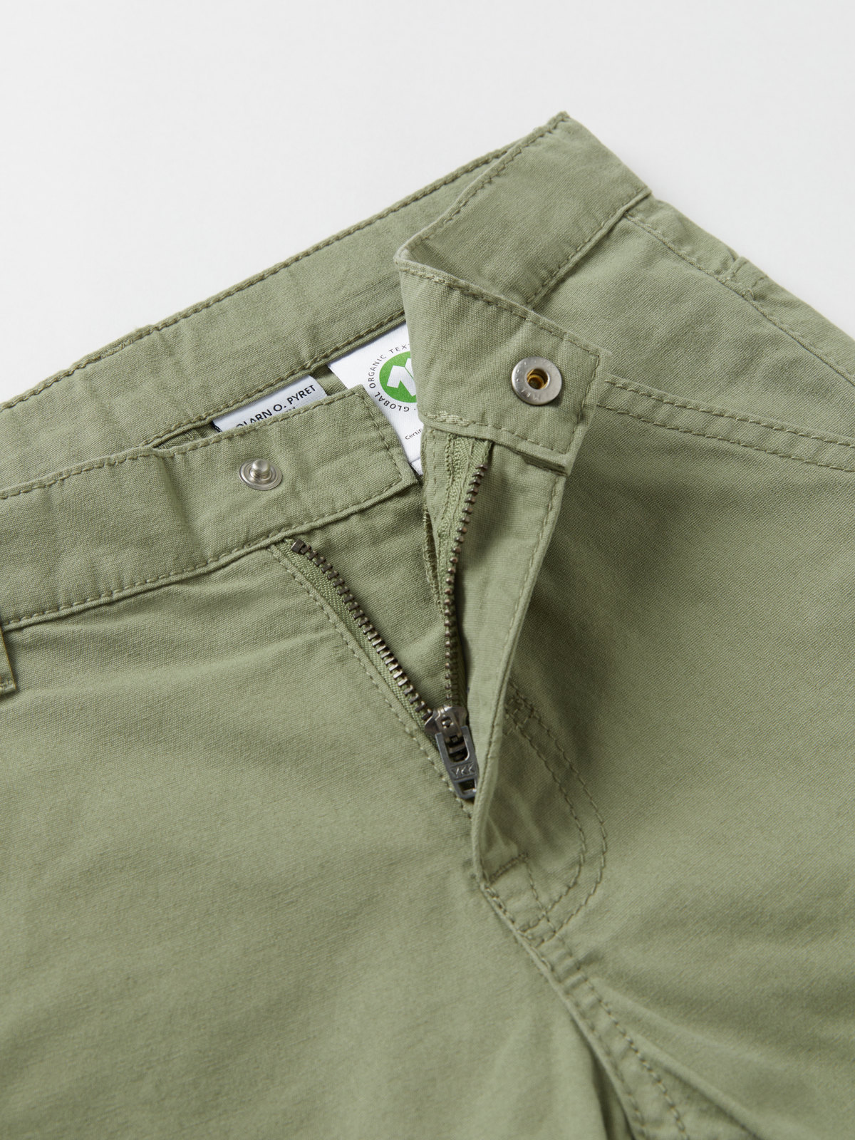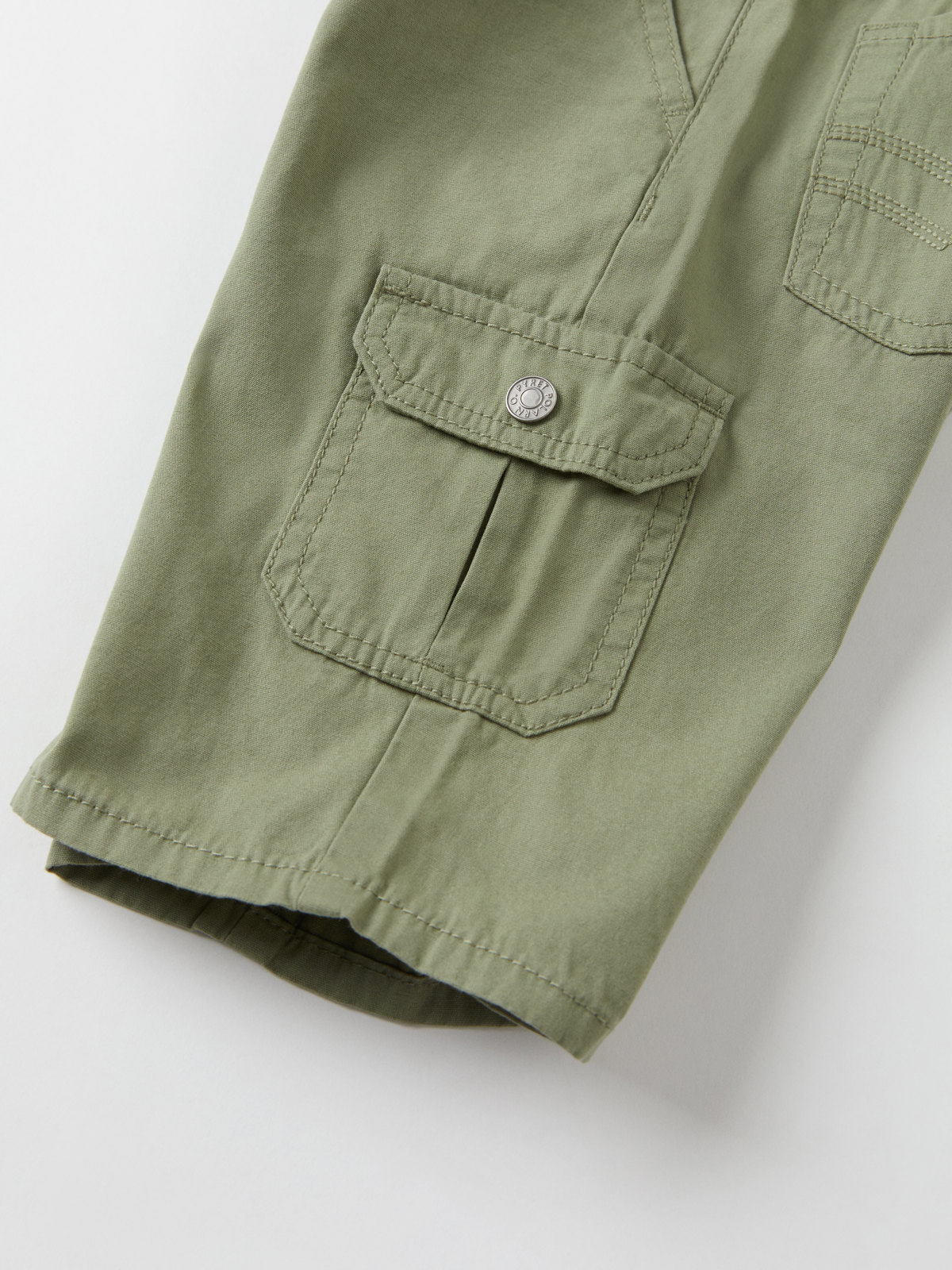 Soft cargo shorts made of 100% organic cotton. They have two front and two back pockets, and two leg pockets with snap closure. The waist is adjusted with buttonhole elastic. The shorts also have pre-shaped knees to allow for a better fit. The fly closes with a zipper and snap. Size 86-92 has a soft, ribbed waistband.
