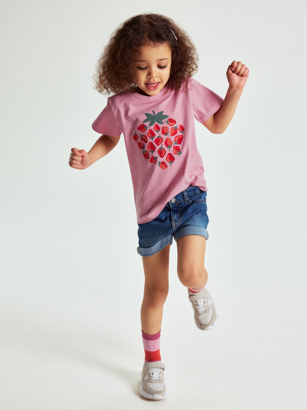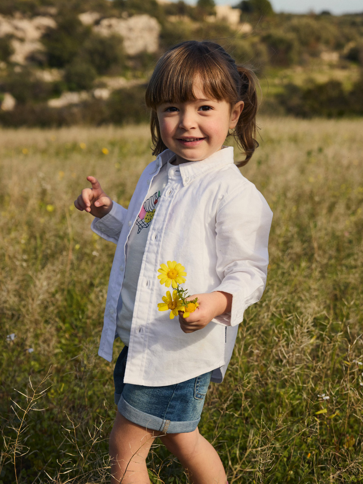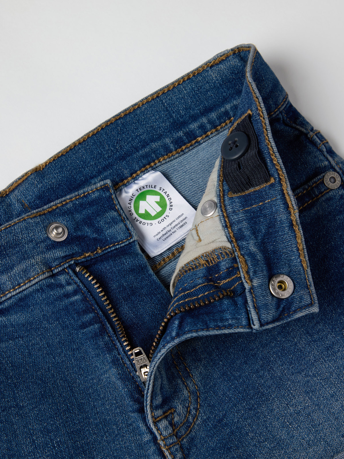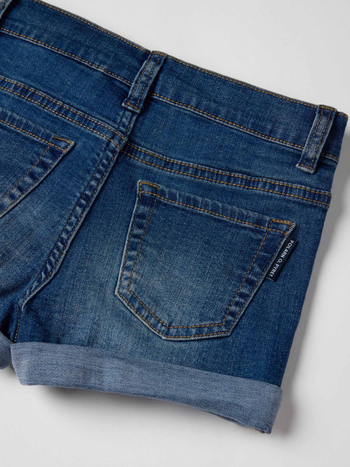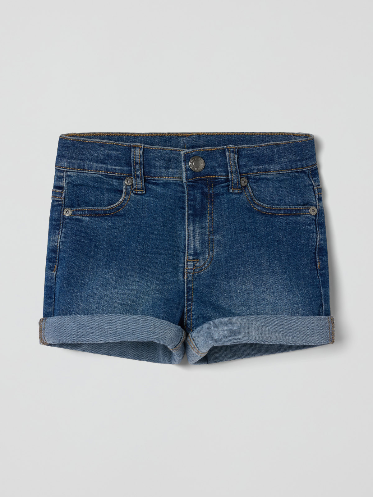 Short jean shorts in 100% organic cotton with adjustable waist and belt loops. The shorts legs have turn-ups. The fly closes with a snap and zipper.