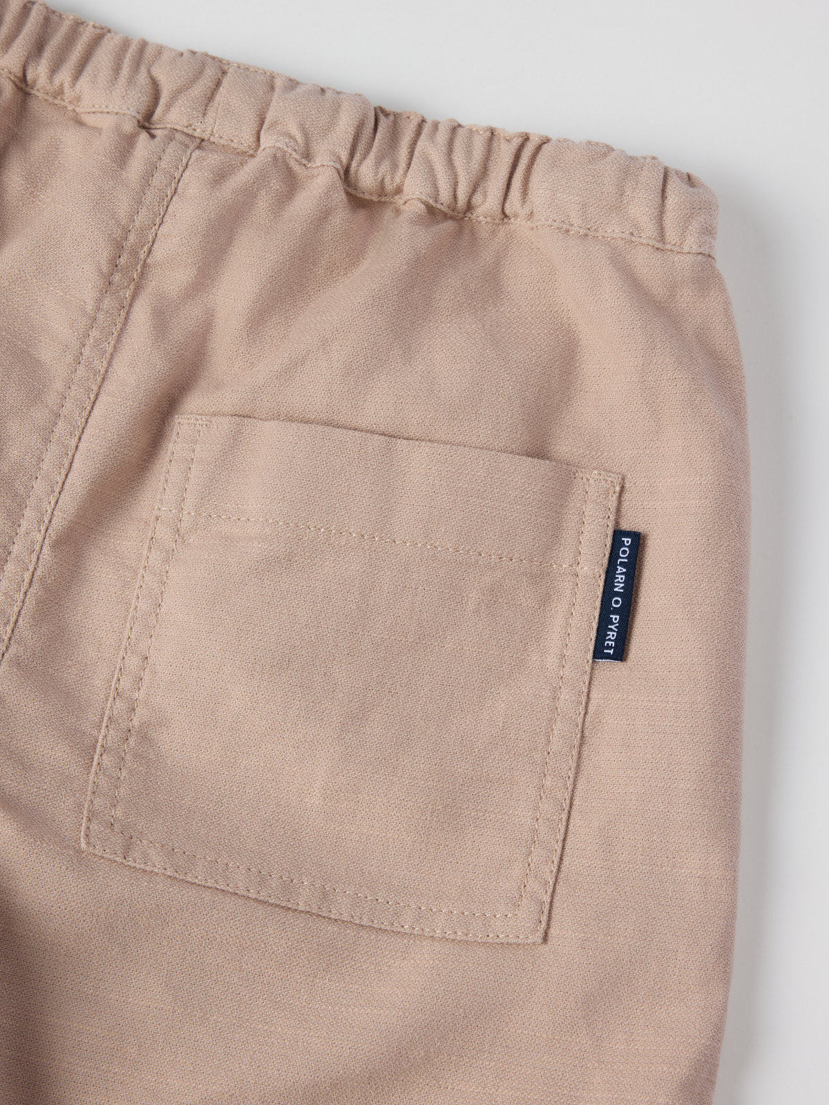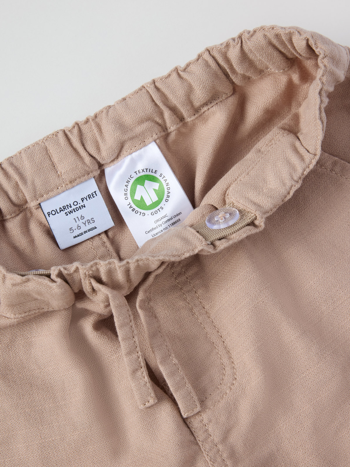 Solid color shorts in woven, organic cotton with a linen feel – comfy for both everyday and party wear. The shorts have an elastic, drawstring waist and two front pockets.