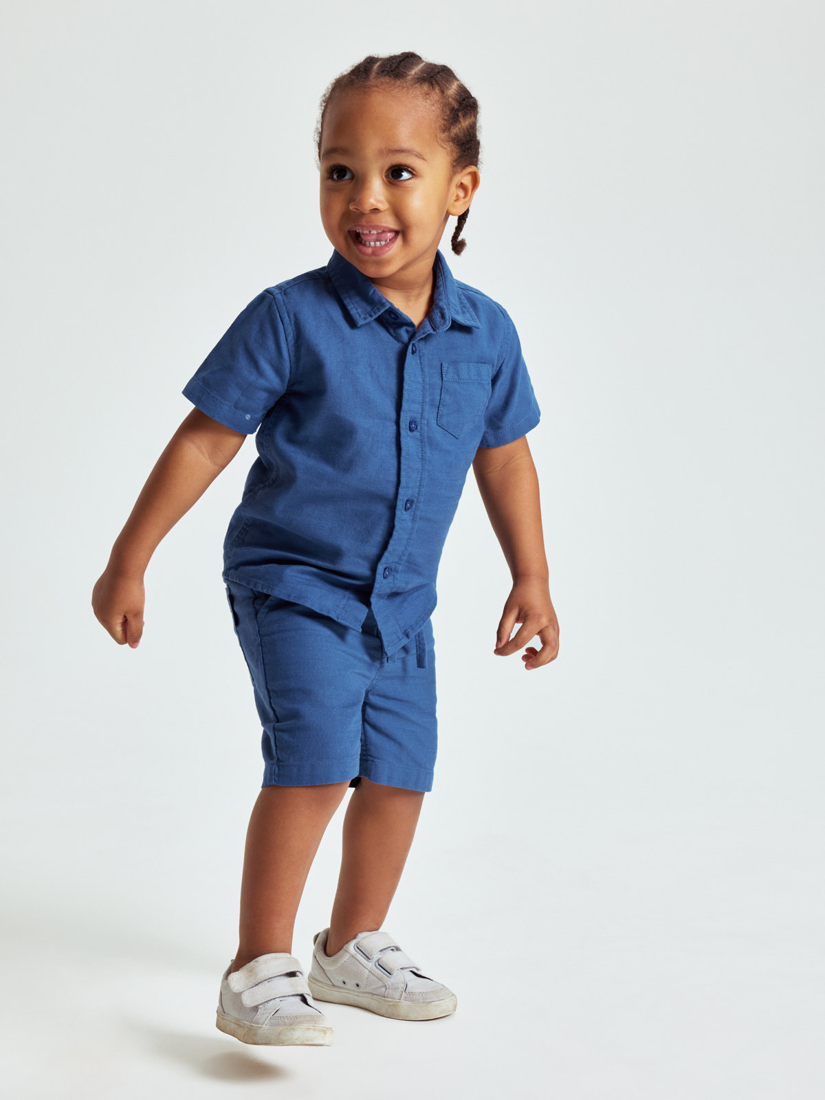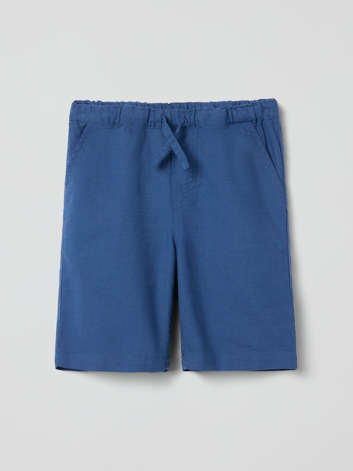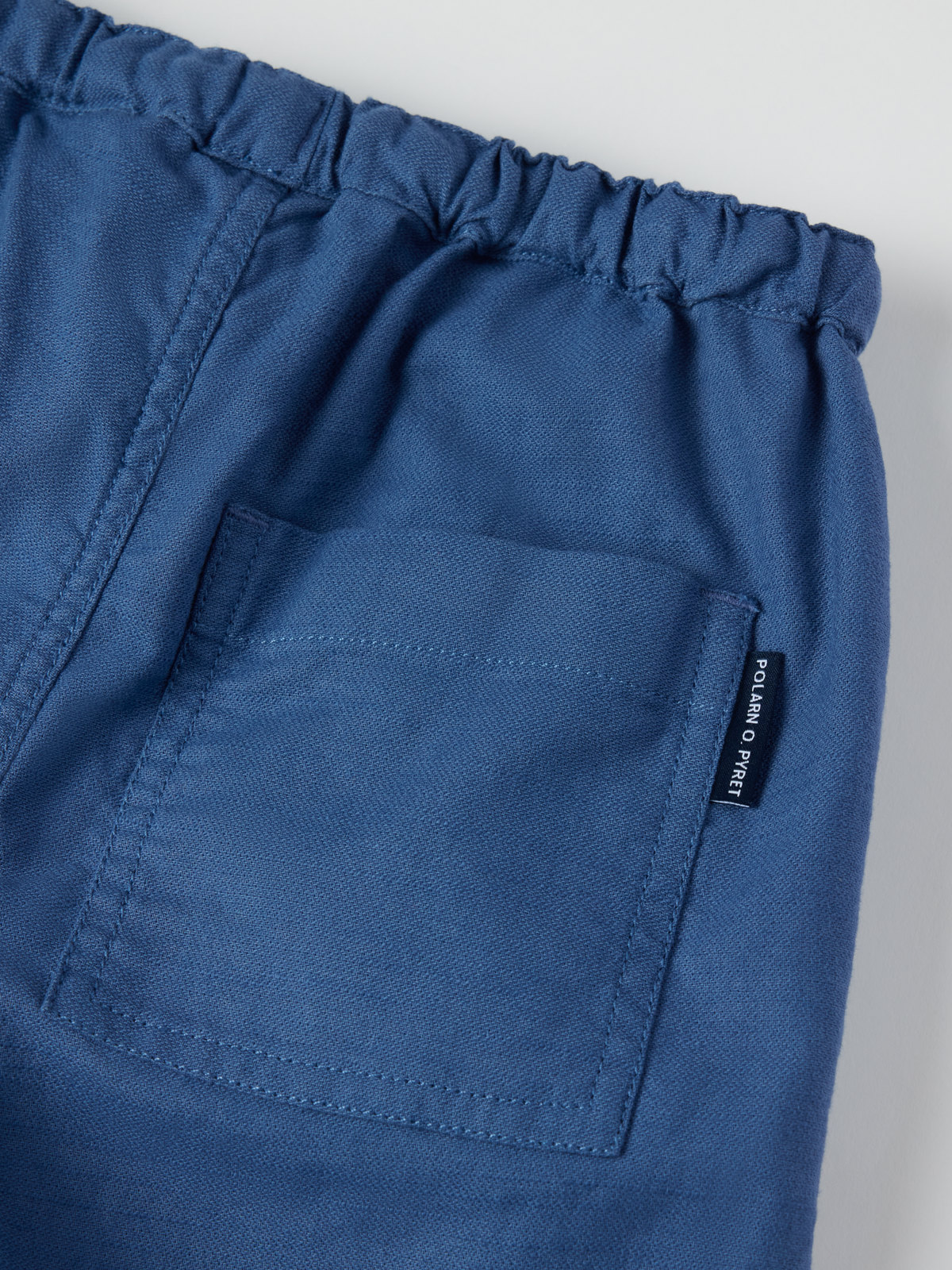 Solid color shorts in woven, organic cotton with a linen feel – comfy for both everyday and party wear. The shorts have an elastic, drawstring waist and two front pockets.