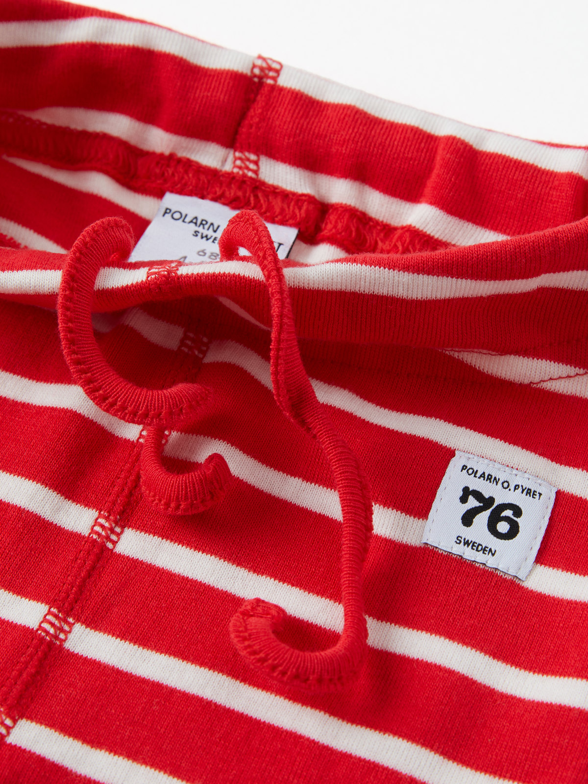 Striped pants in 100% organic cotton for baby. The pants feature our classic stripes and an elastic waist that can be adjusted with drawstring. The pants also have soft, elastic ankle cuffs.