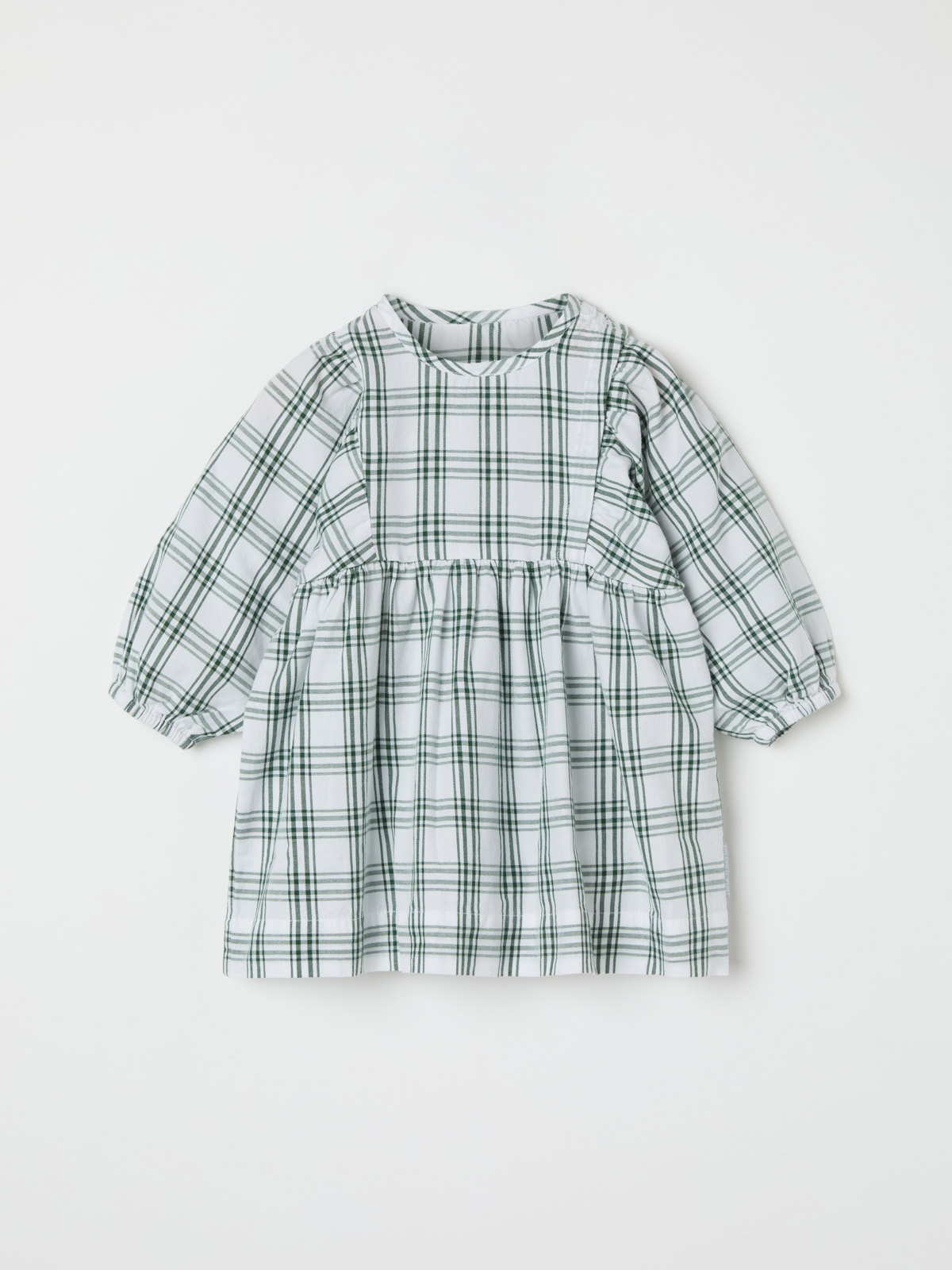 The dress has puff sleeves, a gathered skirt and elasticated cuffs.