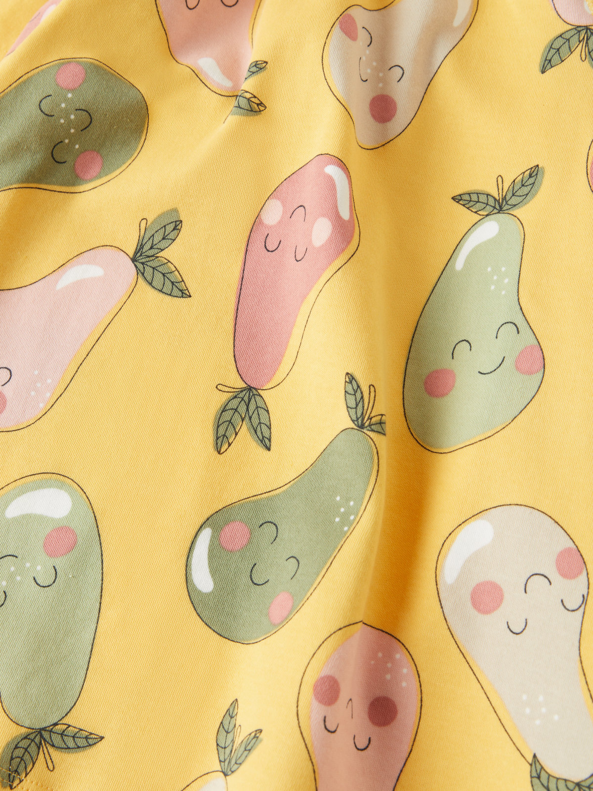 An adorable dress for baby in soft, organic cotton jersey, with a charming pear print. The dress has small bows at the neckline, and an elastic neckline and cuffs.