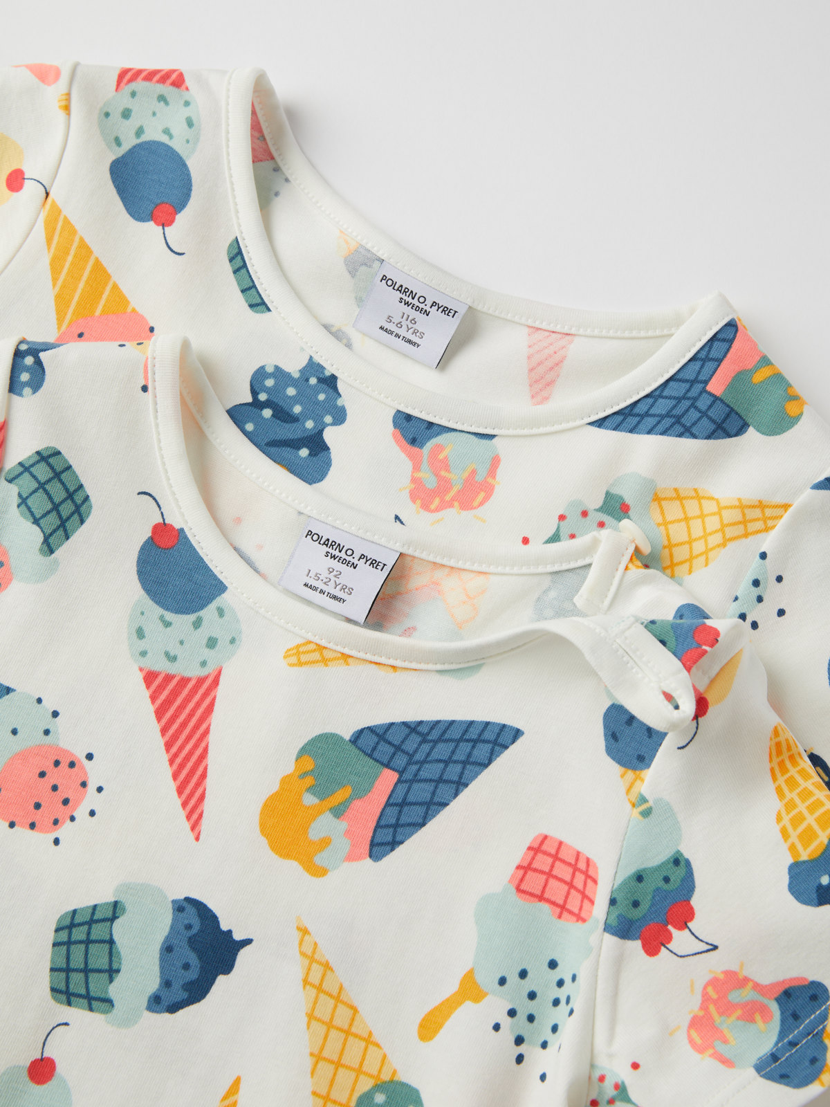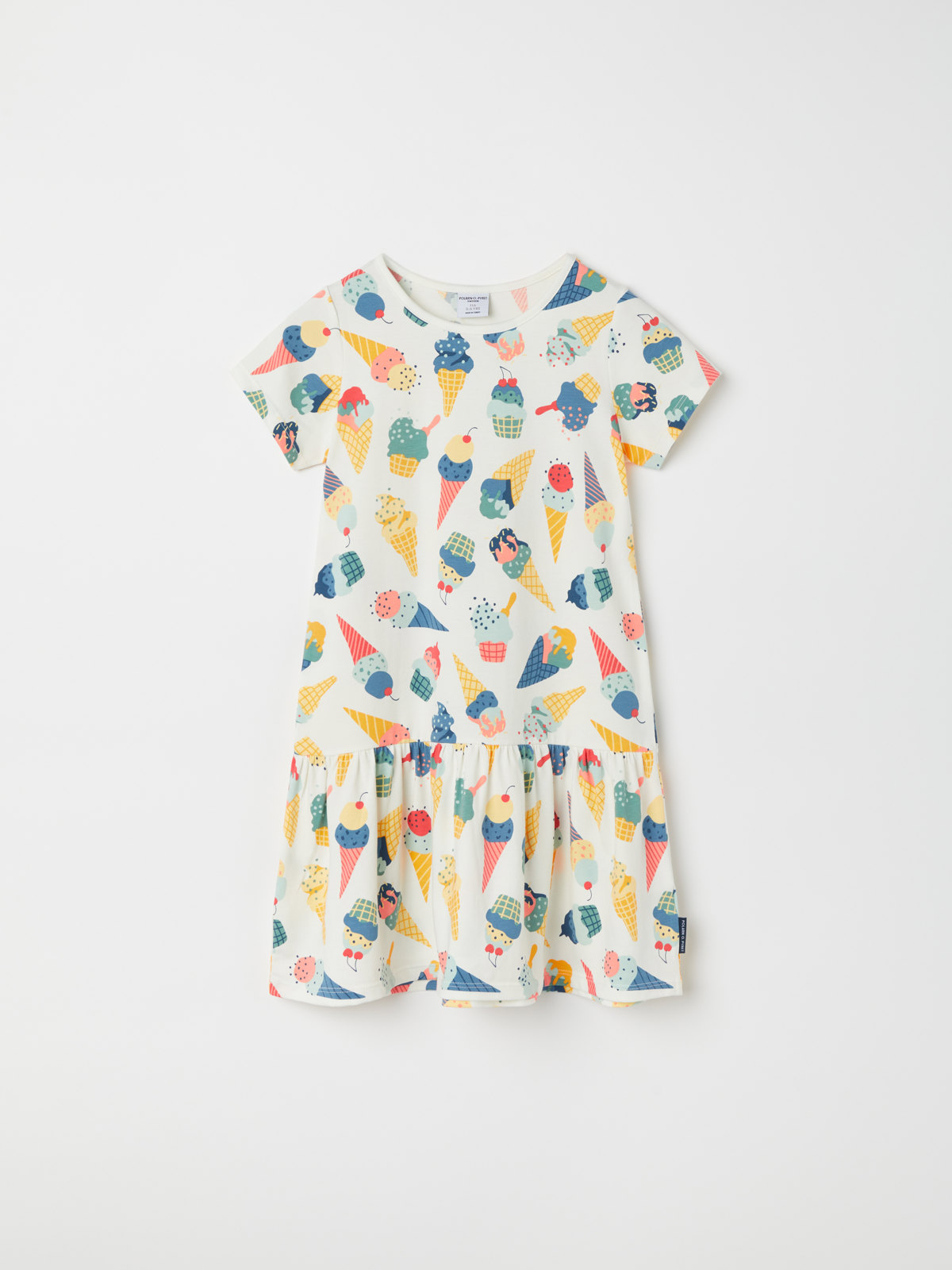 The dress features an allover ice-cream print and a fancy ruffle hem.