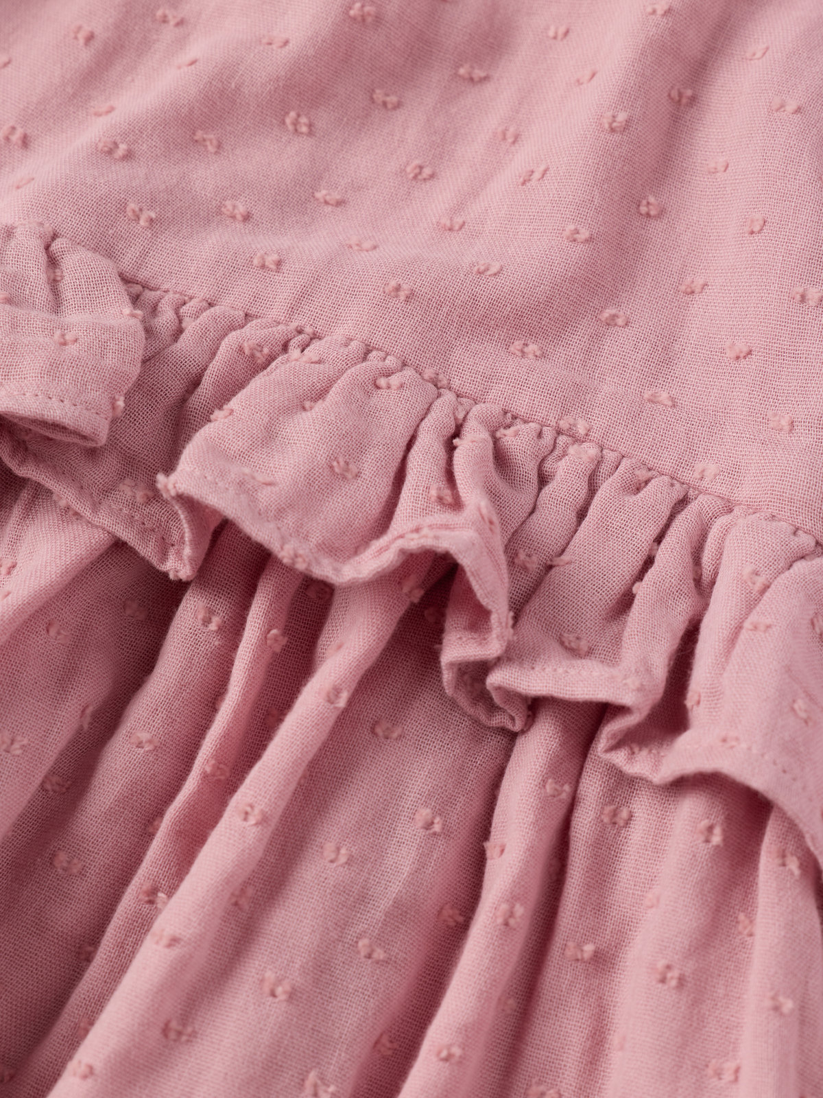 Cute muslin dress in 100% organic cotton – perfect for any occasion! This dress is decorated with frills at the waist and shoulders, and closes with a button placket at the back. The sleeves have elastic cuffs.