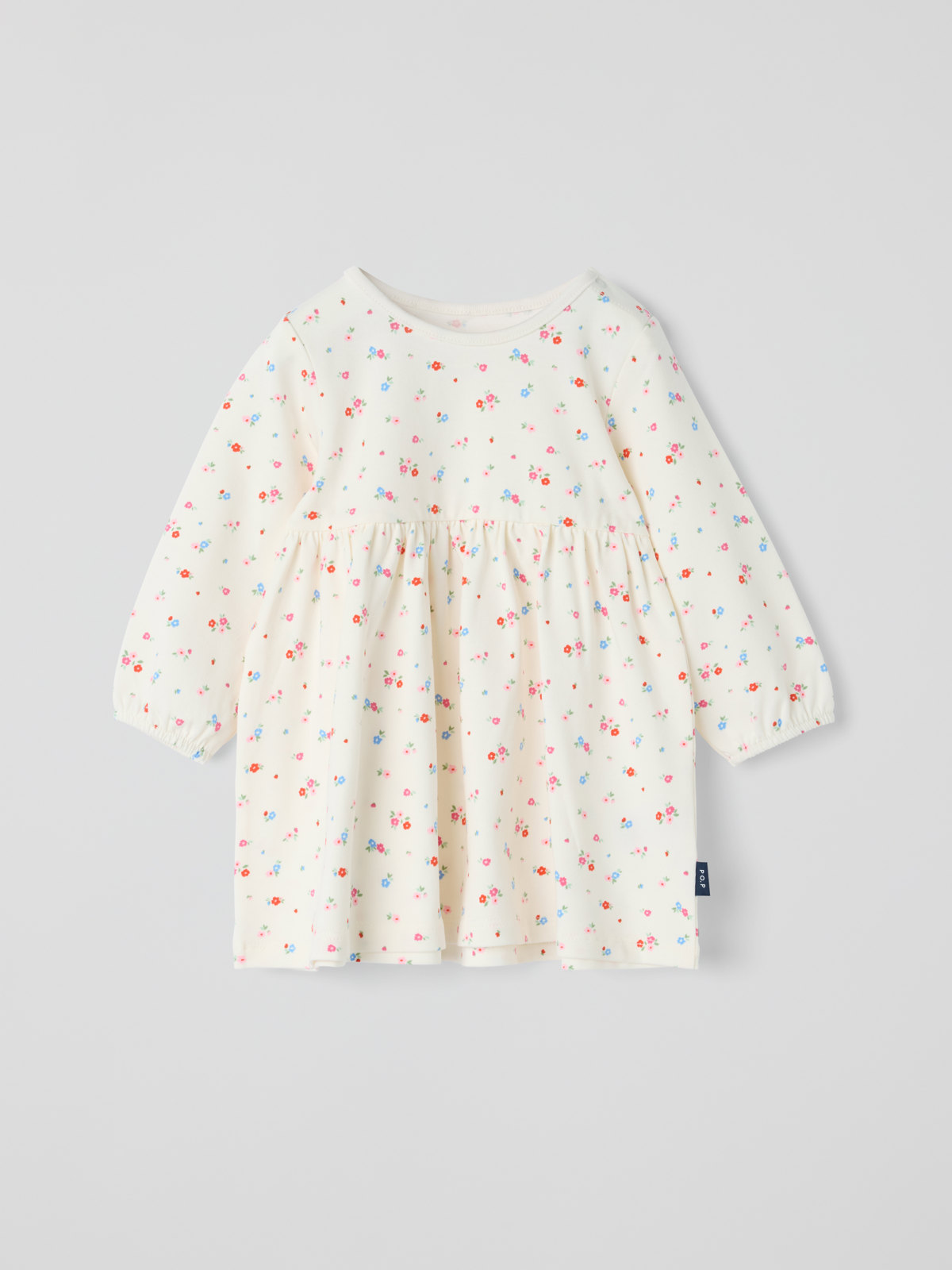 Dress in lightweight organic cotton jersey – lovely for both everyday wear and parties! This dress features a high waist and a gathered skirt. The sleeves have elastic at the hem. Snap buttons on one shoulder make dressing easier.