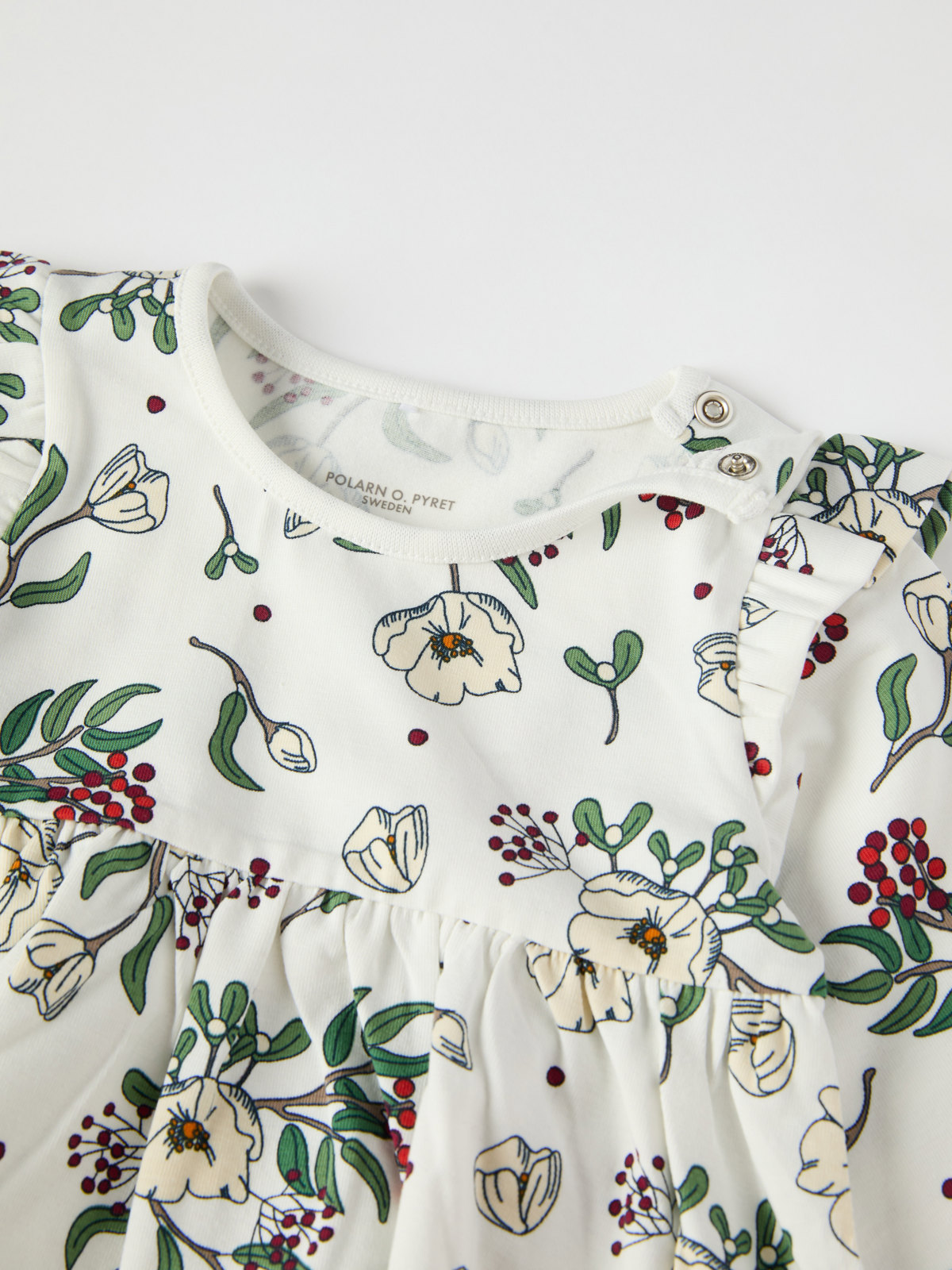 Cute dress in soft organic cotton jersey. The dress features an allover floral print adorned with ruffles over the shoulders.