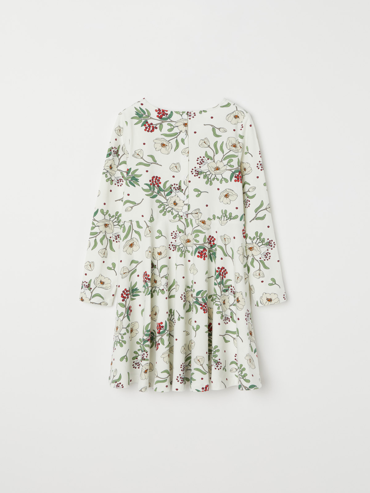 The dress has an allover floral print and fastens with a back placket.