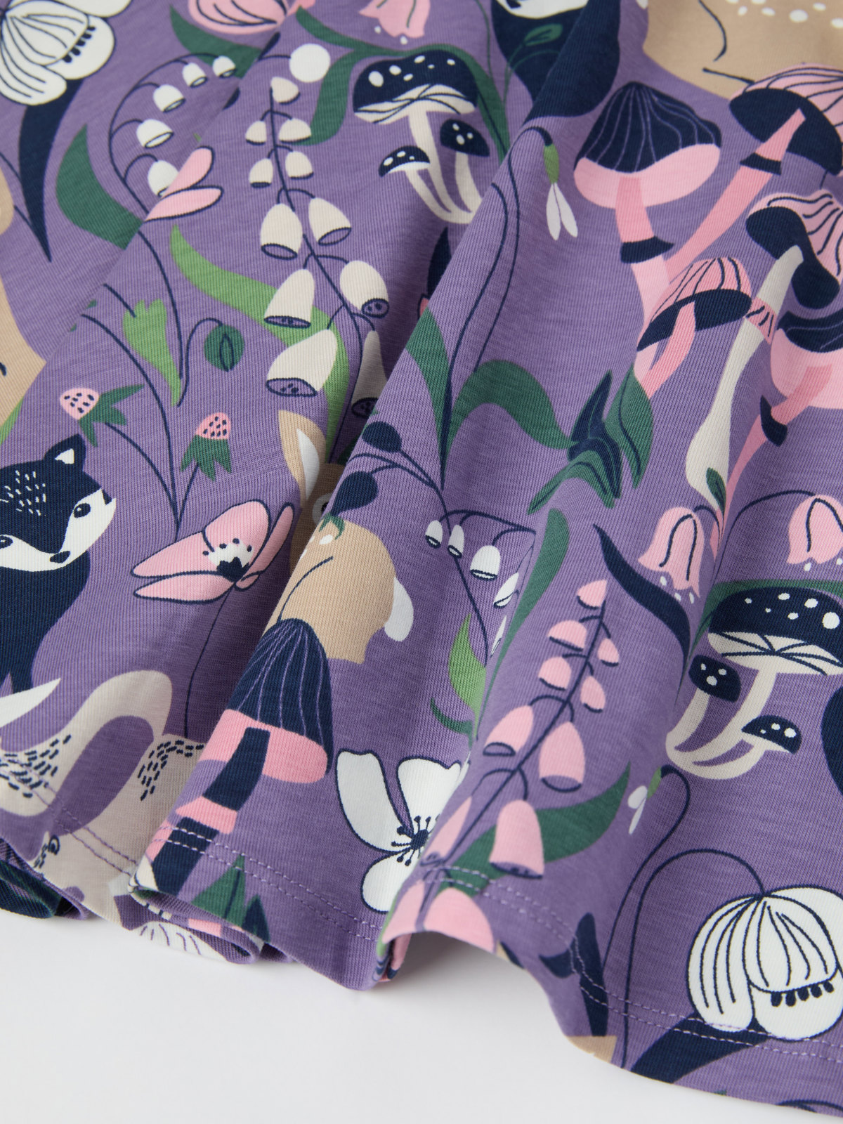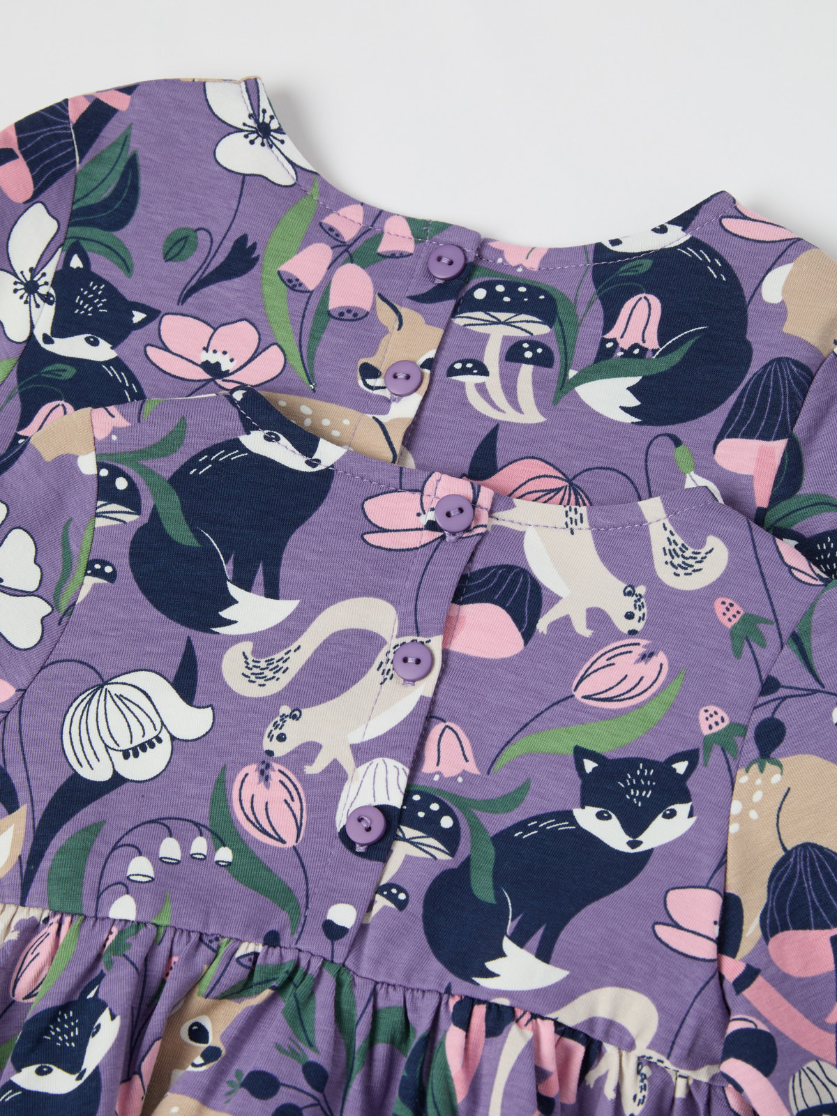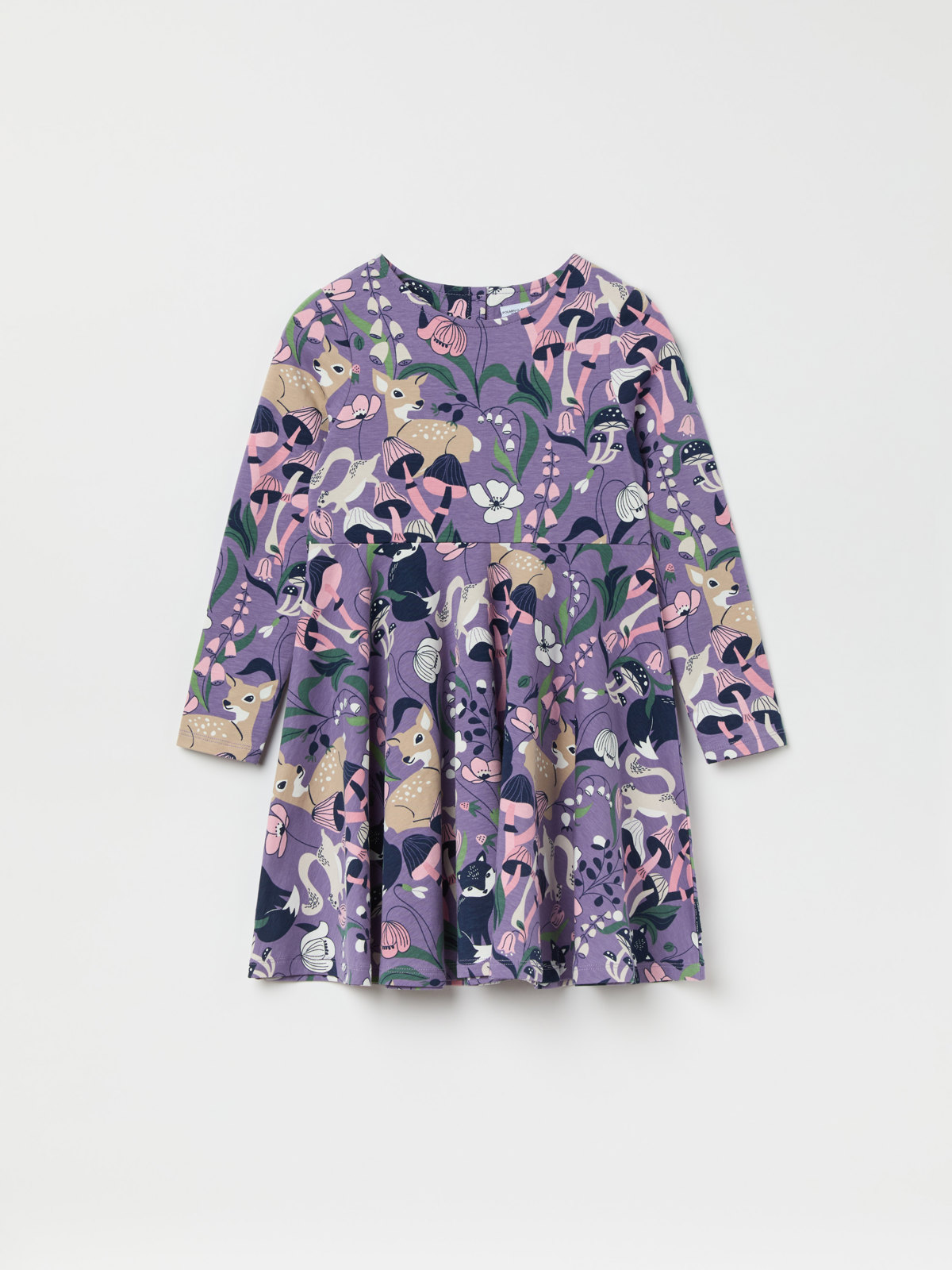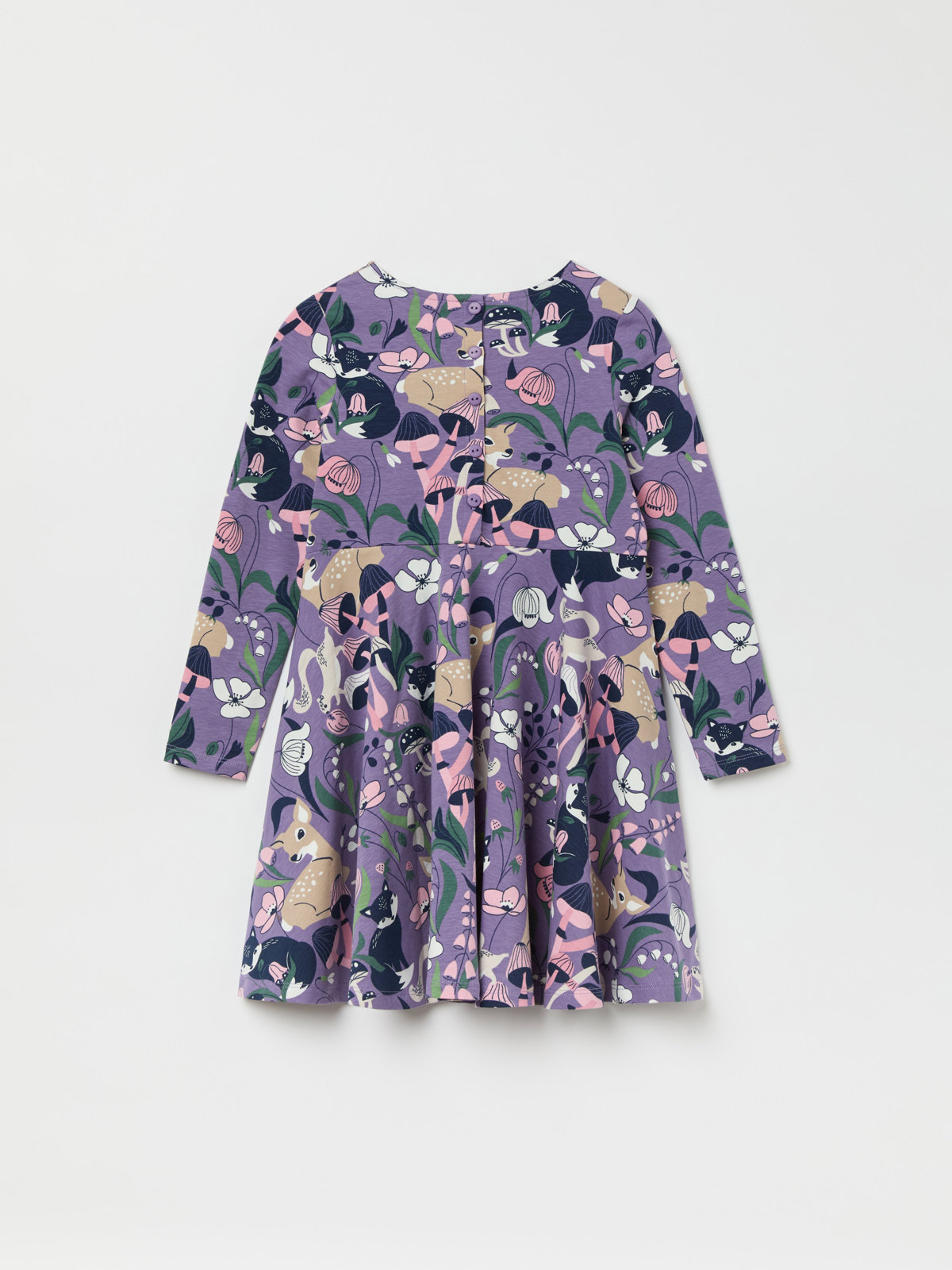 The dress features an allover forest and floral motif, and a back placket.