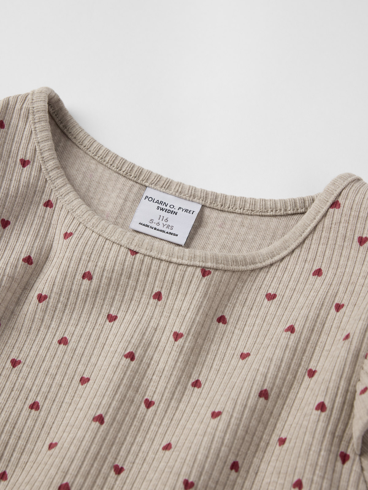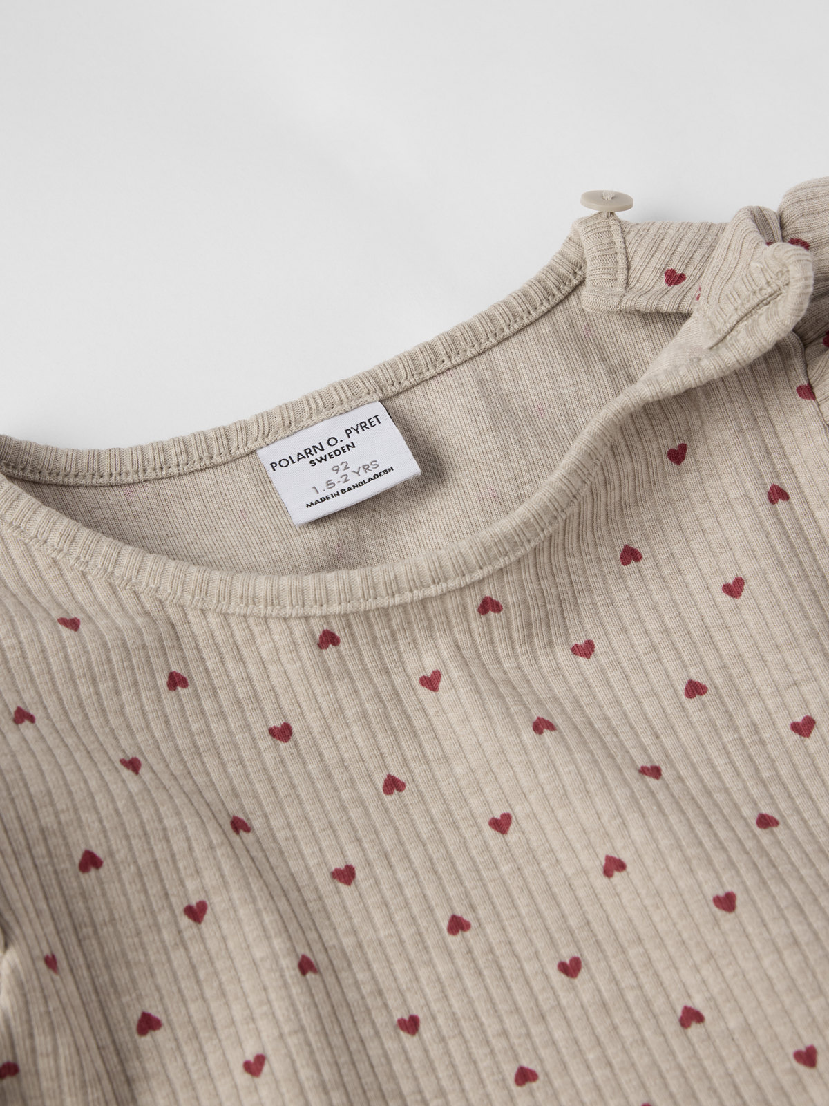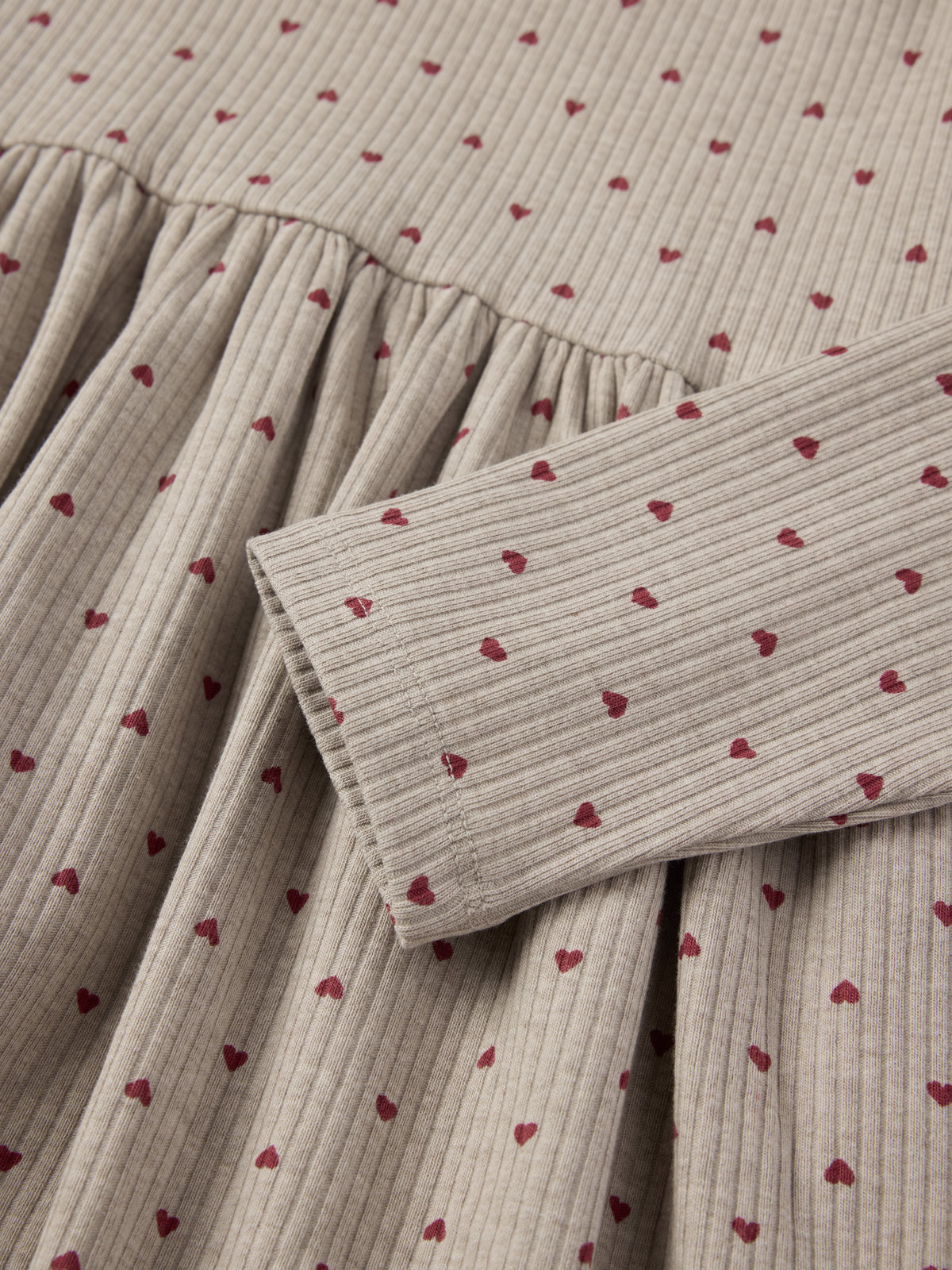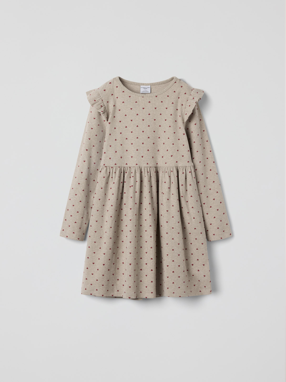 Soft ribbed baby dress in organic cotton. The dress is all-over printed with small hearts and decorated with delicate ruffles at the shoulders.