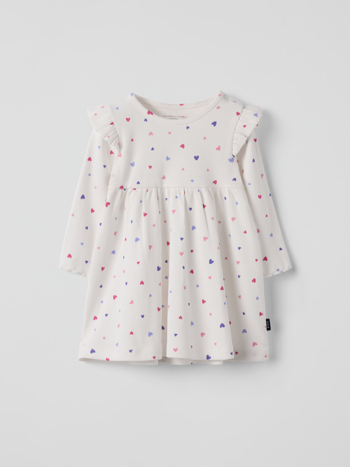 Soft ribbed baby dress in organic cotton. The dress is all-over printed with small hearts and decorated with delicate ruffles at the shoulders.