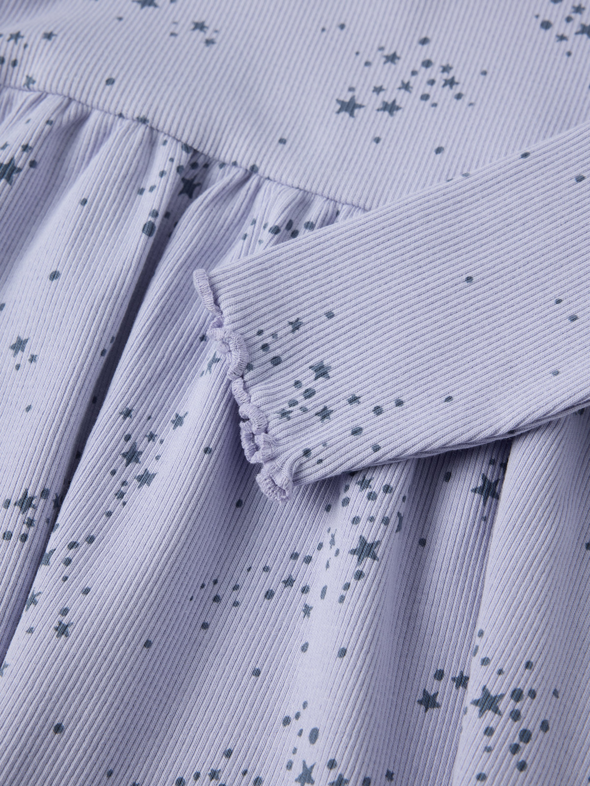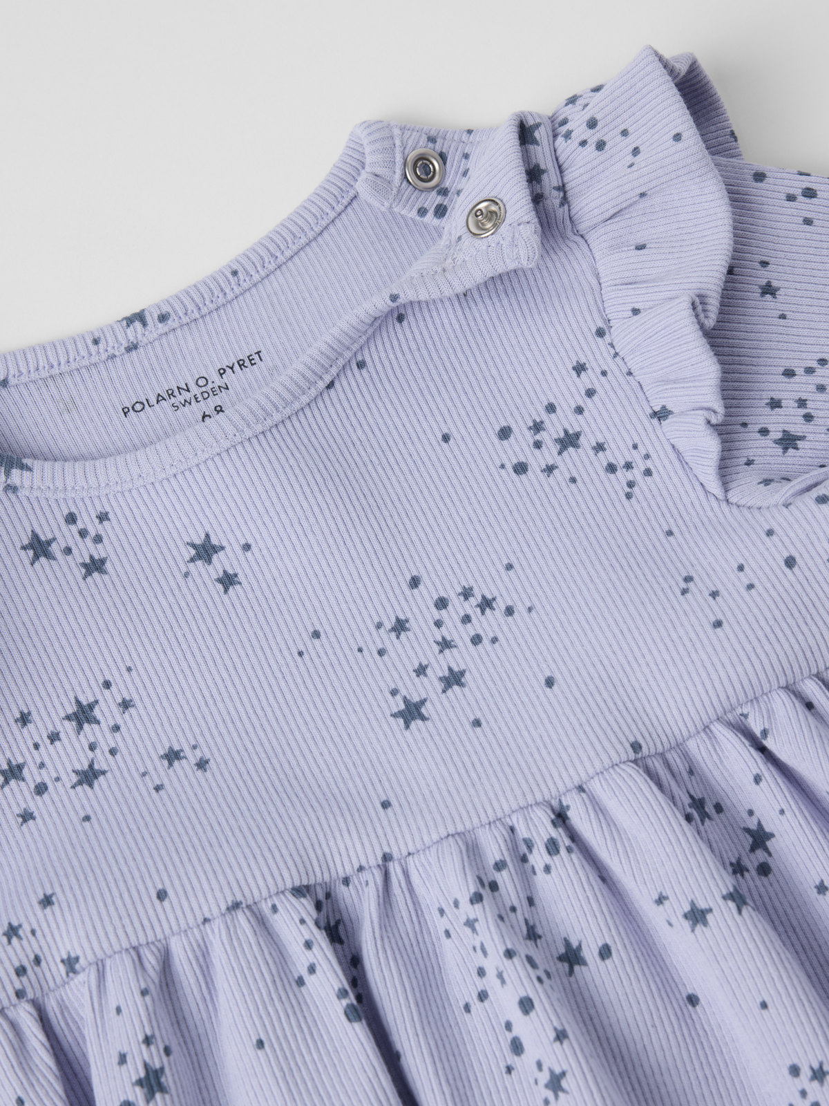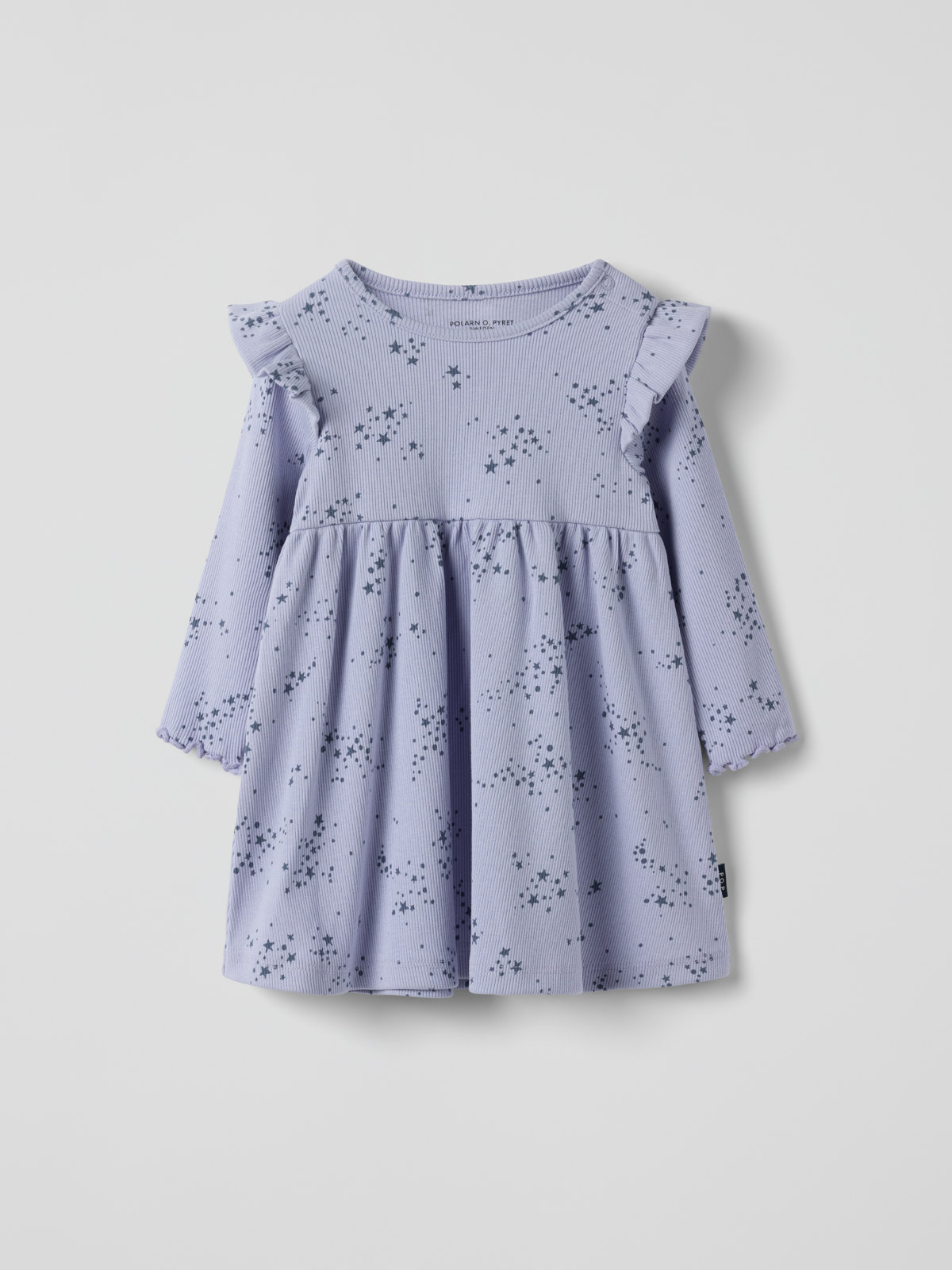 Soft ribbed baby dress in organic cotton. The dress is all-over printed and decorated with delicate ruffles at the shoulders.