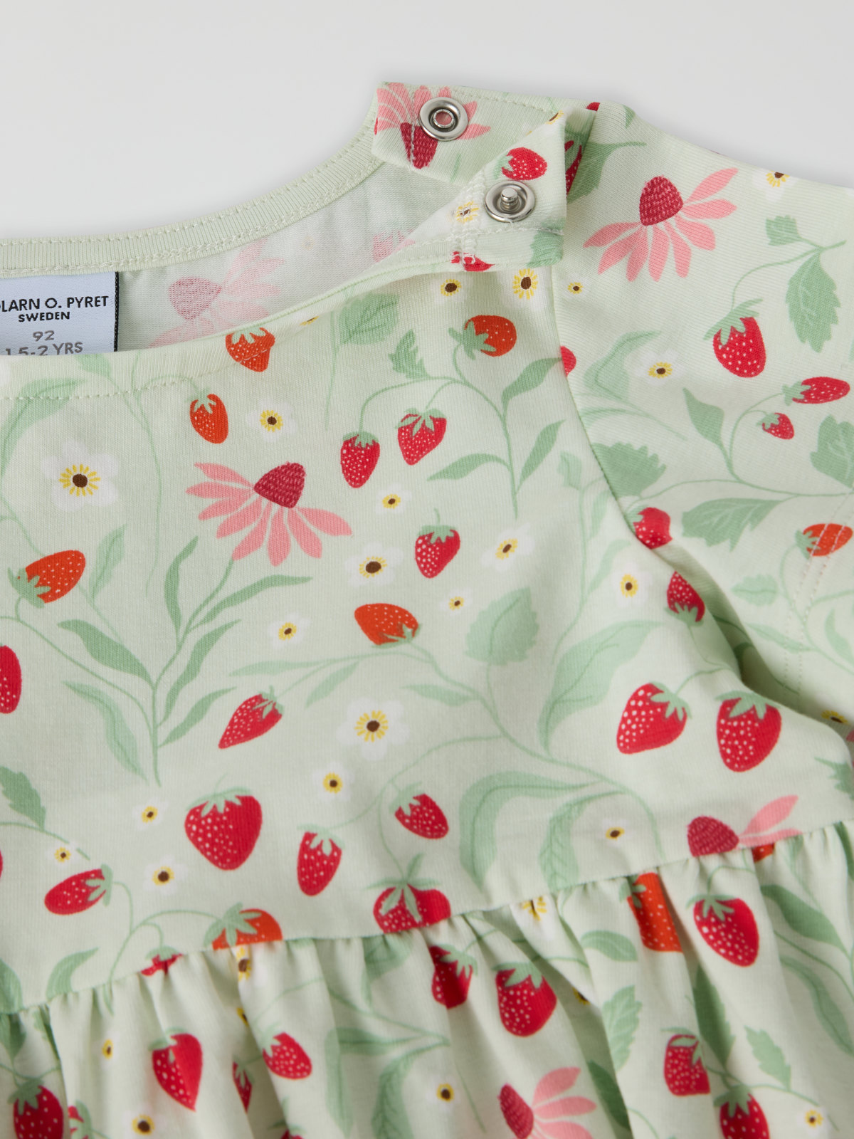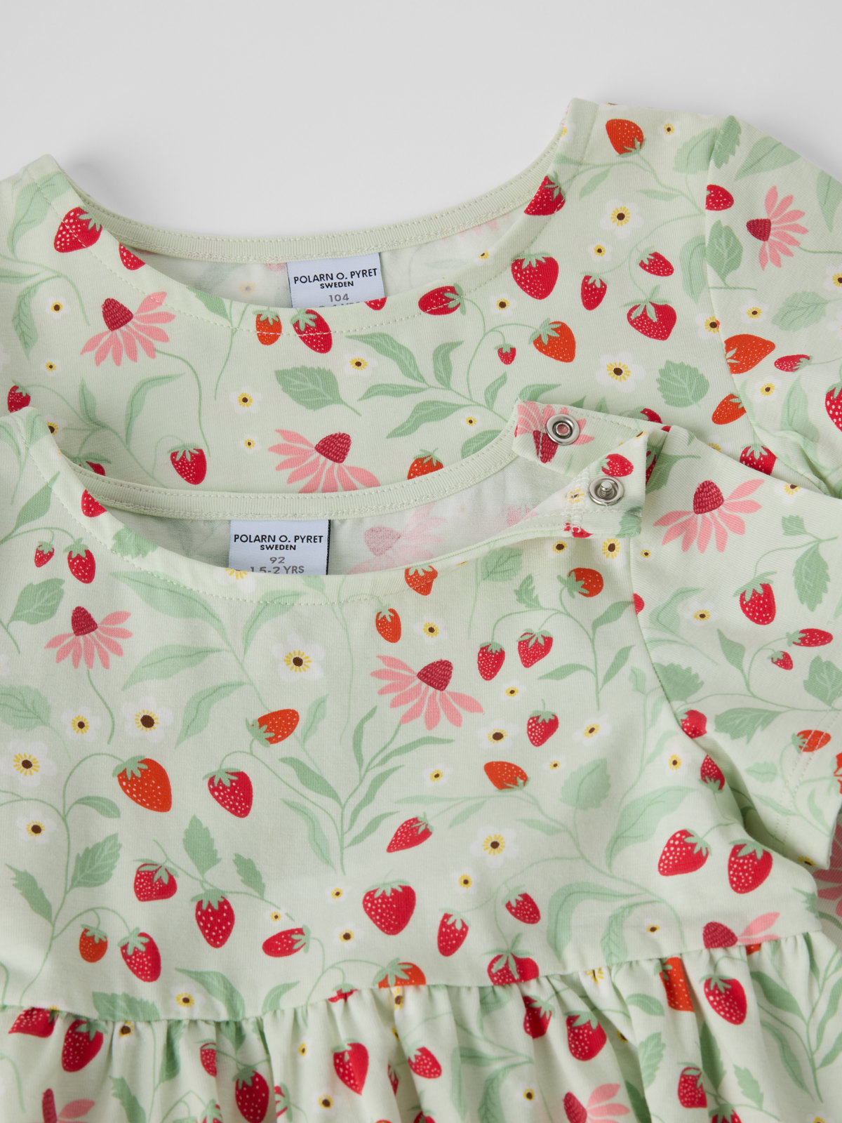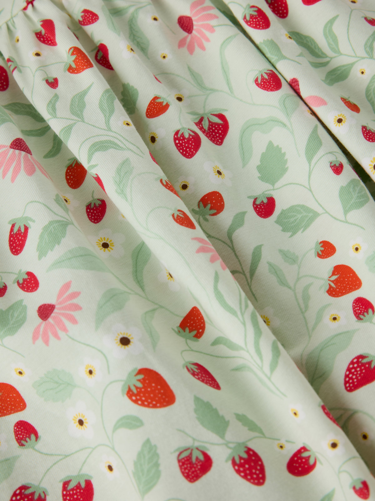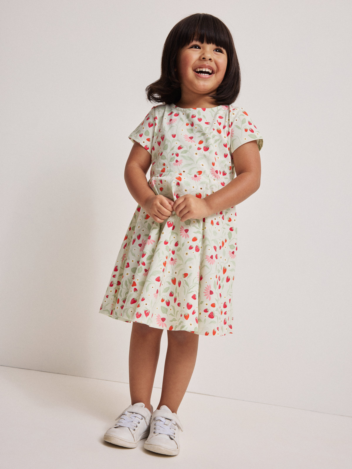 Short-sleeved twirl dress in soft organic cotton – a summer wardrobe favourite! This all-over strawberry design features a full skirt that flares beautifully when you spin. Fastens with a button placket at the back.