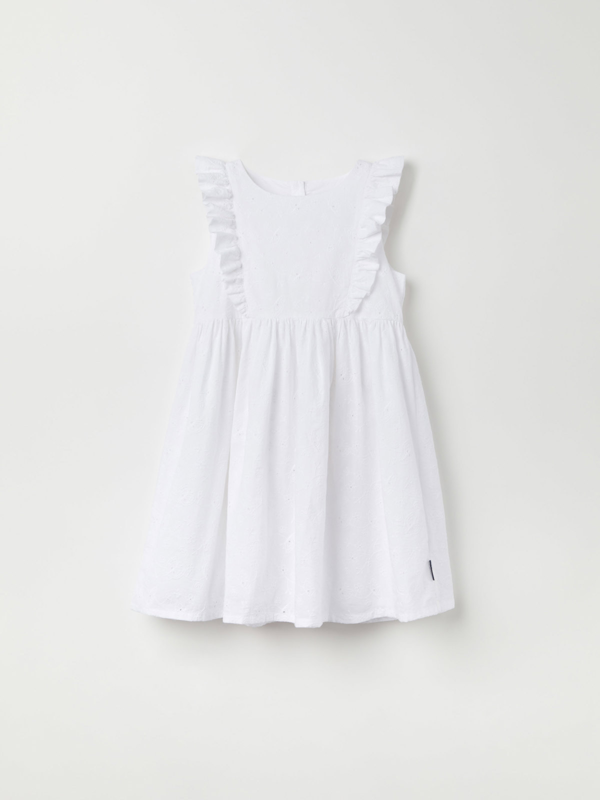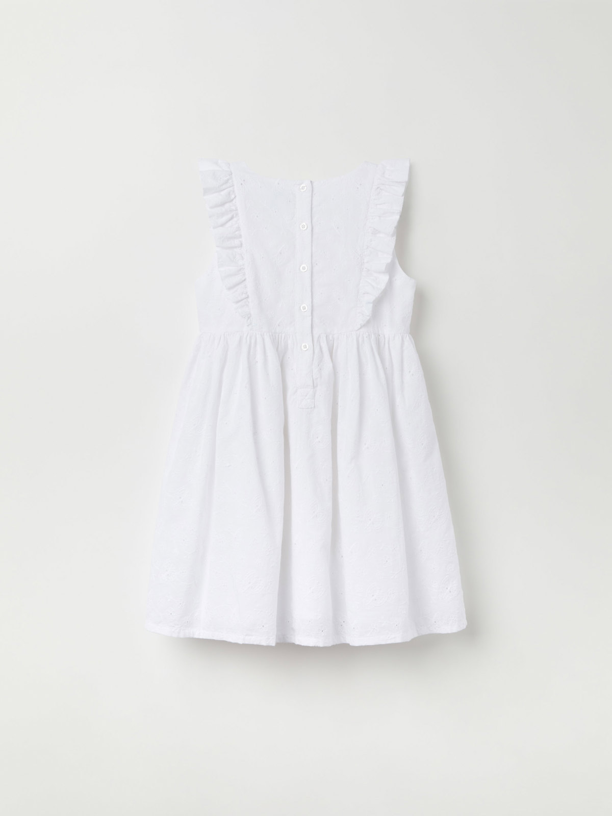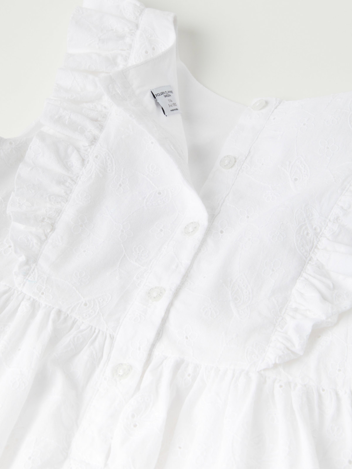 It also features ruffles at the front that continue over the shoulders, and a back placket.