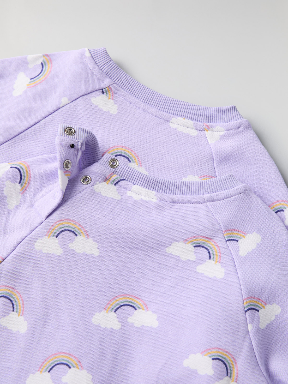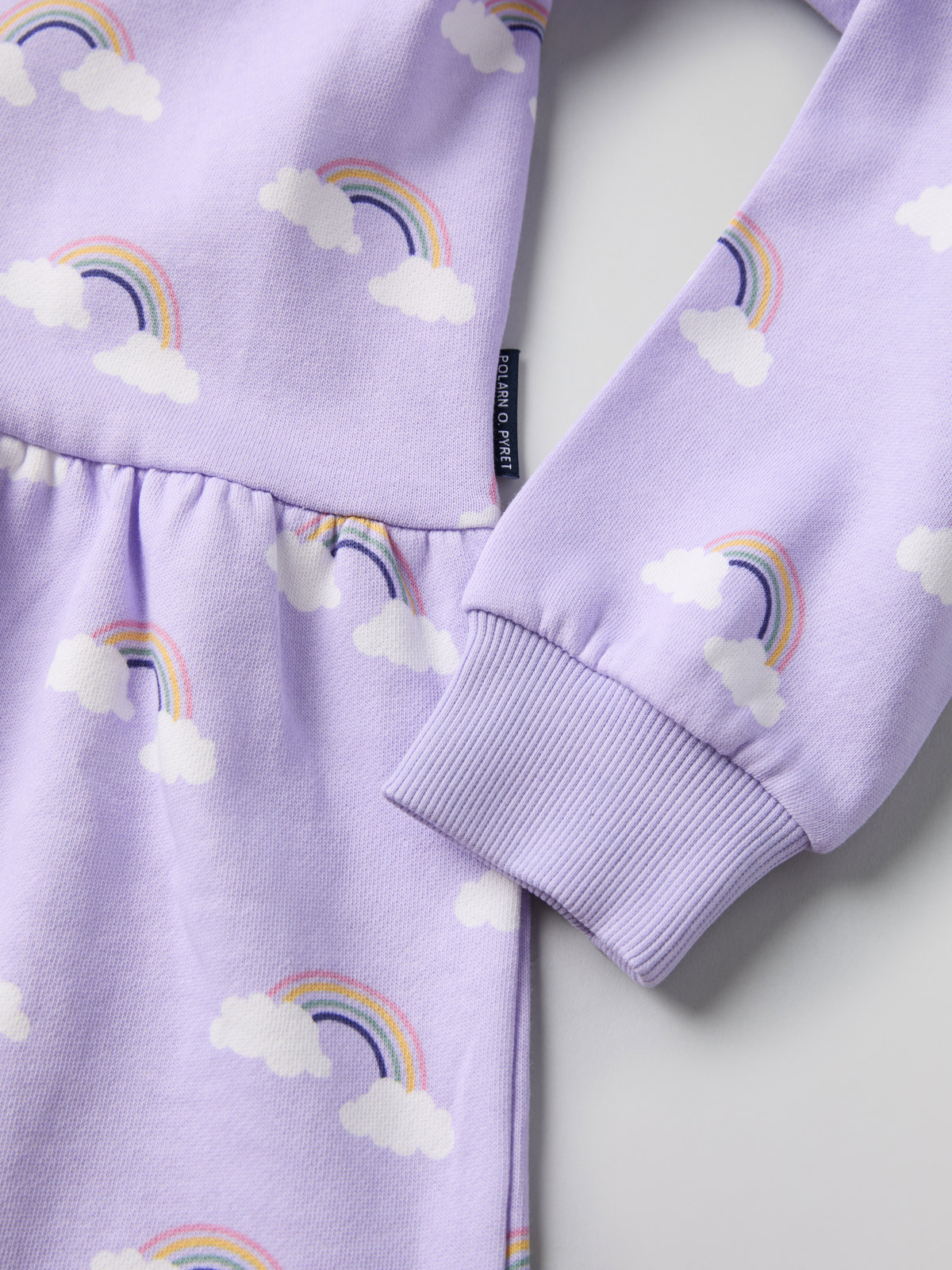 The dress features an allover rainbow print, a ribbed neckline and cuffs, and a gathered skirt.