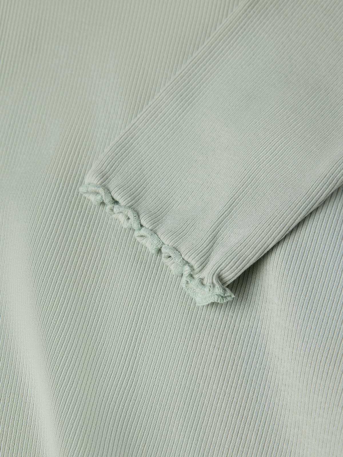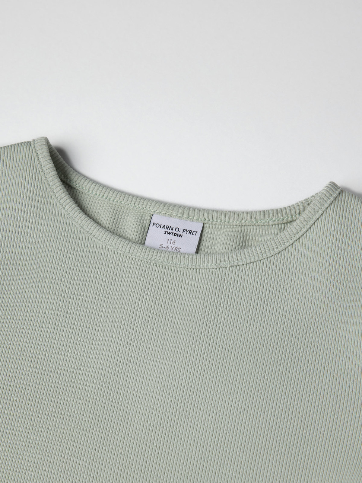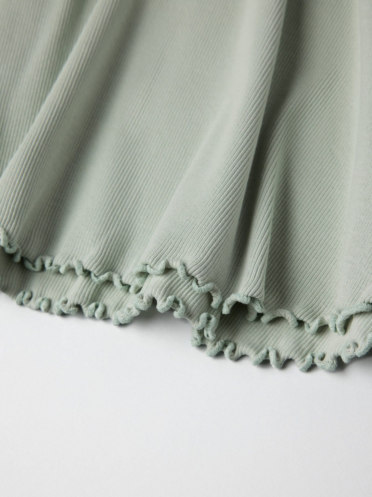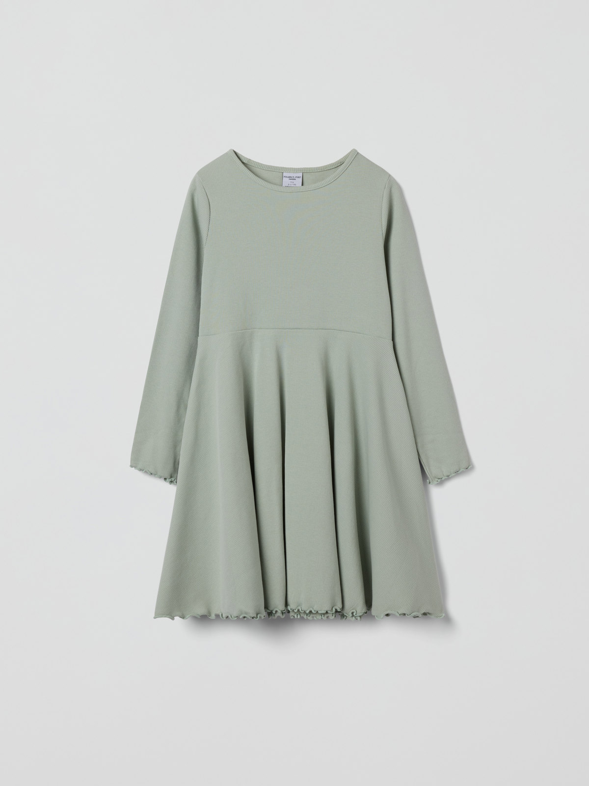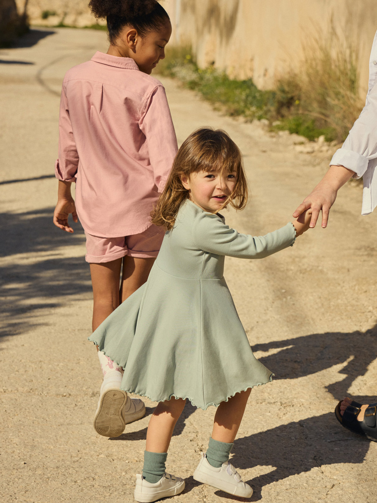 This dress is a must-have in a child’s wardrobe! It is made of soft, ribbed cotton jersey and features a generous twirl skirt. The dress has a cute lettuce trim at the hem and cuffs.