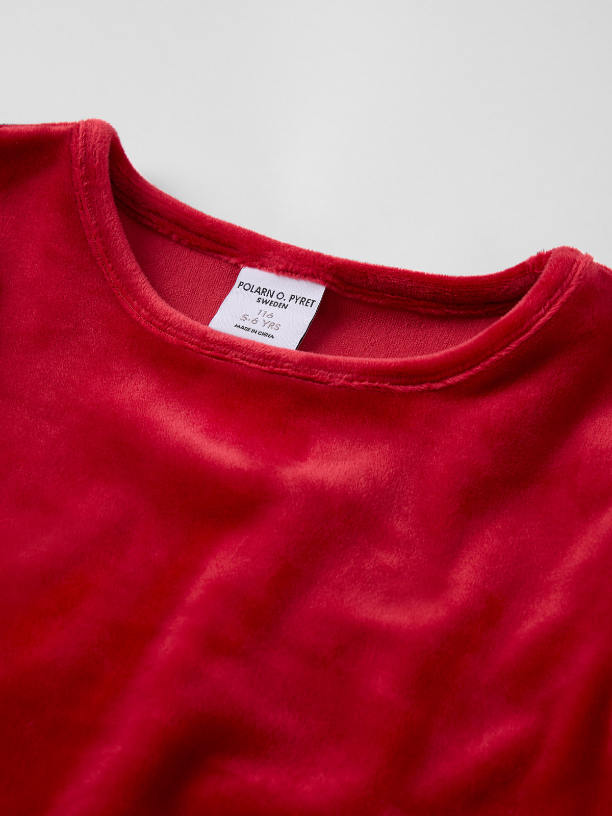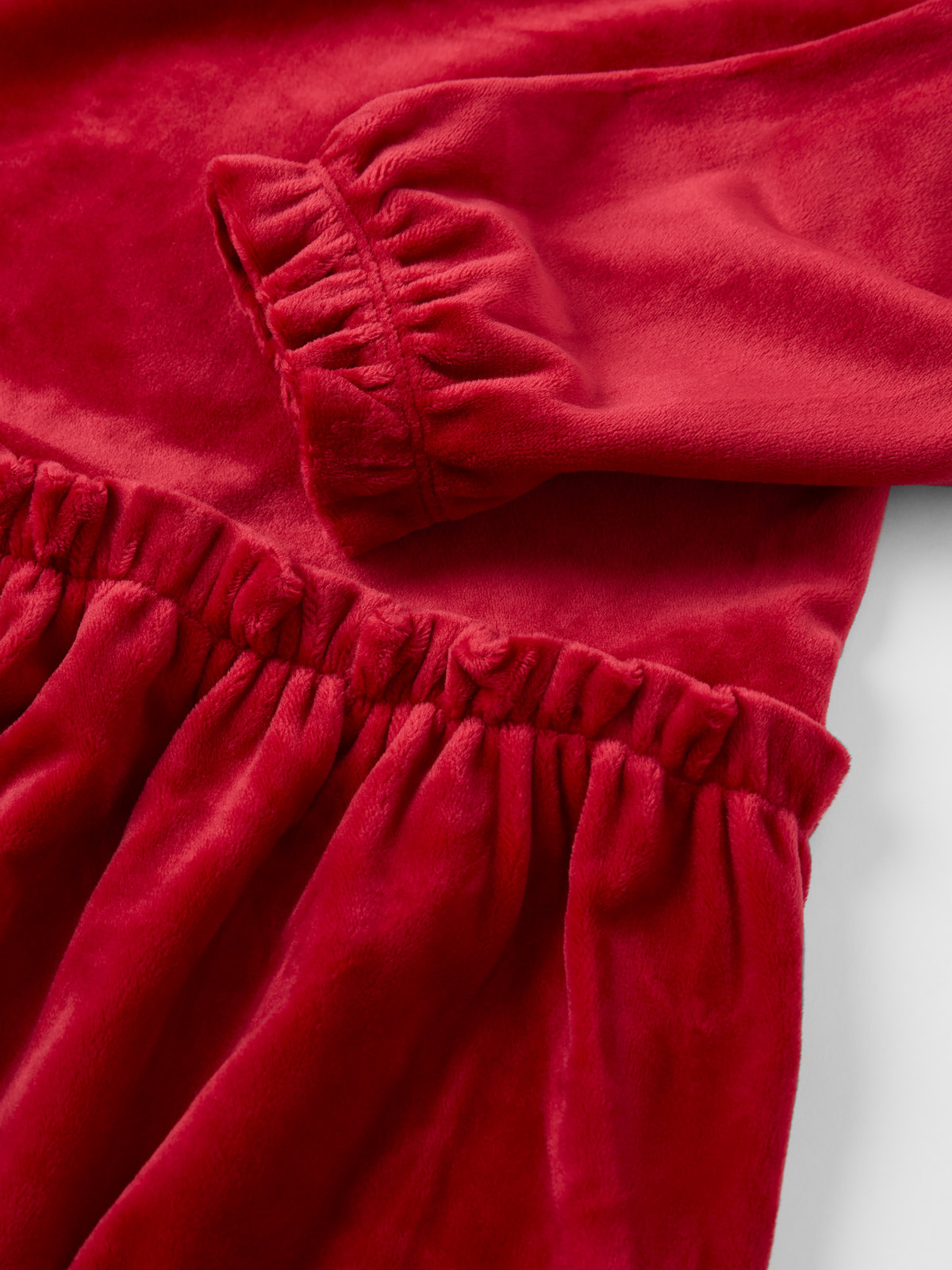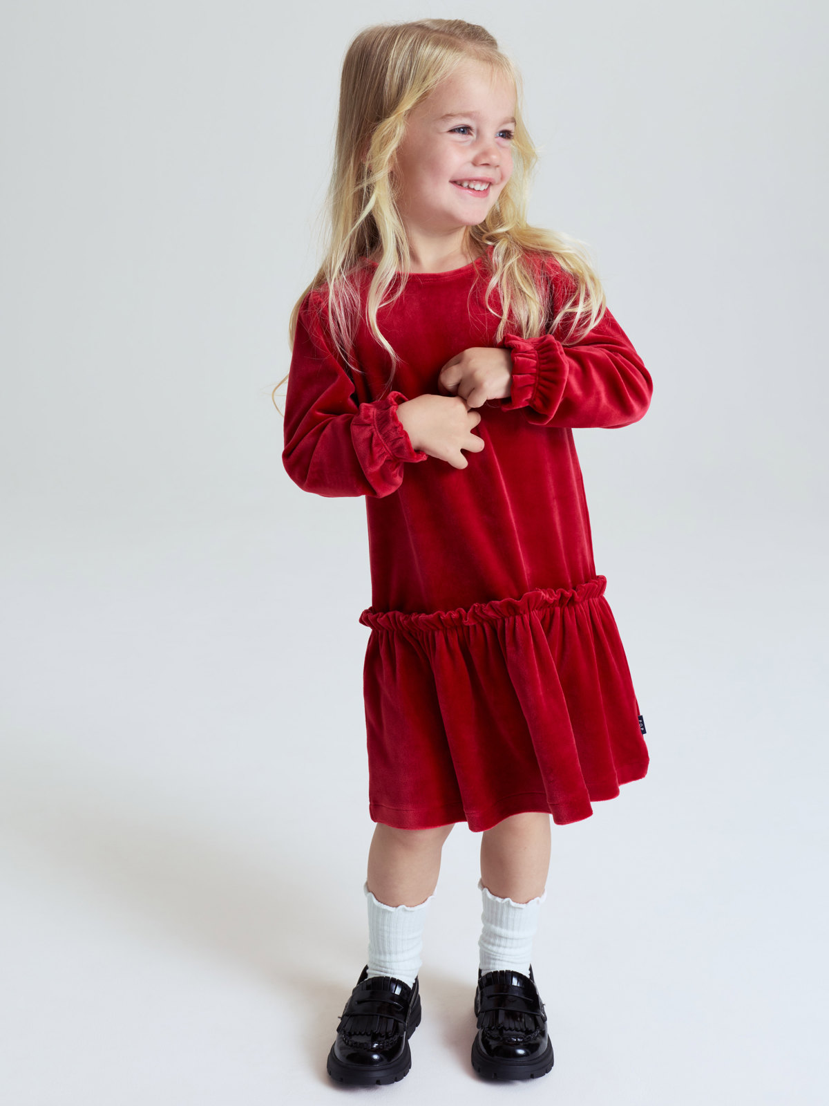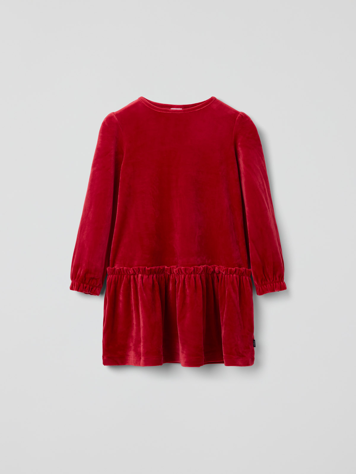 Dress in soft velour made from recycled polyester. This dress features a low waist with ruffle, gathered skirt, and elastic sleeves with soft ruffles.