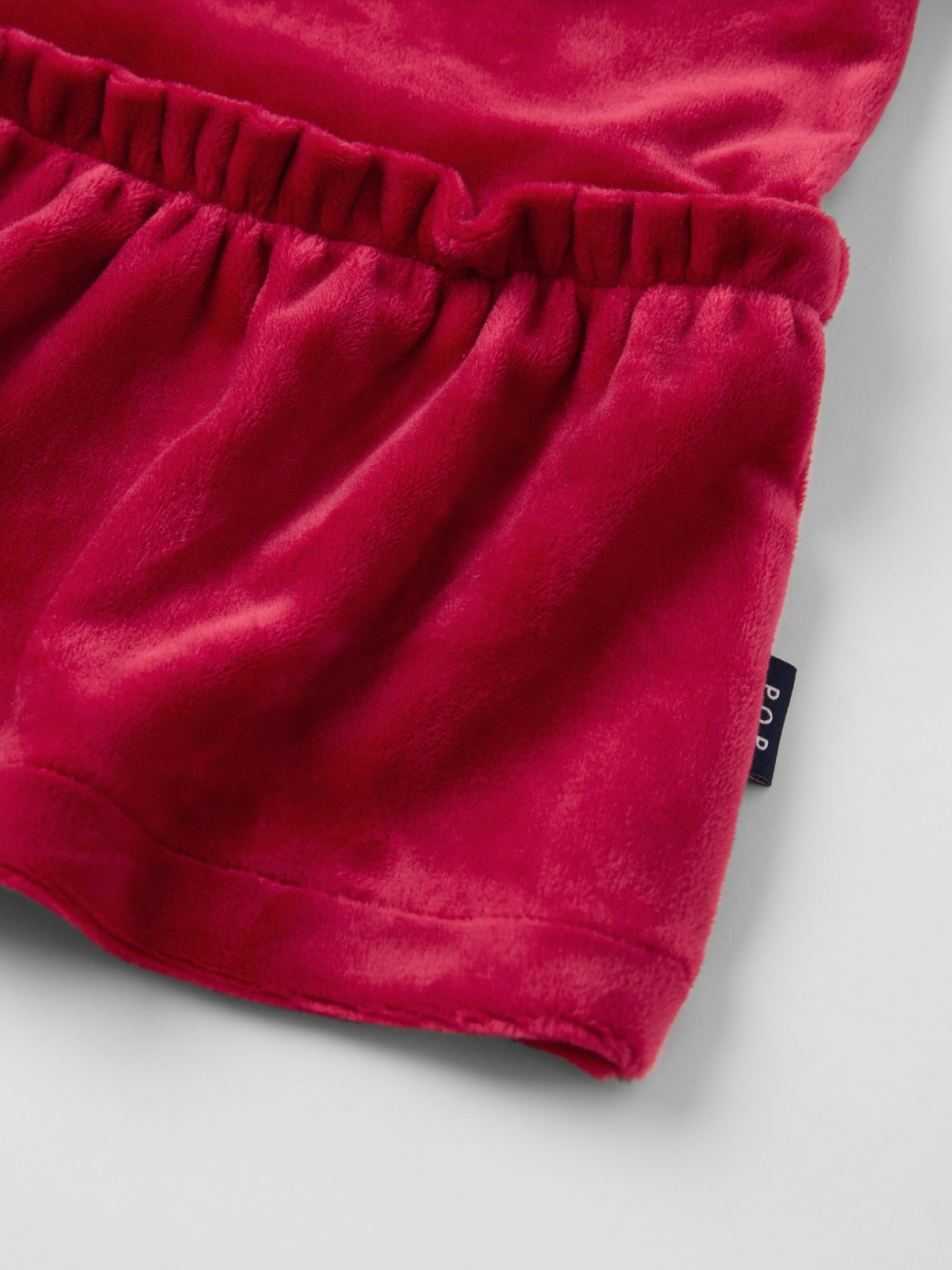 Dress in soft velour made from recycled polyester for baby. The dress features a low waist with a ruffle, gathered skirt, and elastic sleeves with soft ruffles. Closes with buttons on one shoulder.