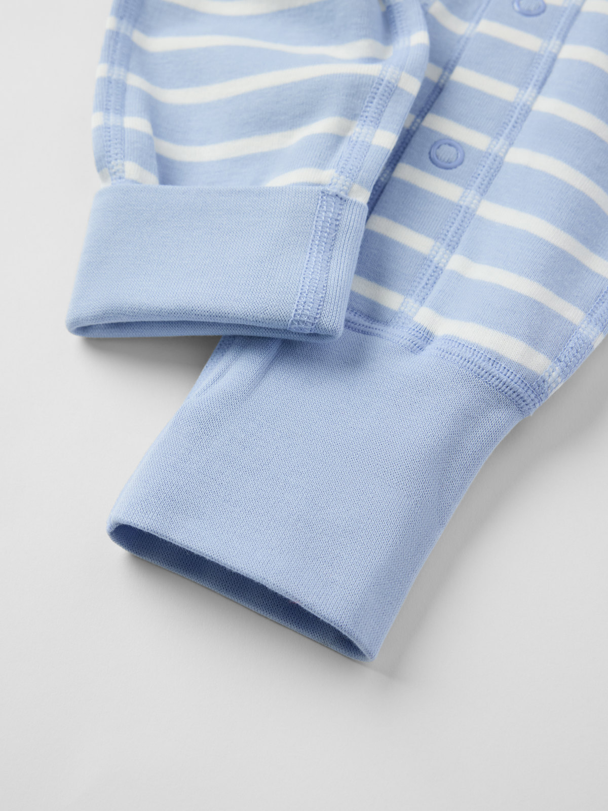 Our classic striped overall in soft organic cotton – perfect as both pyjamas and loungewear! This overall has extra-soft, flat seams that are gentle on sensitive skin. The cuffs at the sleeve and legs are extra long and can be folded down as your little one grows. The neck-to-ankle poppers facilitate dressing.