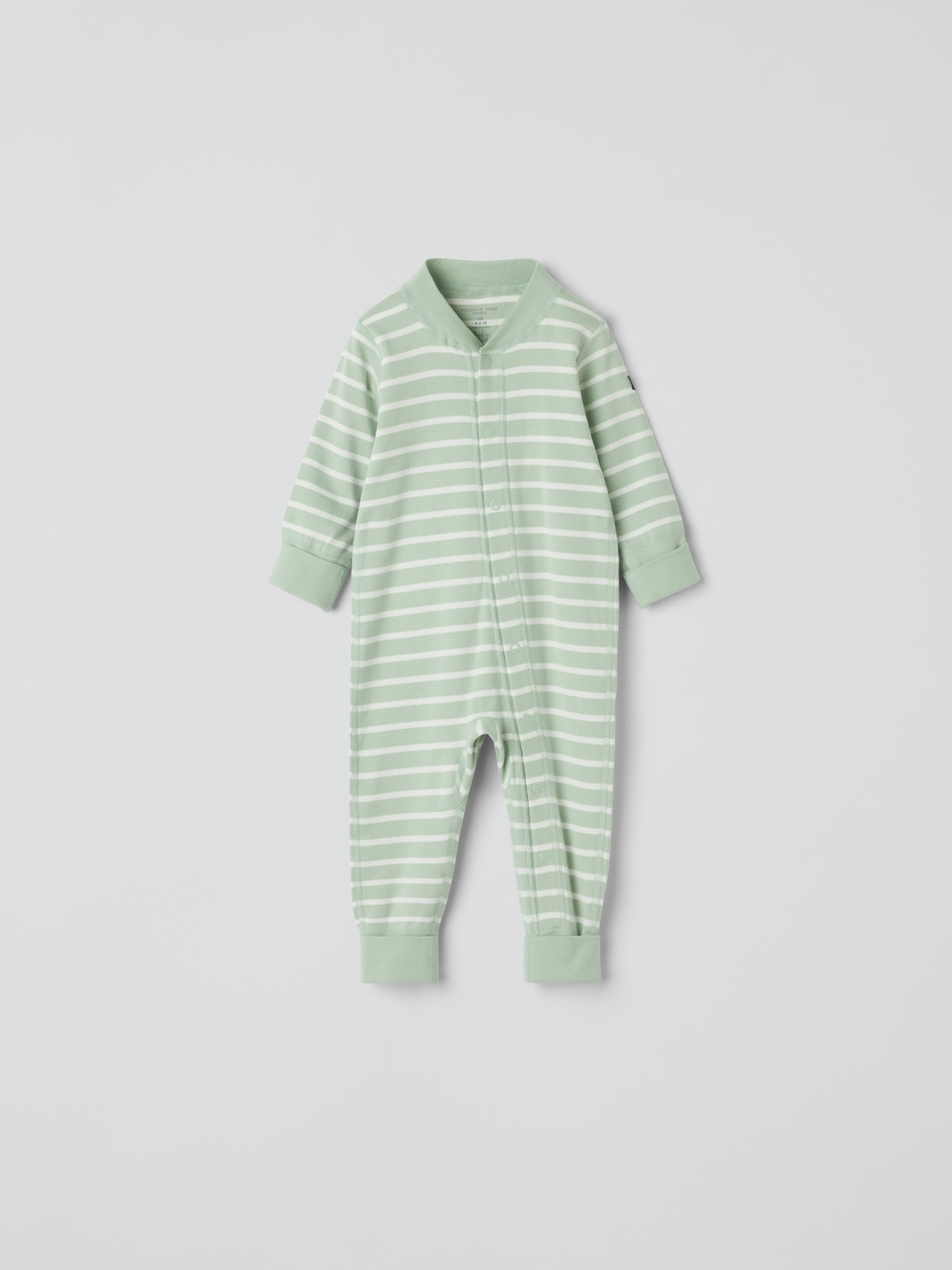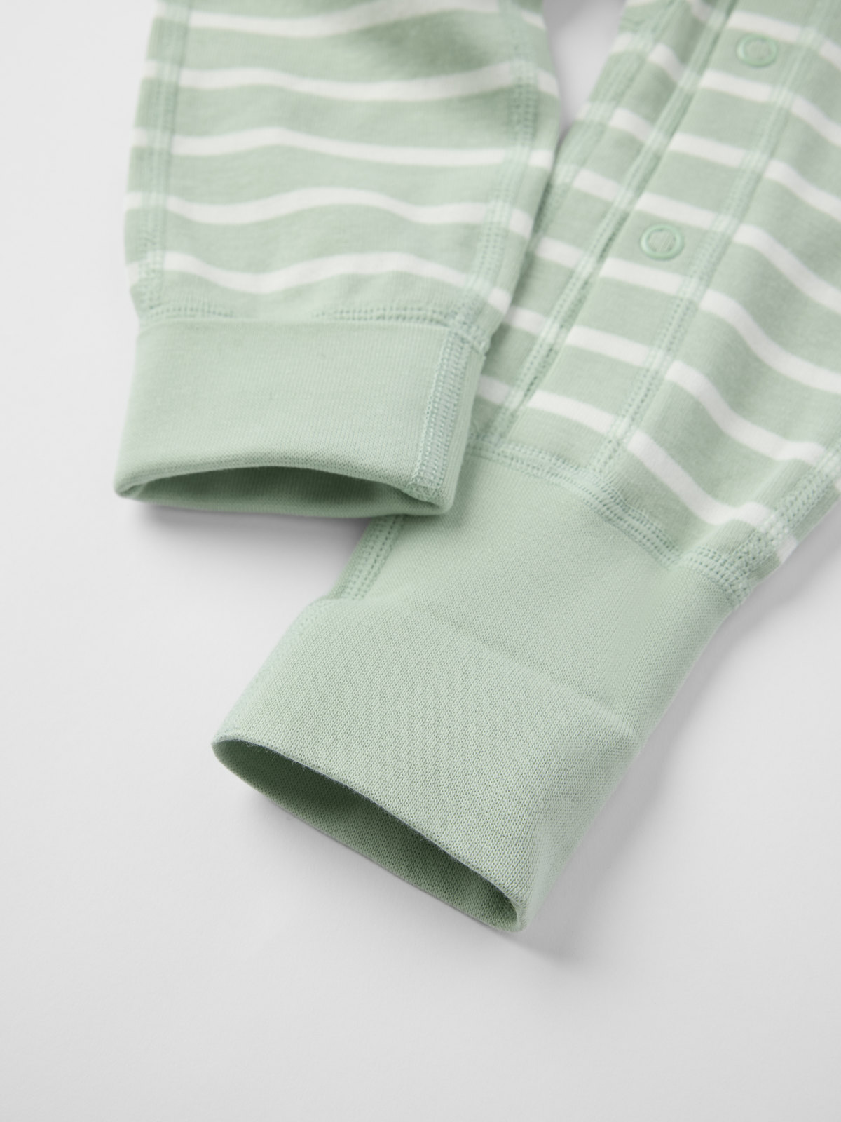 Our classic striped overall in soft organic cotton – perfect as both pyjamas and loungewear! This overall has extra-soft, flat seams that are gentle on sensitive skin. The cuffs at the sleeve and legs are extra long and can be folded down as your little one grows. The neck-to-ankle poppers facilitate dressing.