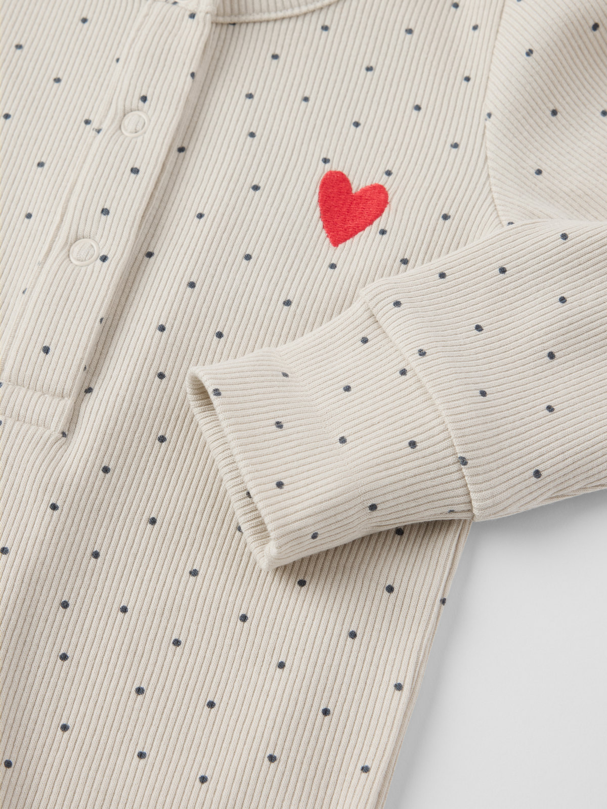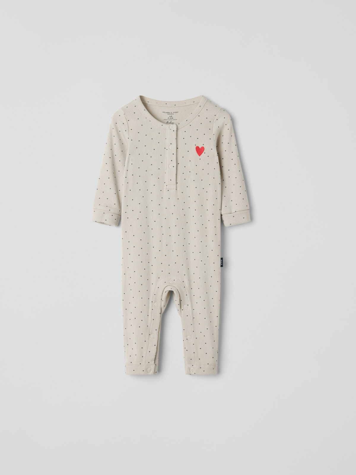 Ribbed jumpsuit in a soft blend of Tencel™ lyocell and organic cotton. The fabric mix feels cool, comfortable and gentle on sensitive skin. The jumpsuit features soft cuffs at the sleeves for a snug fit and a short button placket at the front. It also has a small embroidered heart on the chest.
